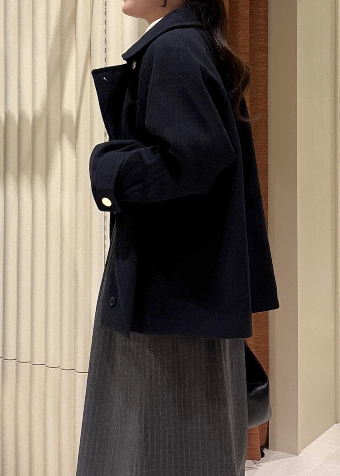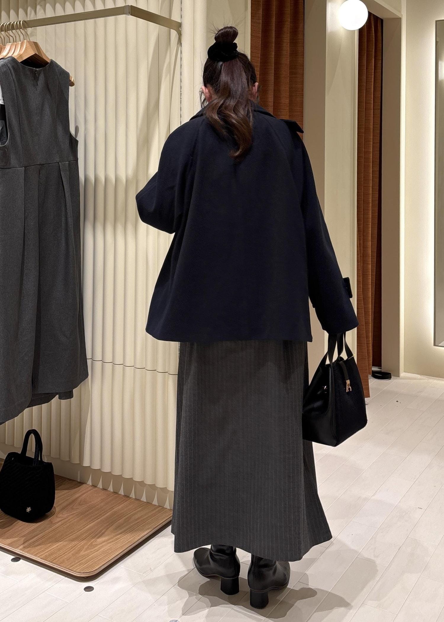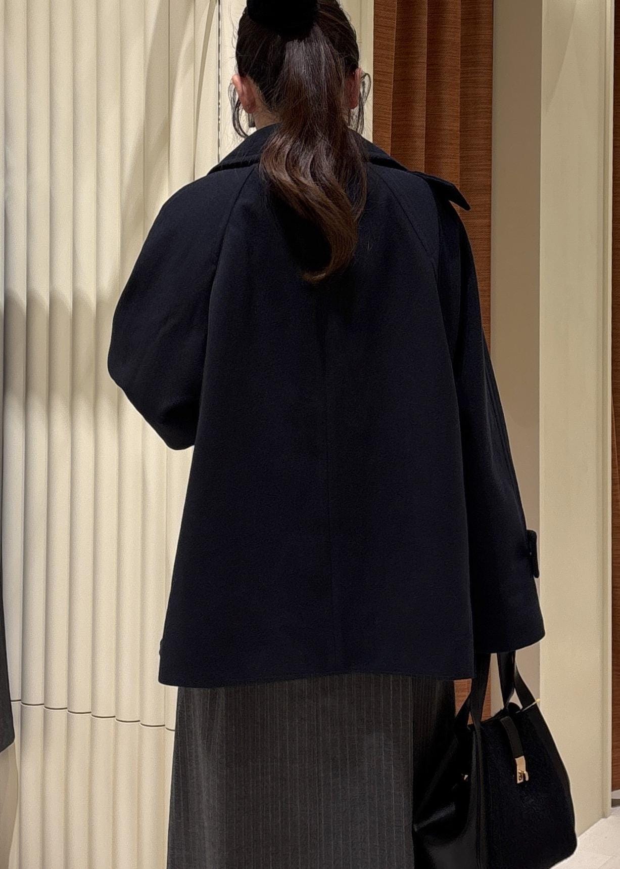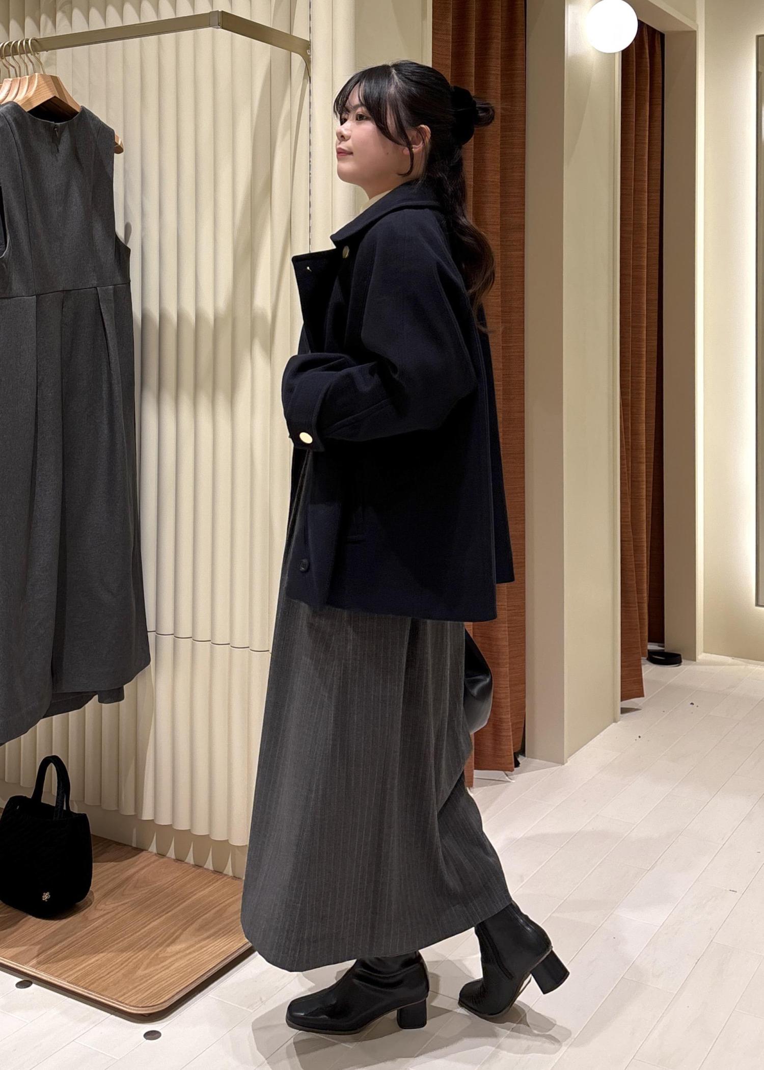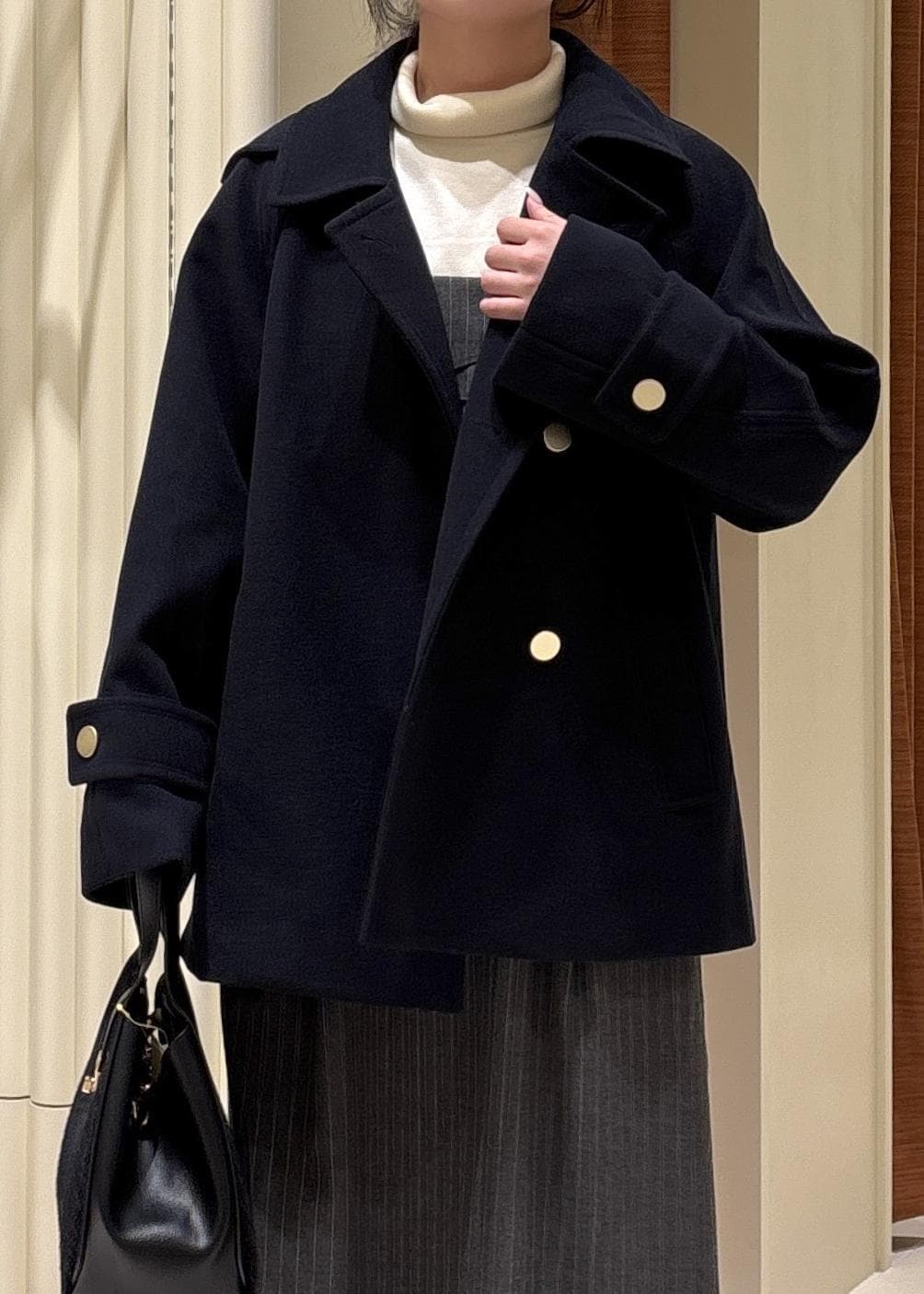 ROPÉ PICNICジャージーメルトンシリーズ 金ボタンミドル丈コート/リンクコーデネイビー / F¥7,692レビュー柔らかで温かみのある素材感で、とても軽い着心地。161cm/Fサイズ着用でヒップがほぼ全て隠れるくらいの着丈がありました。身幅や袖の筒周りもしっかりゆとりがあり、厚手のニットも着込めそうです。