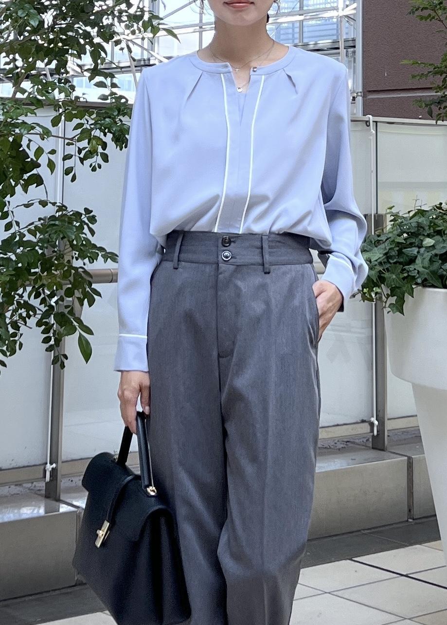 オフィスカジュアルで着られるブラウスは、淡いブルーで秋冬にも華やかに。