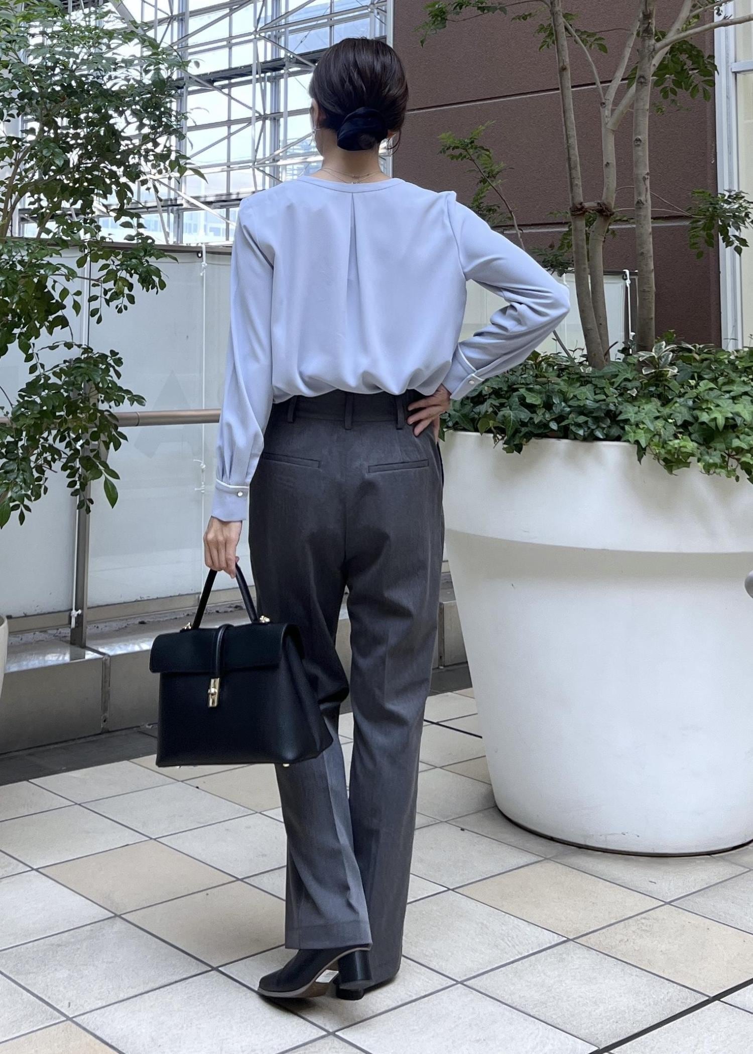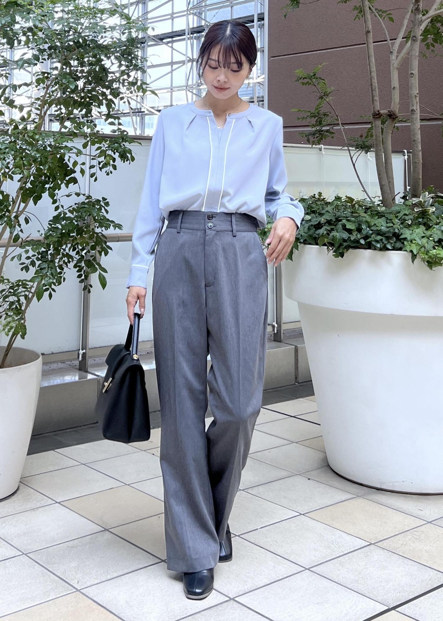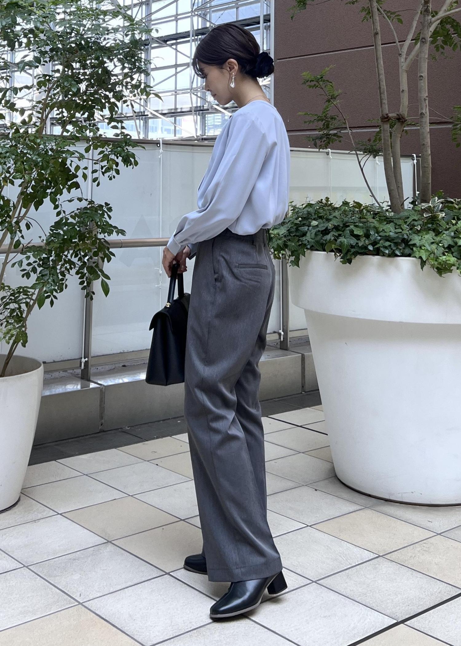 グレーのスラックスを合わせて、きちんと感のあるきれいめスタイルにまとめました。