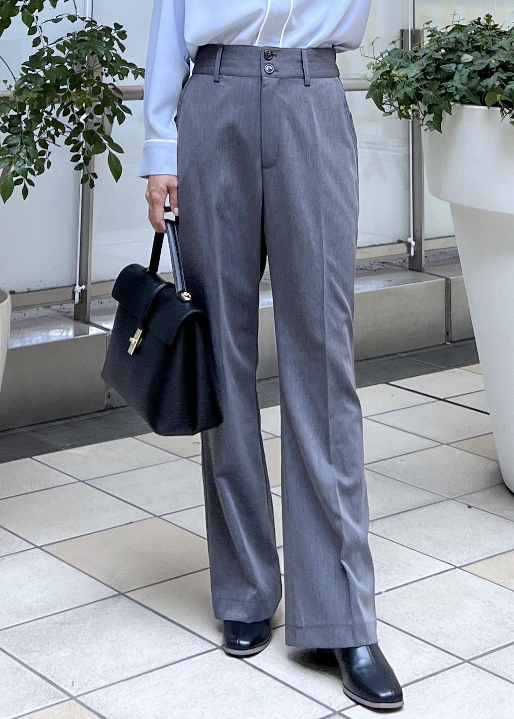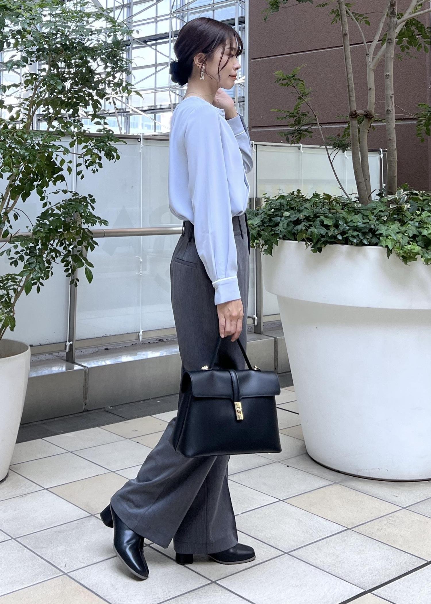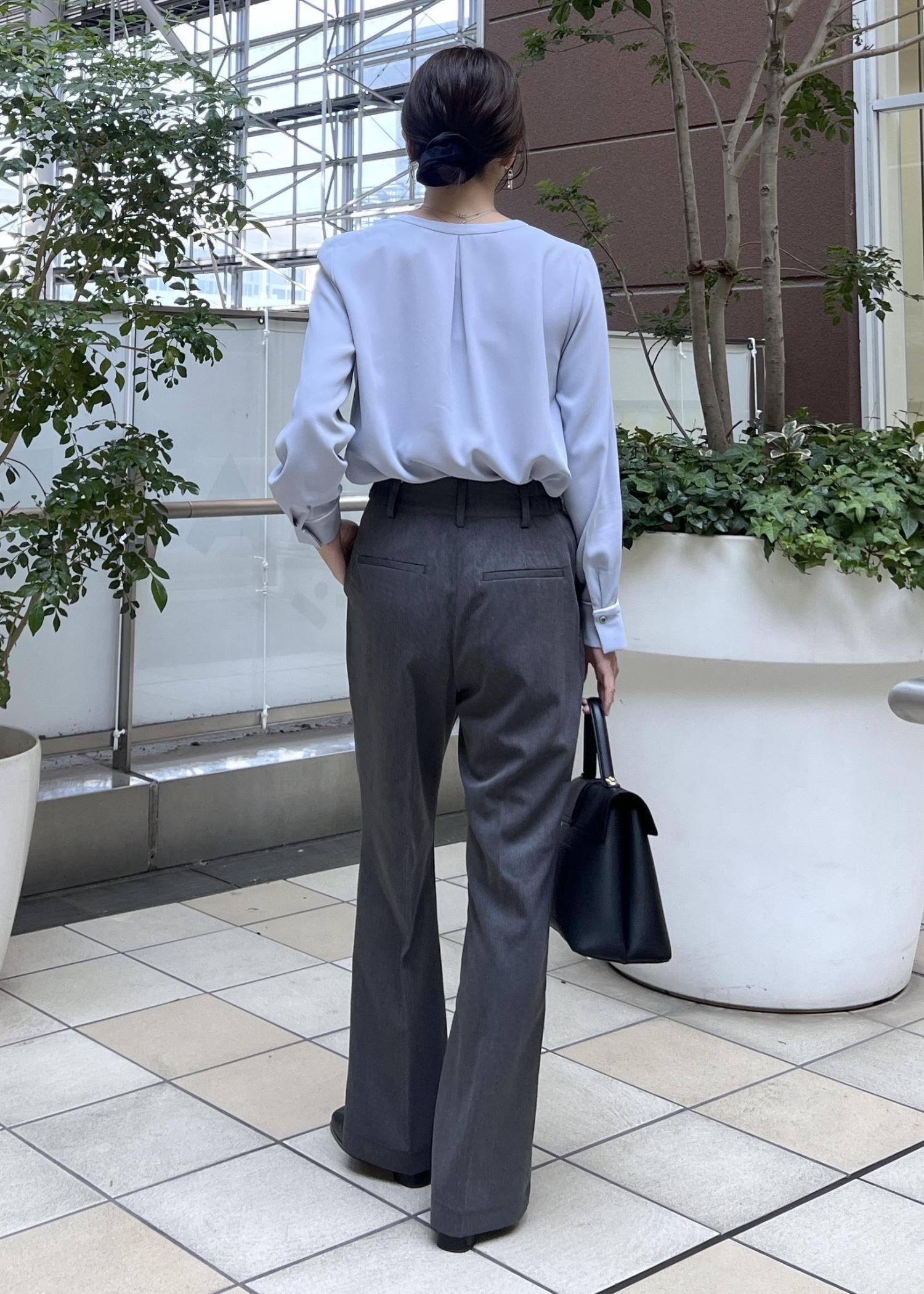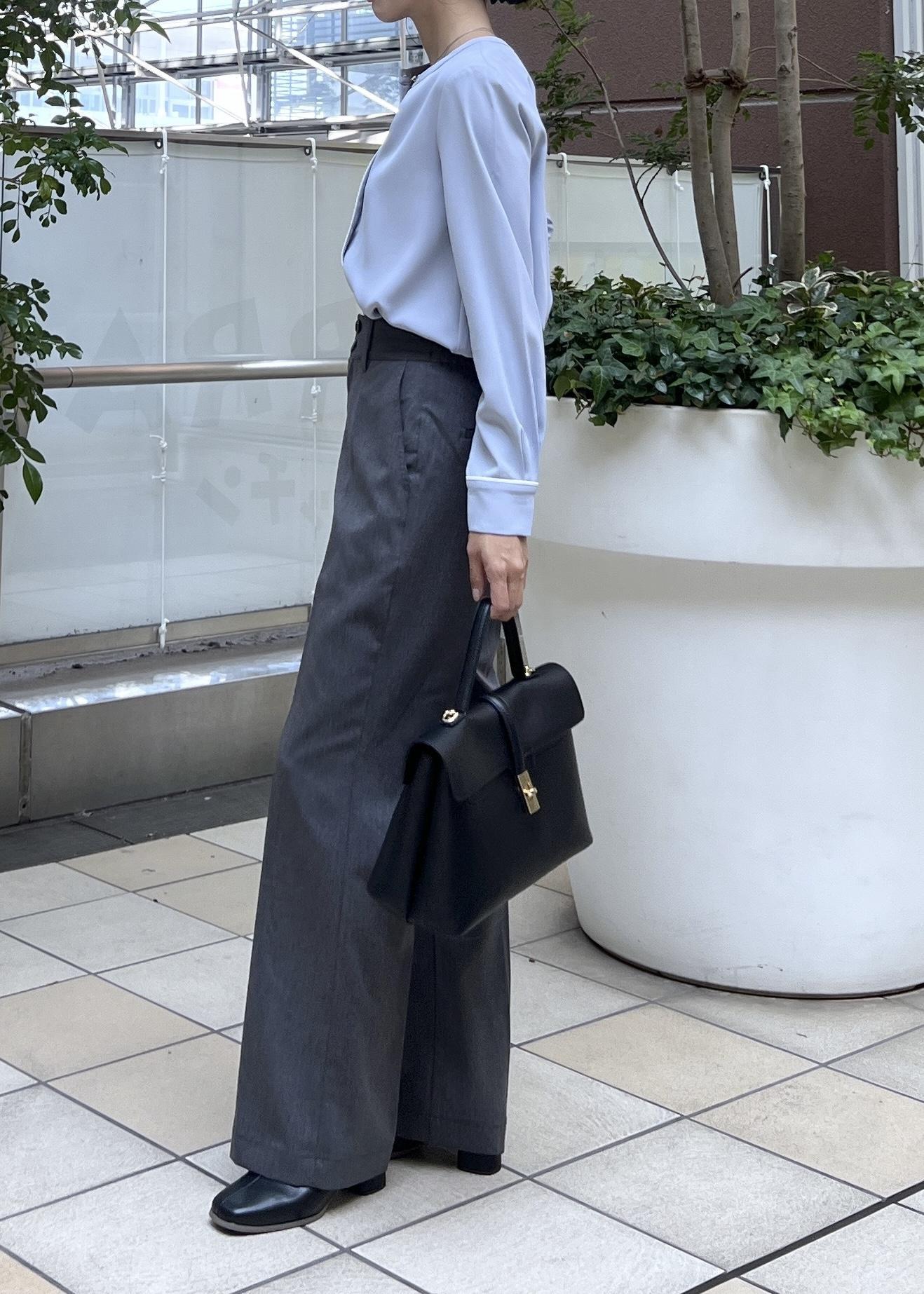 グレーのスラックスを合わせて、きちんと感のあるきれいめスタイルにまとめました。