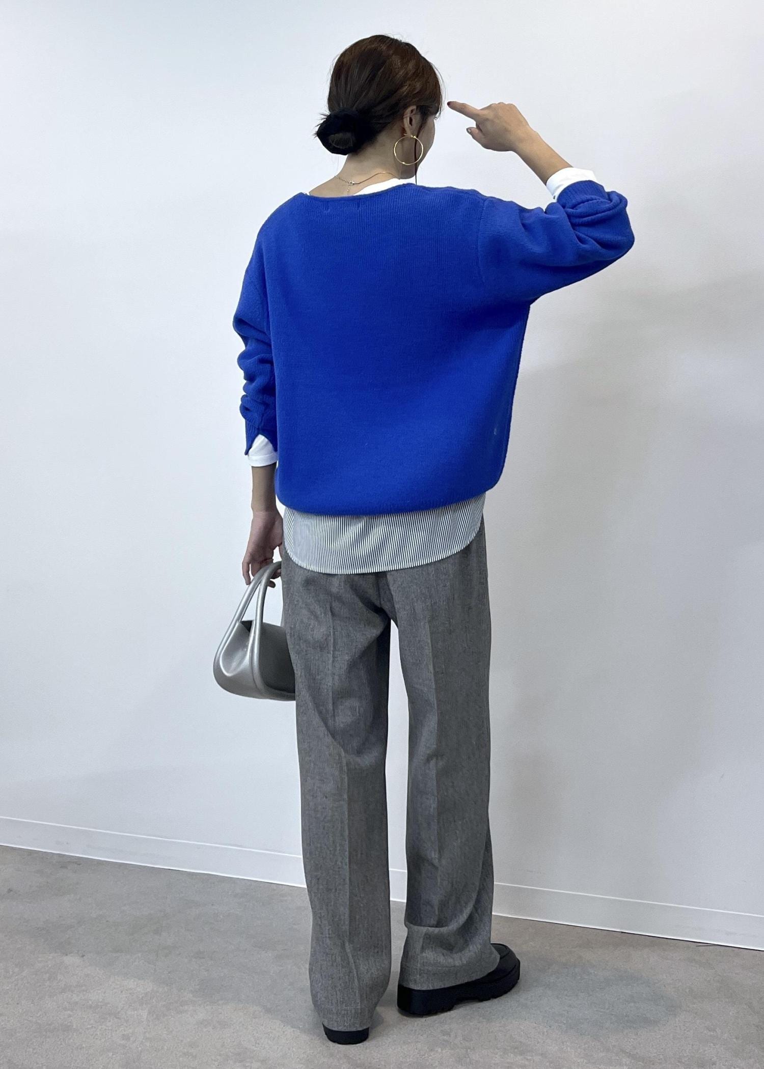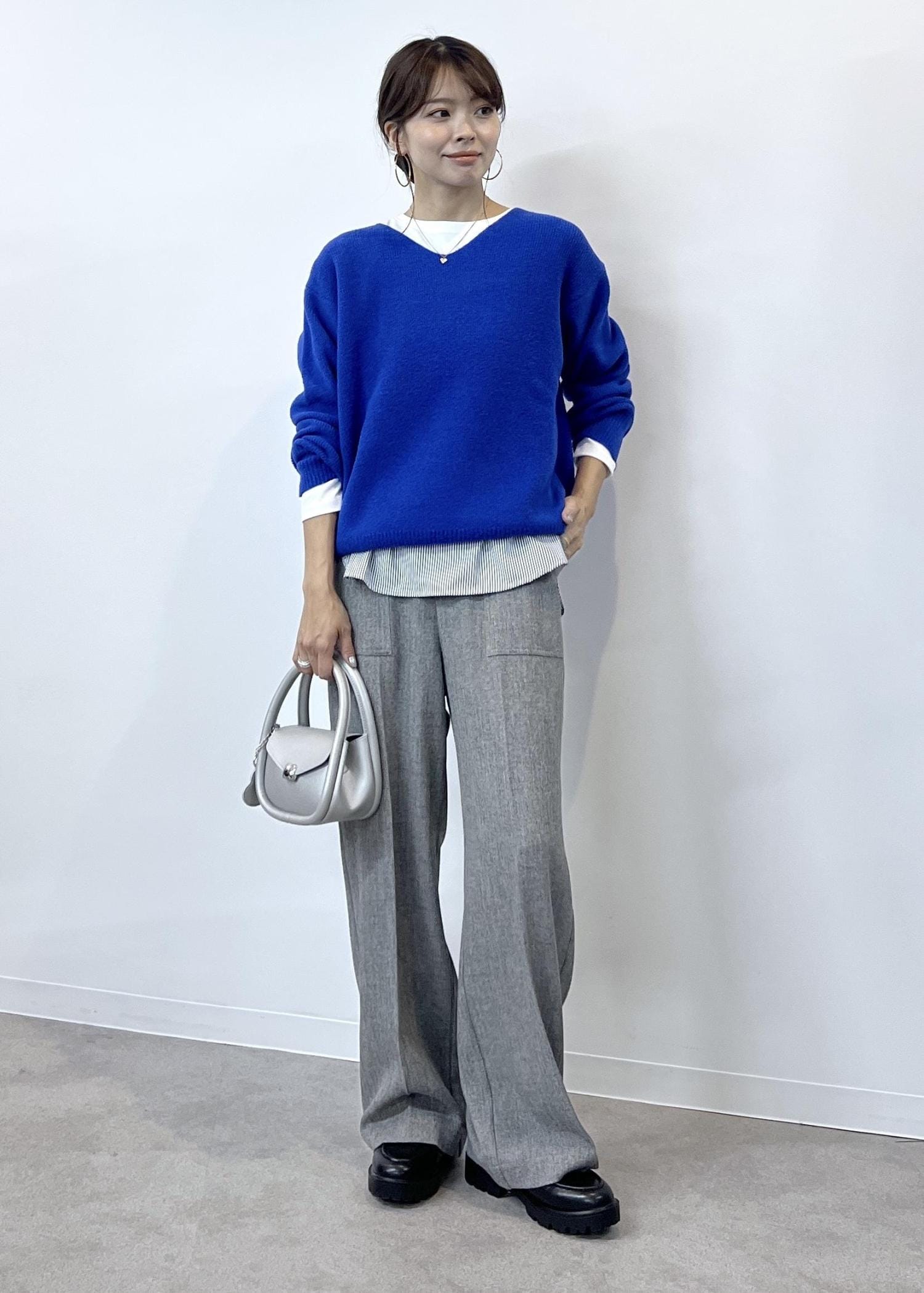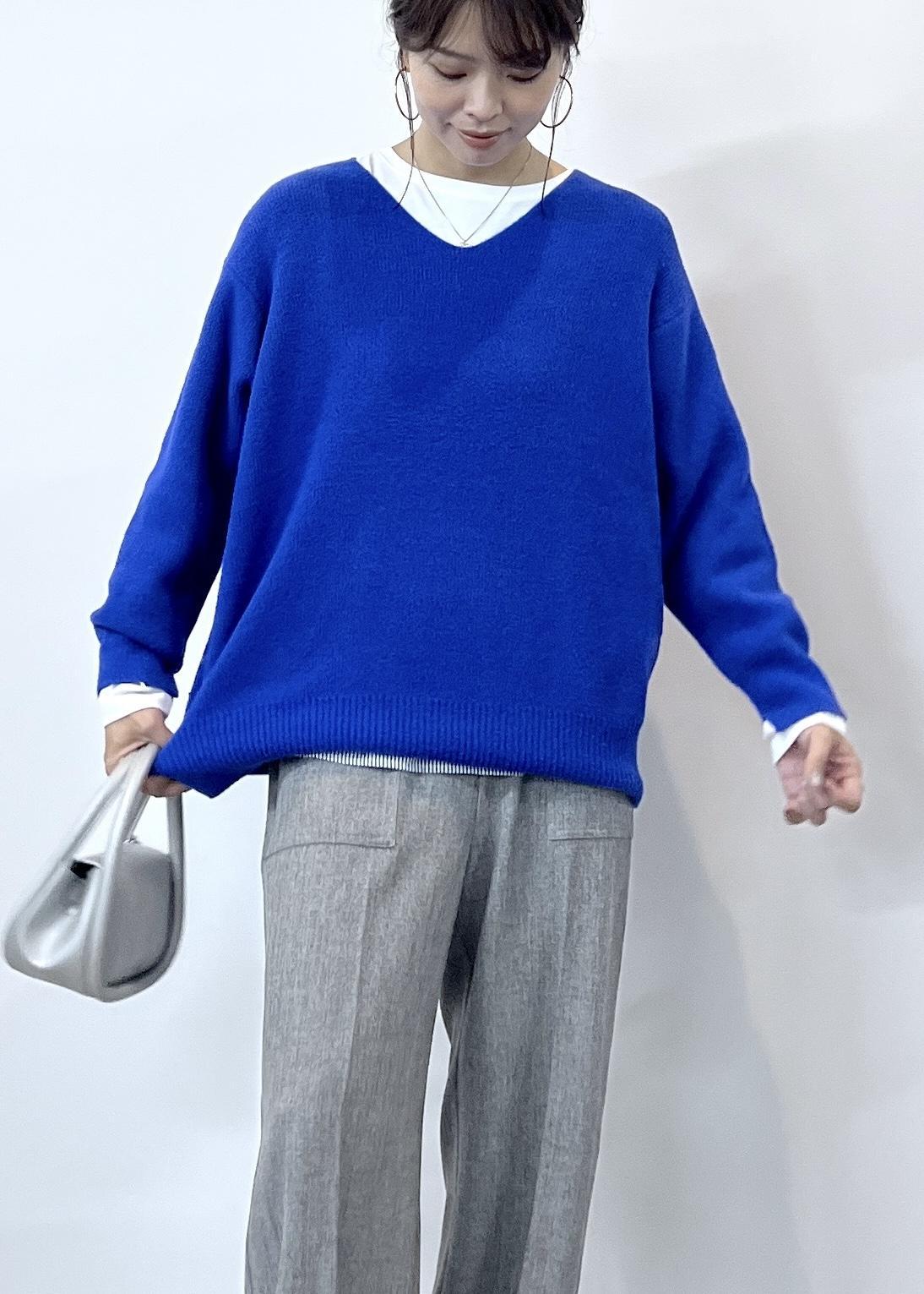目を引く鮮やかなブルーのニットは、肌触りもふわふわしていて着心地も楽ちん。