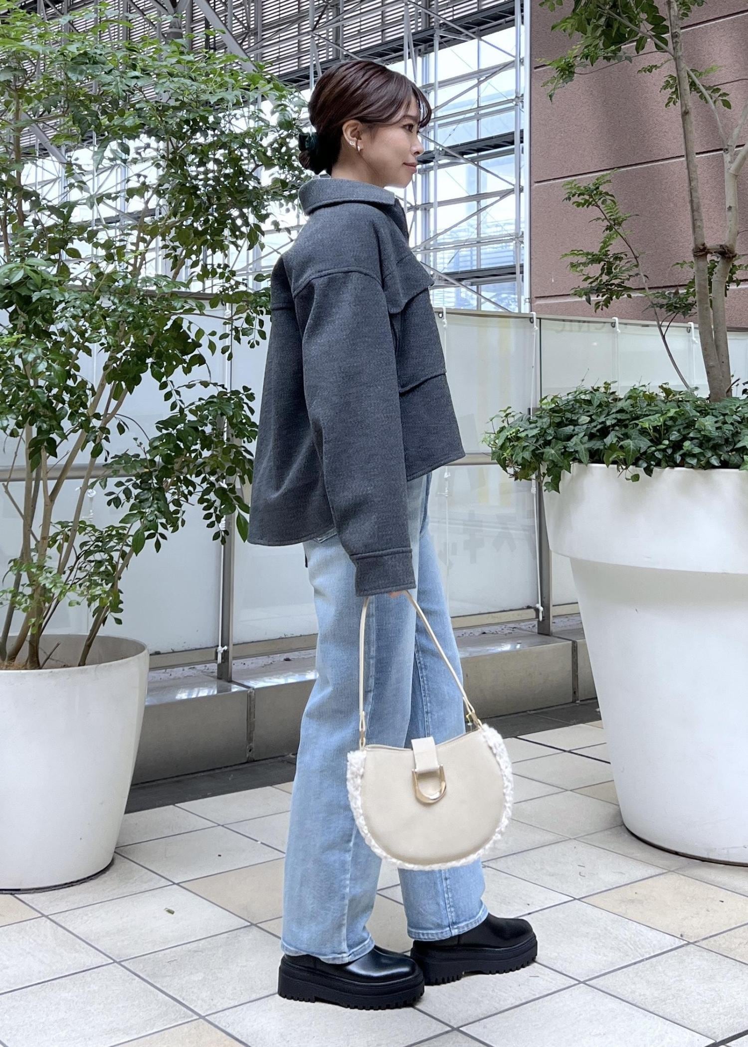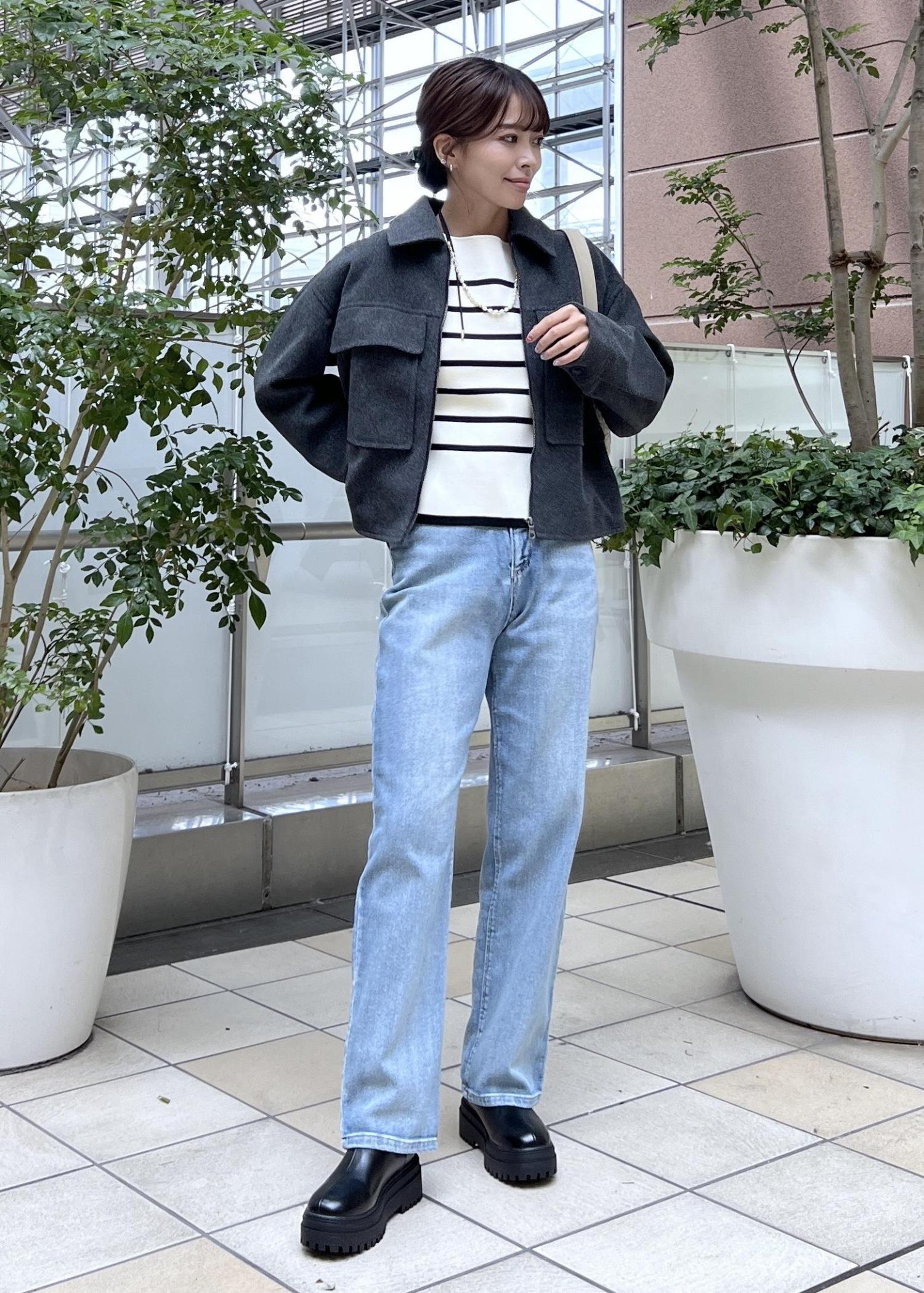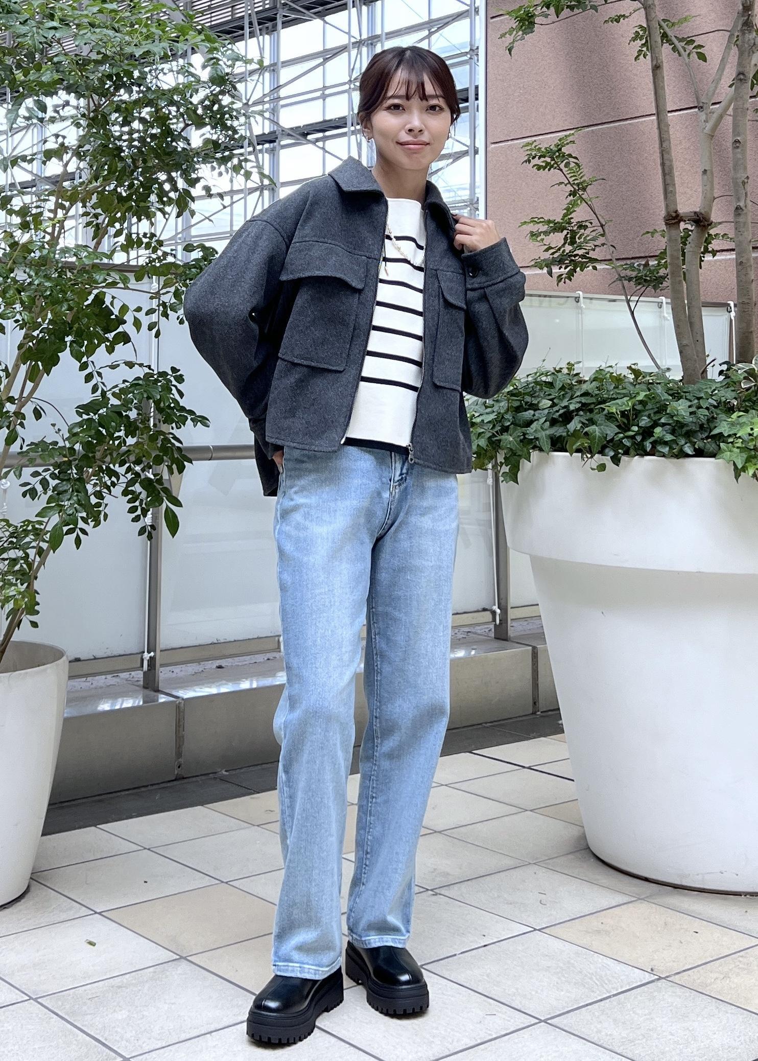 ジャストの着丈なのでボトムを選ばず合わせやすいです。 -