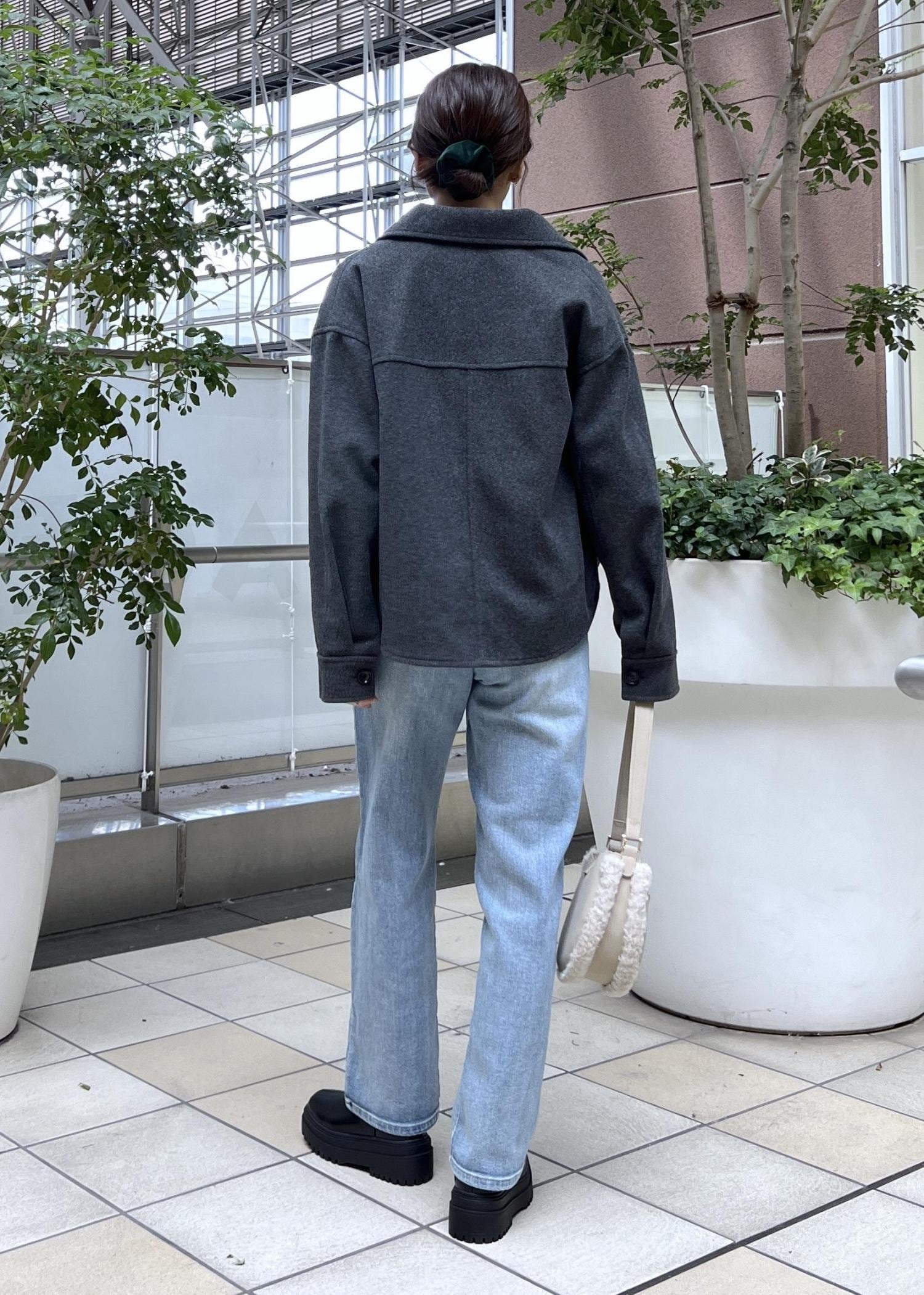 襟付きのショートアウターは、柔らかいジャージメルトン素材で軽く着やすい生地感。
