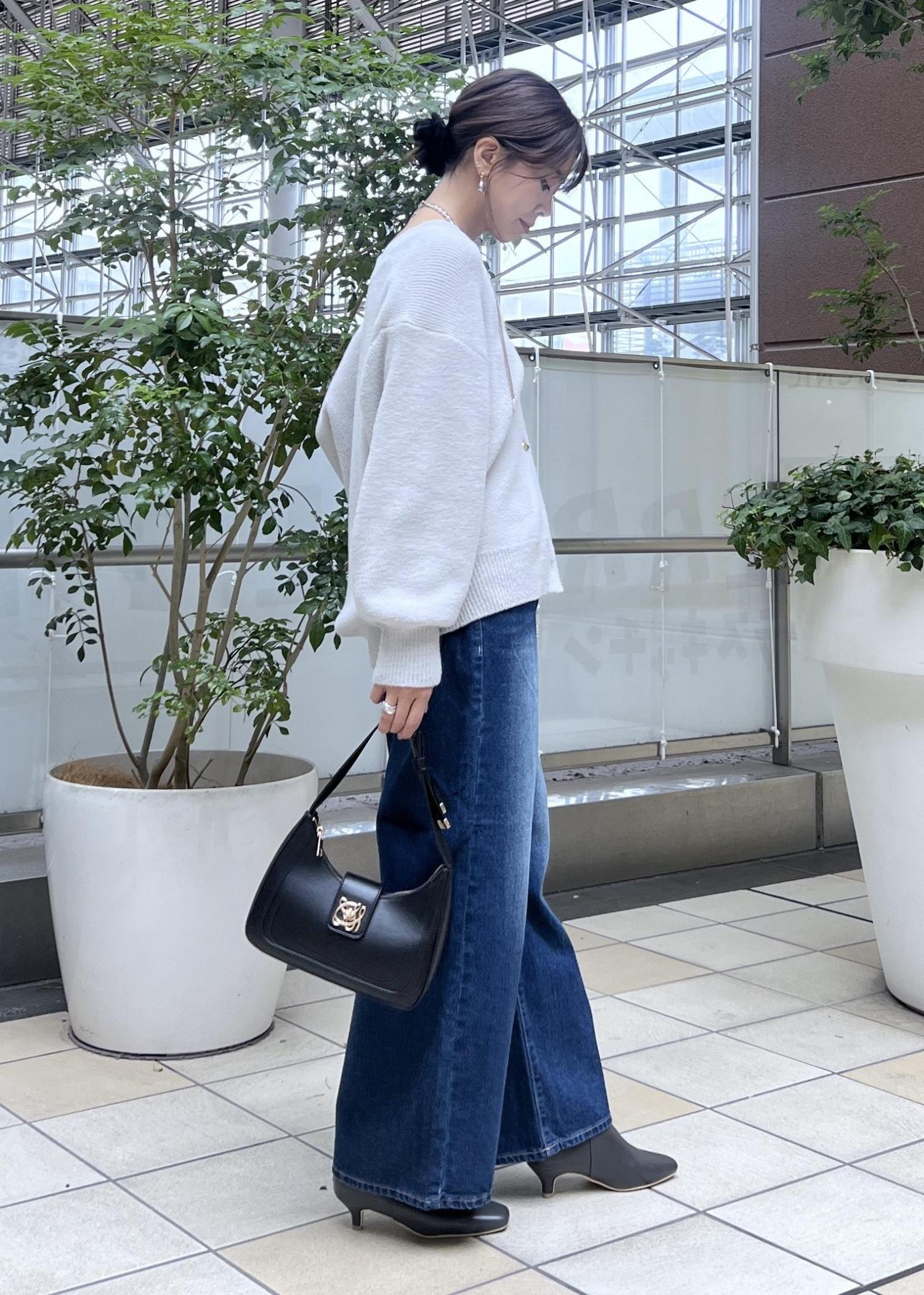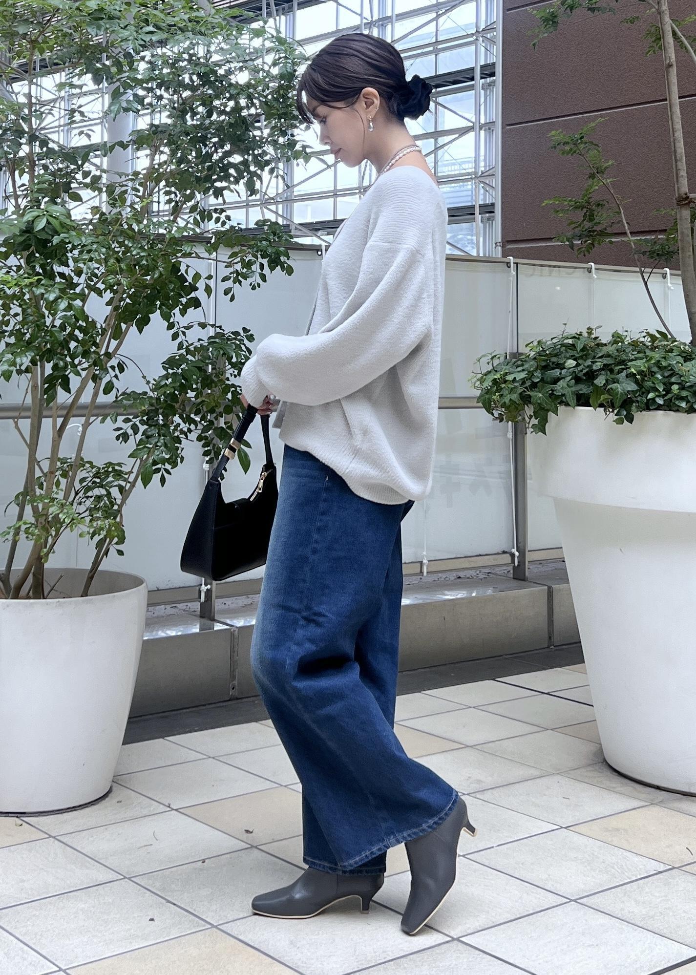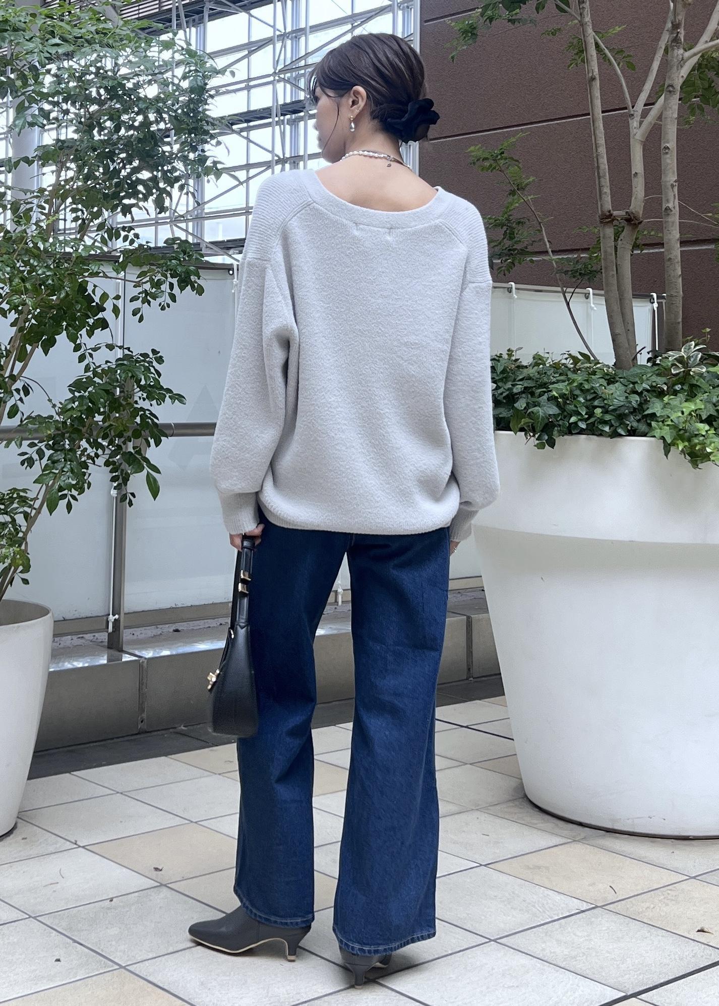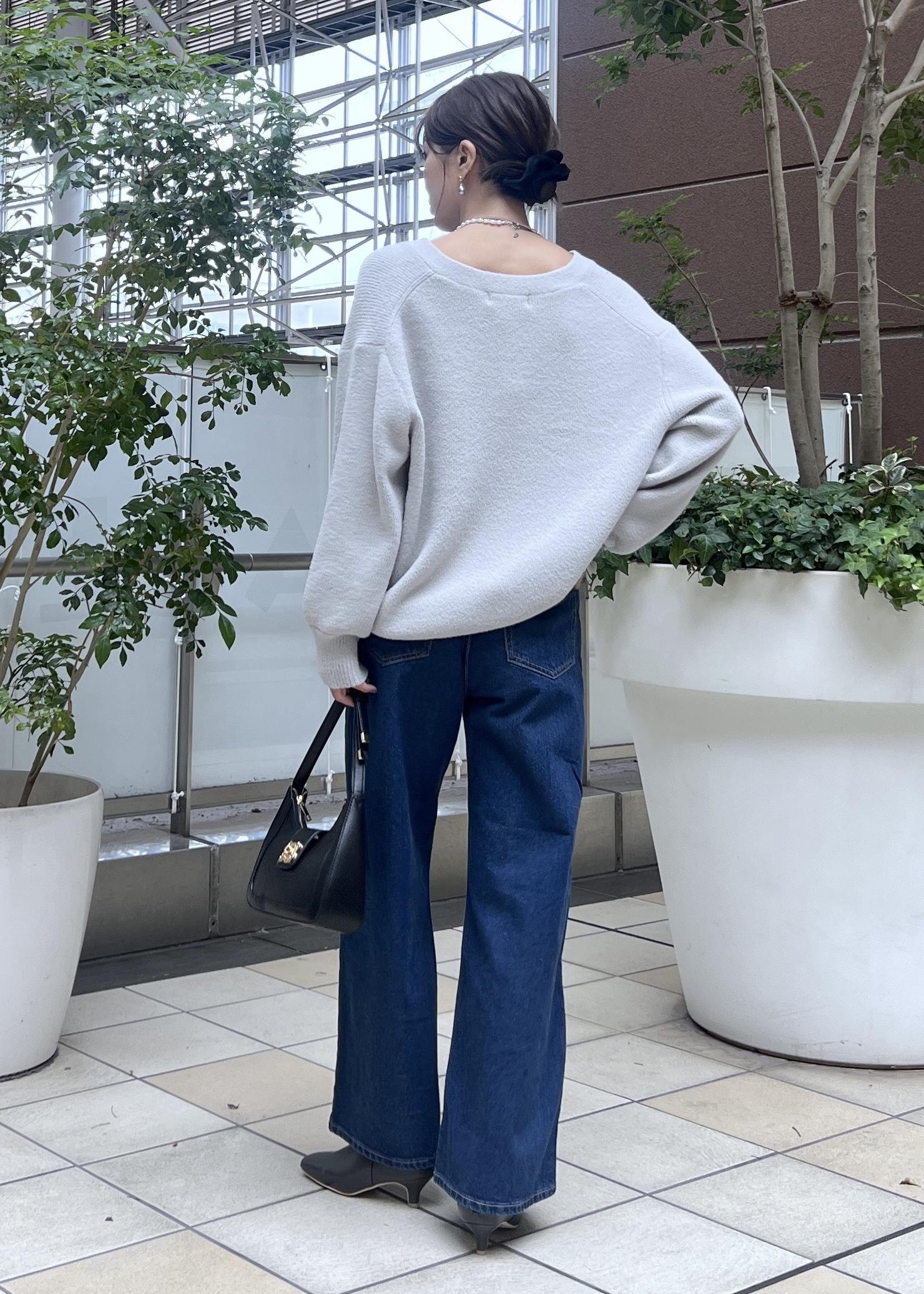 デニムパンツでシンプルなコーデですが、抜け感のあるVネックなら大人カジュアルなスタイリングに◎。