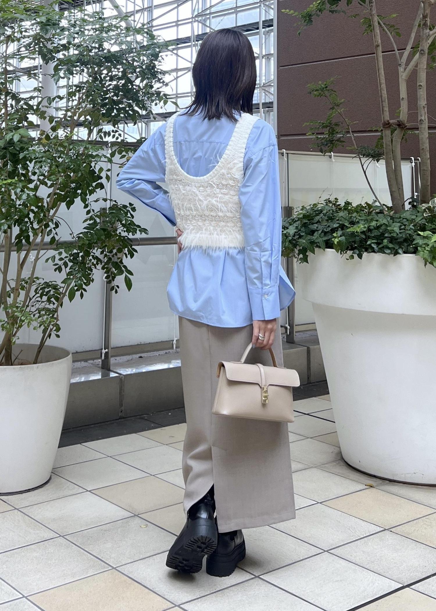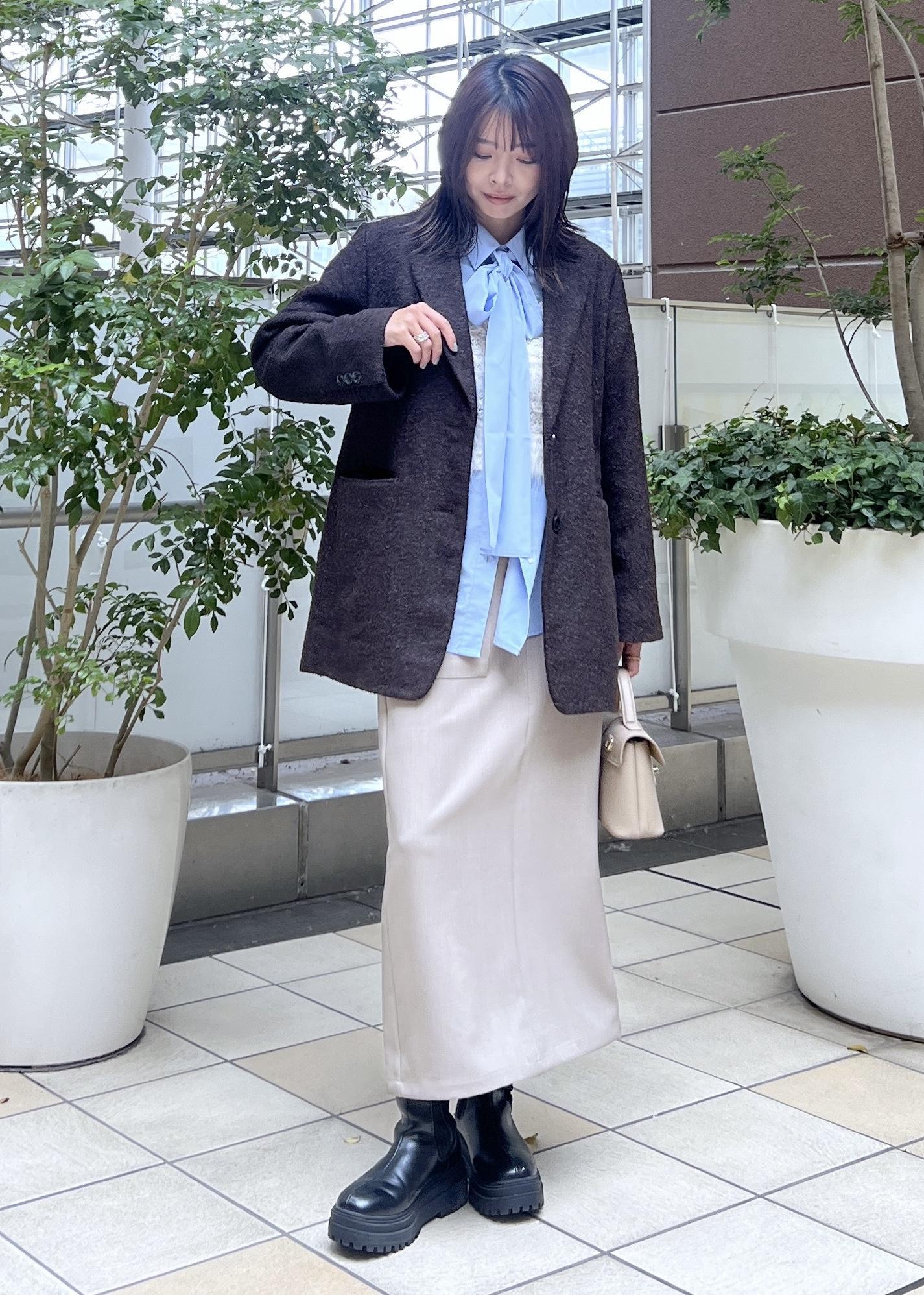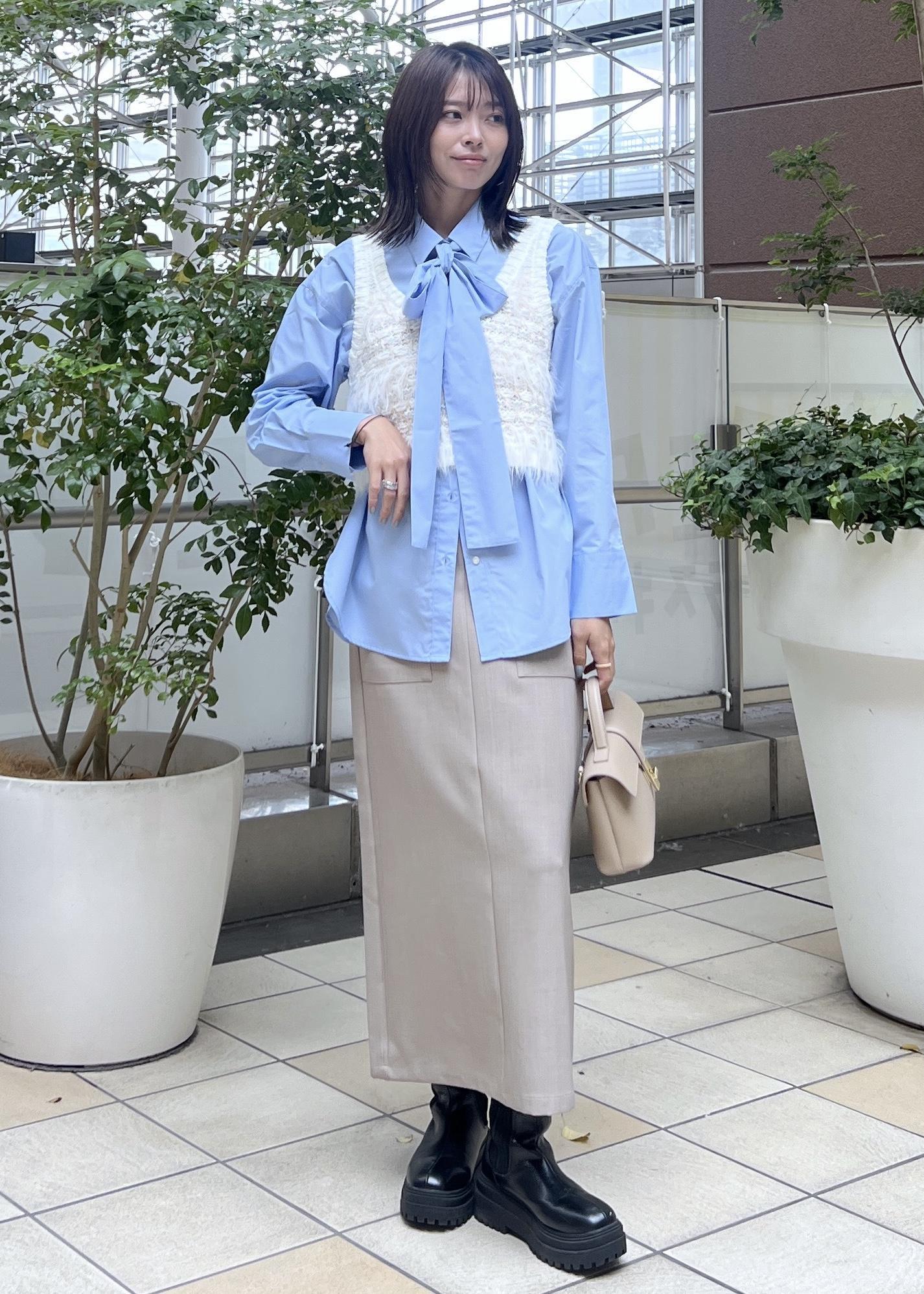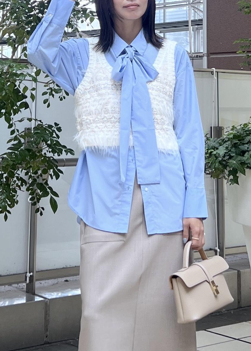 リボンタイのシャツ×ニットベストで、ジャコットを脱いでも可愛いスタイリングにしました。