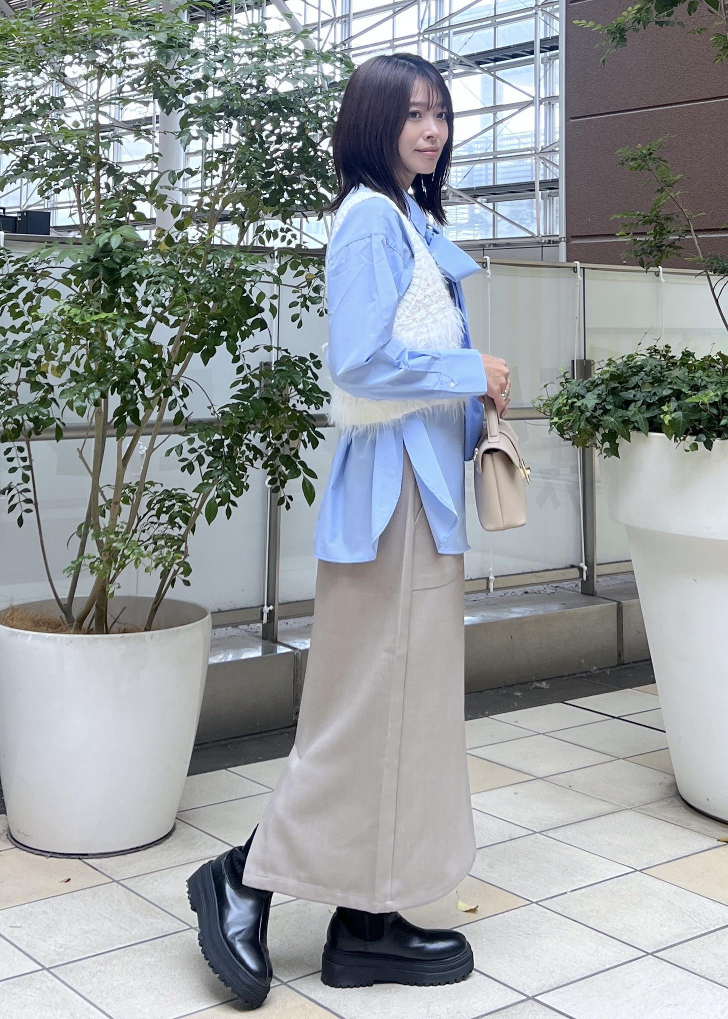 ボトムはアイラインスカートで、大人のカジュアルコーデです。
