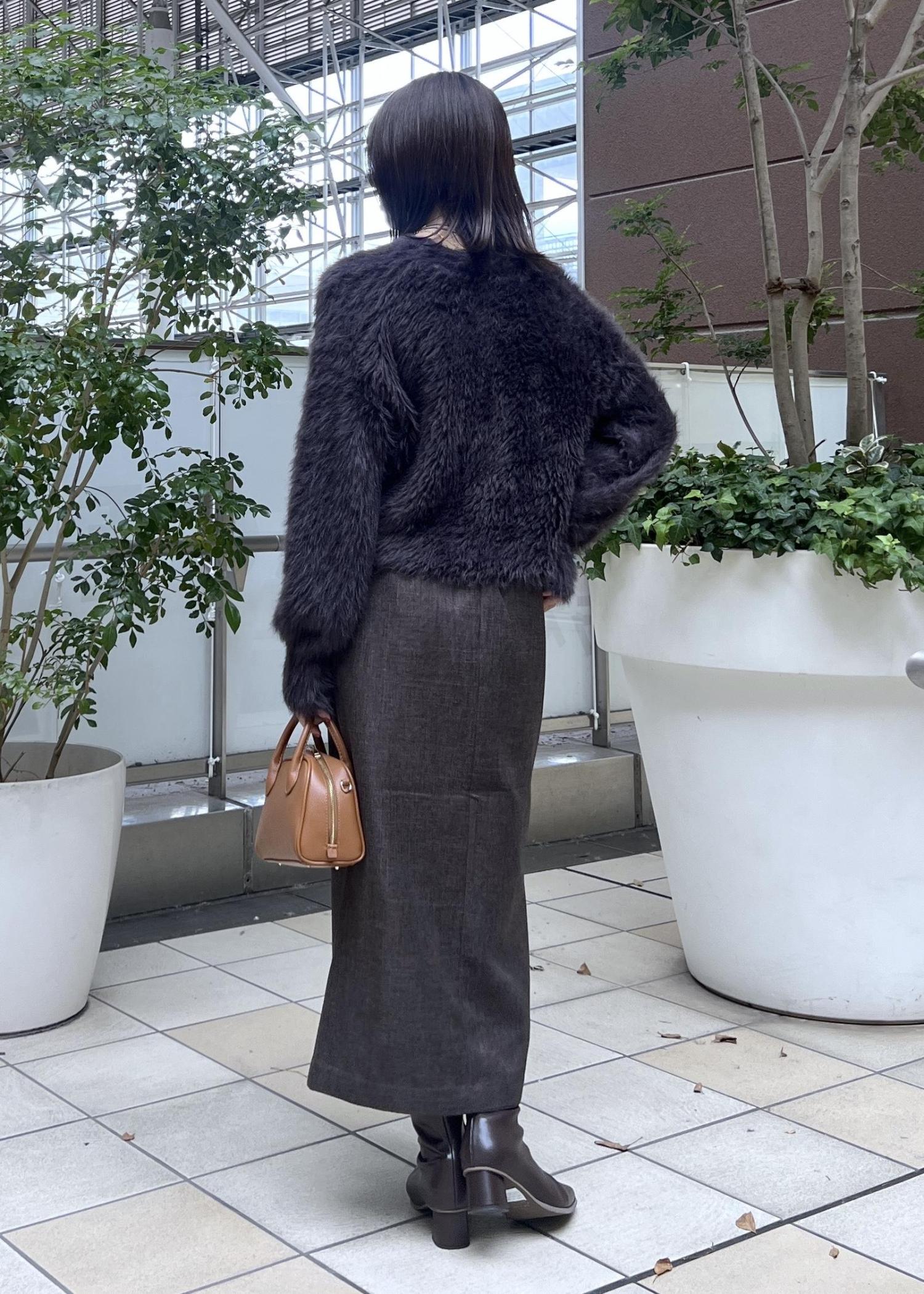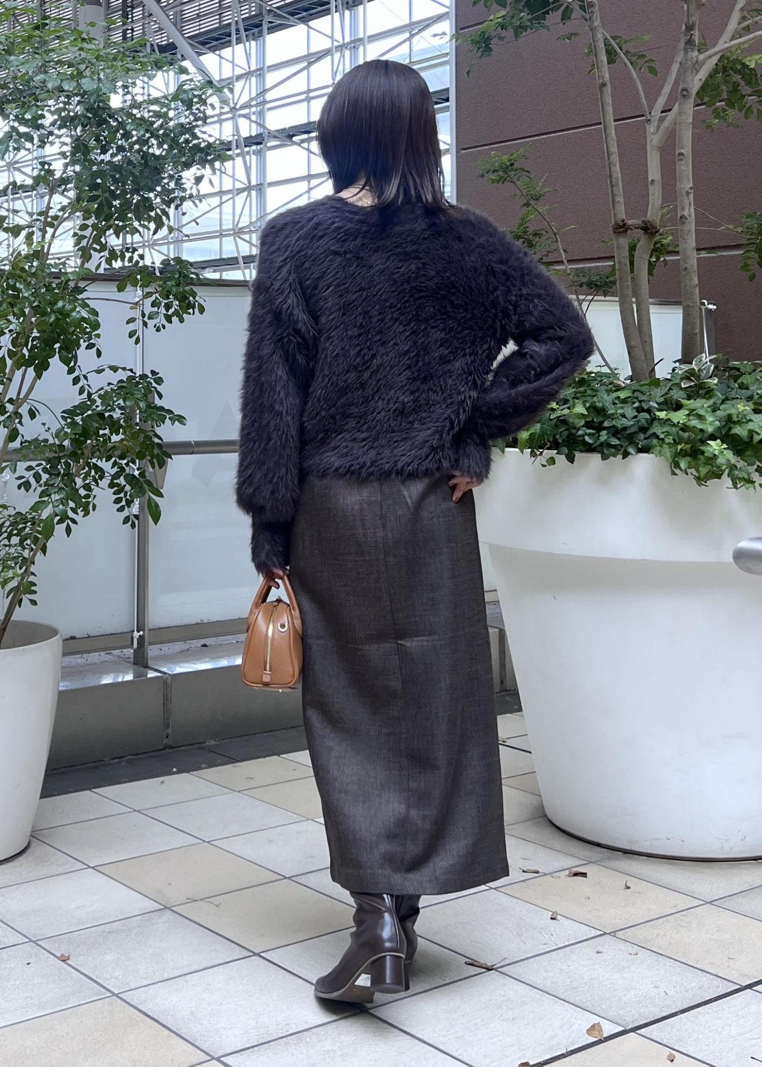 柔らかいフェザーニットは女性らしさのあるコーデにおすすめ。
