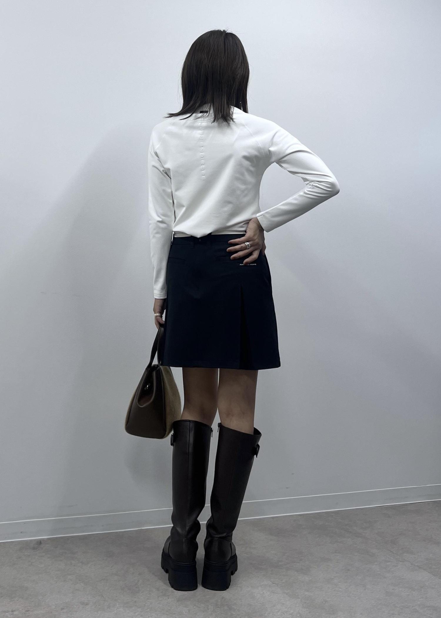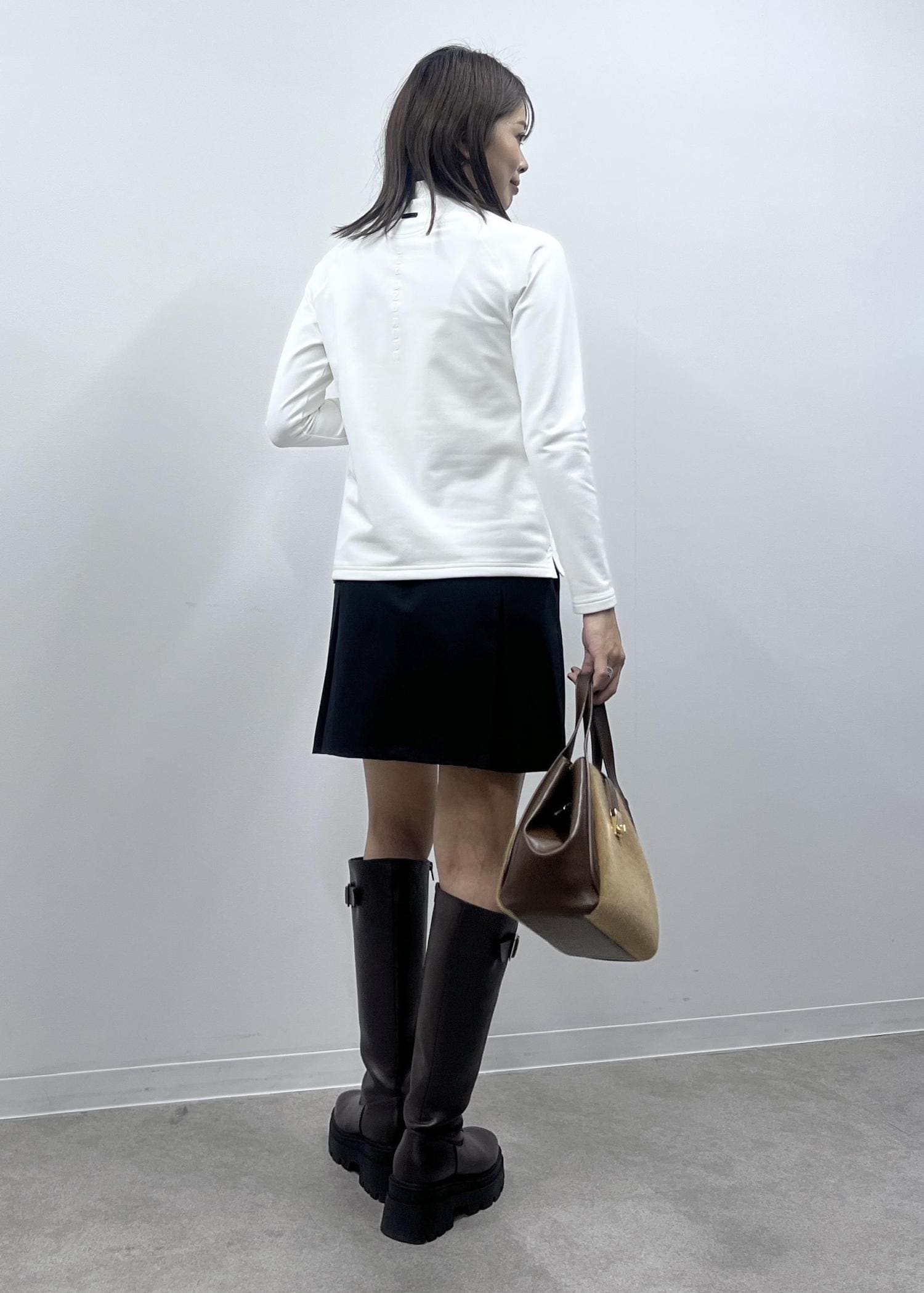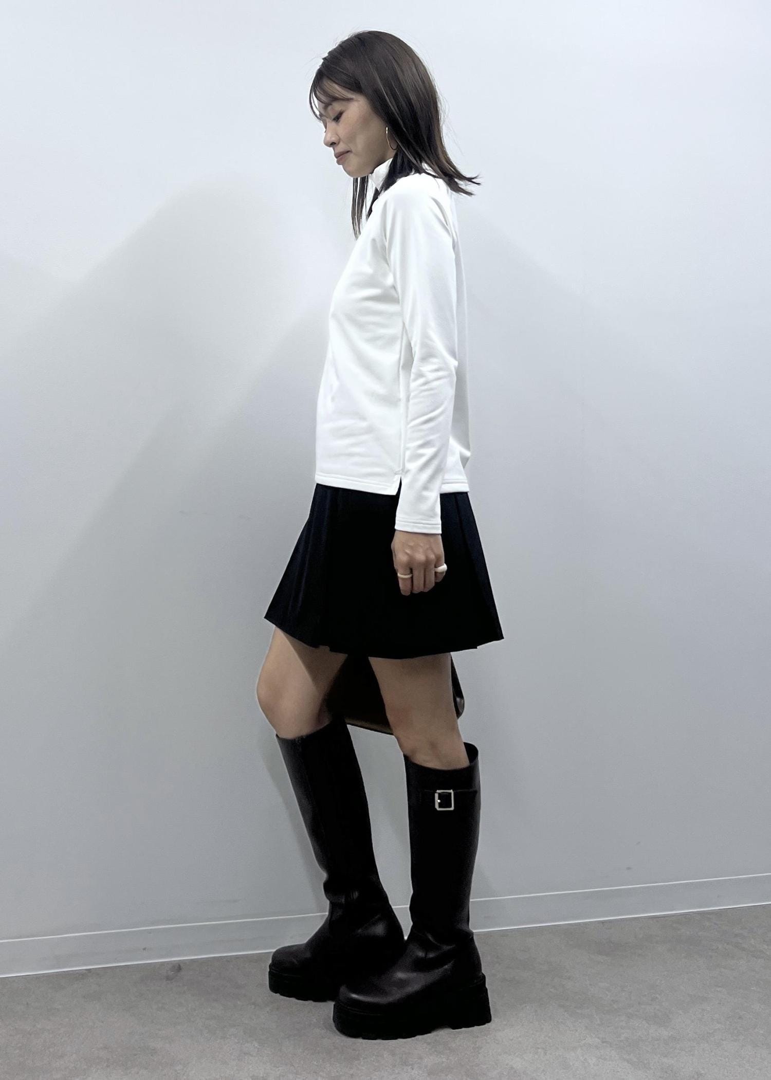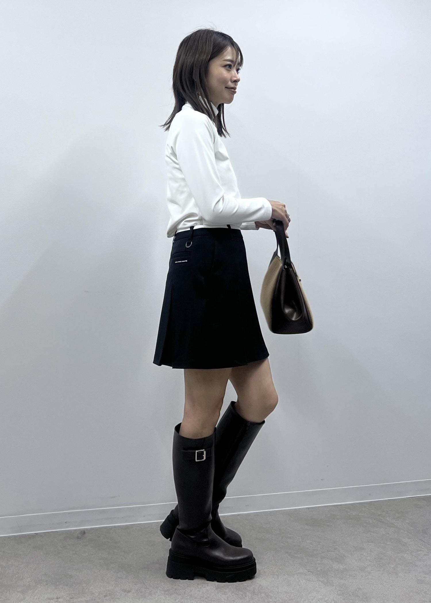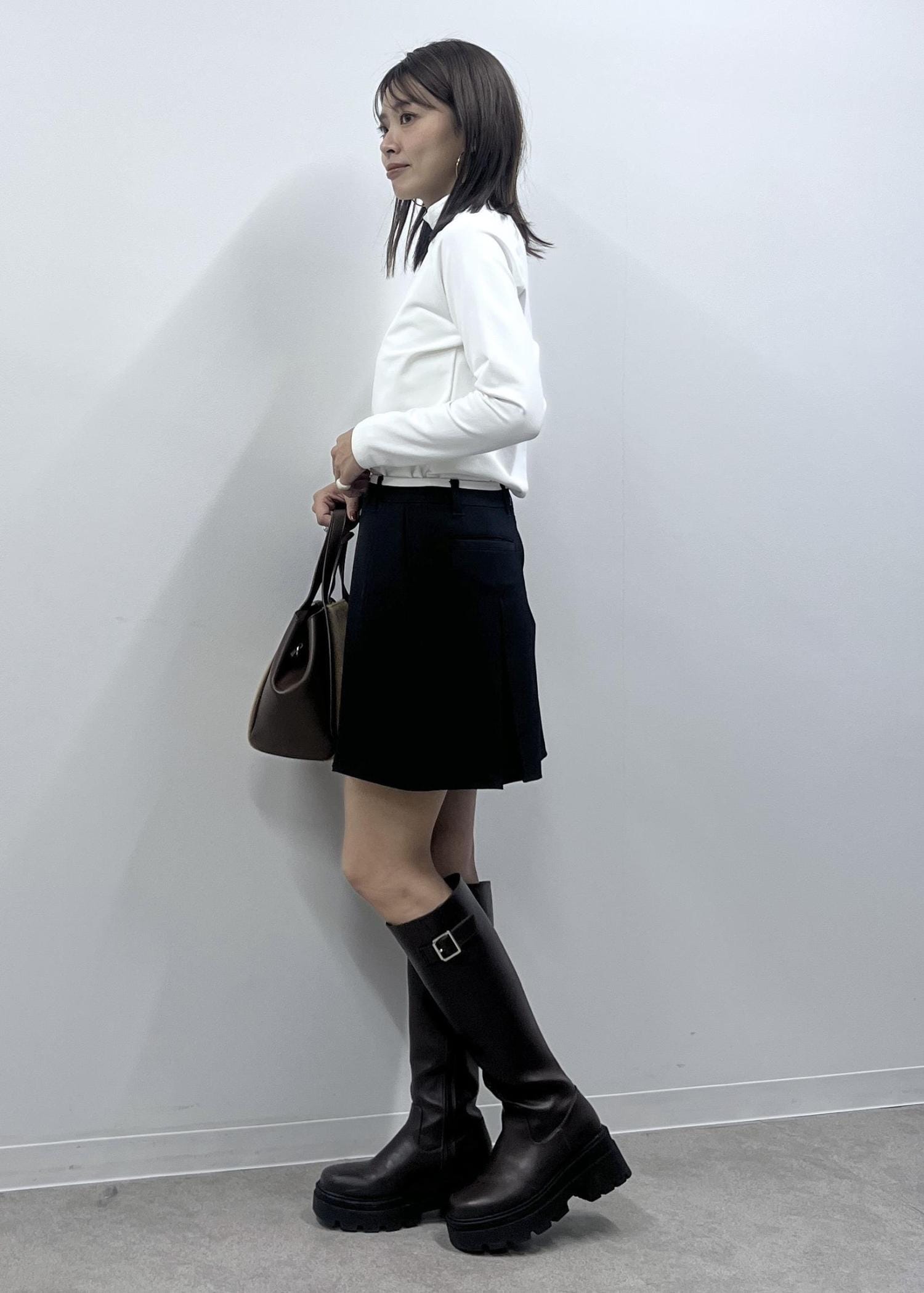 ミニ丈のボトムにはロングブーツを合わせて、大人カジュアルな着こなしにしました。