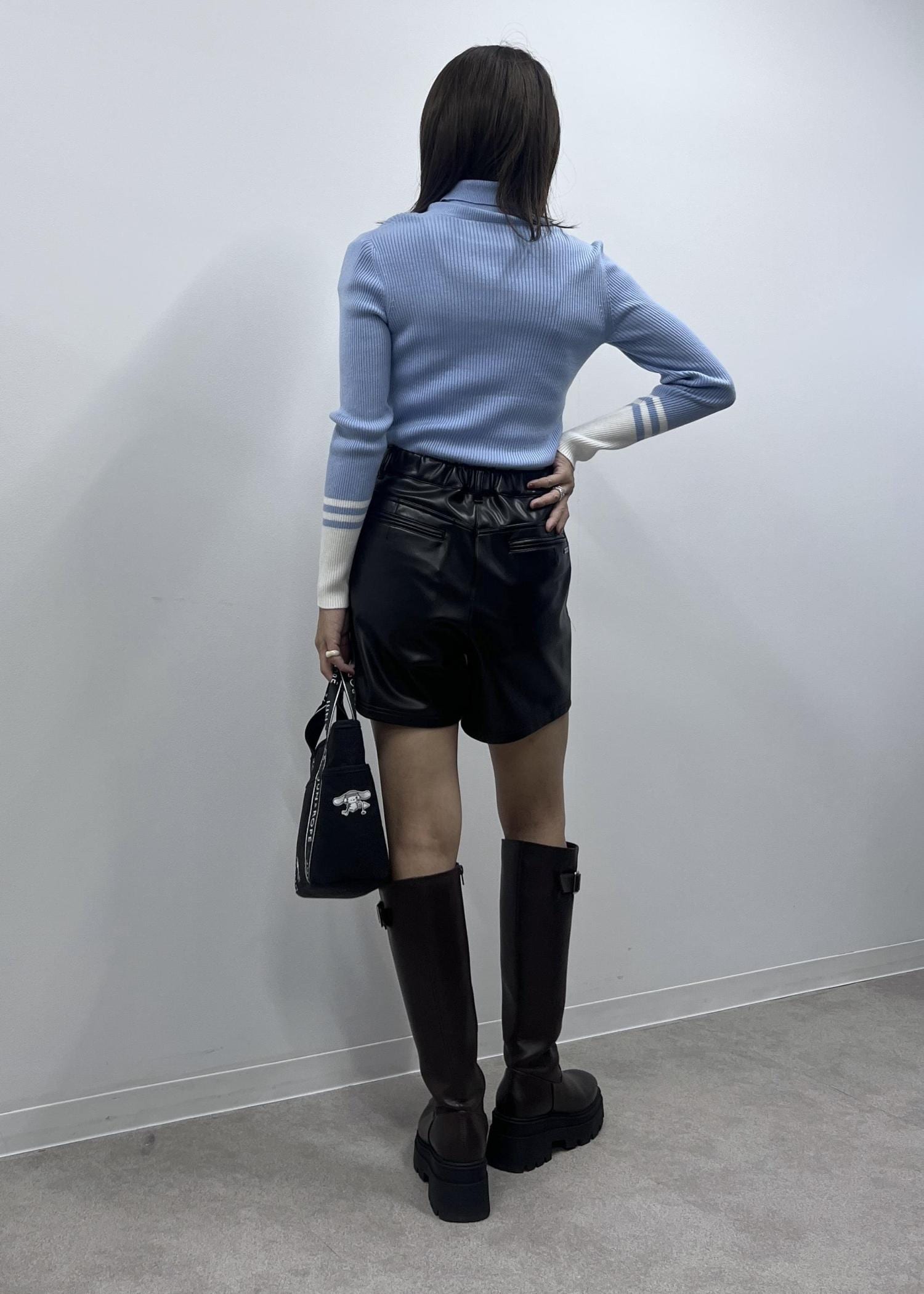 レザーのショートパンツはしっかりした生地感でも、動いやすいので普段使いにもおすすめです。
