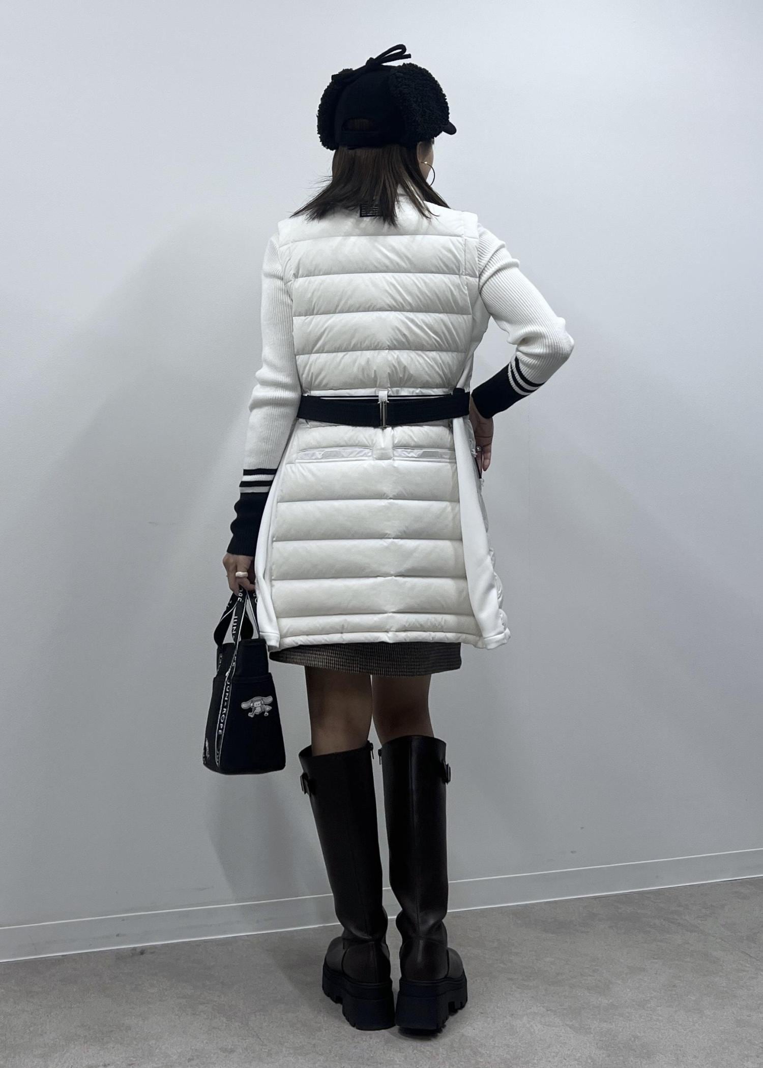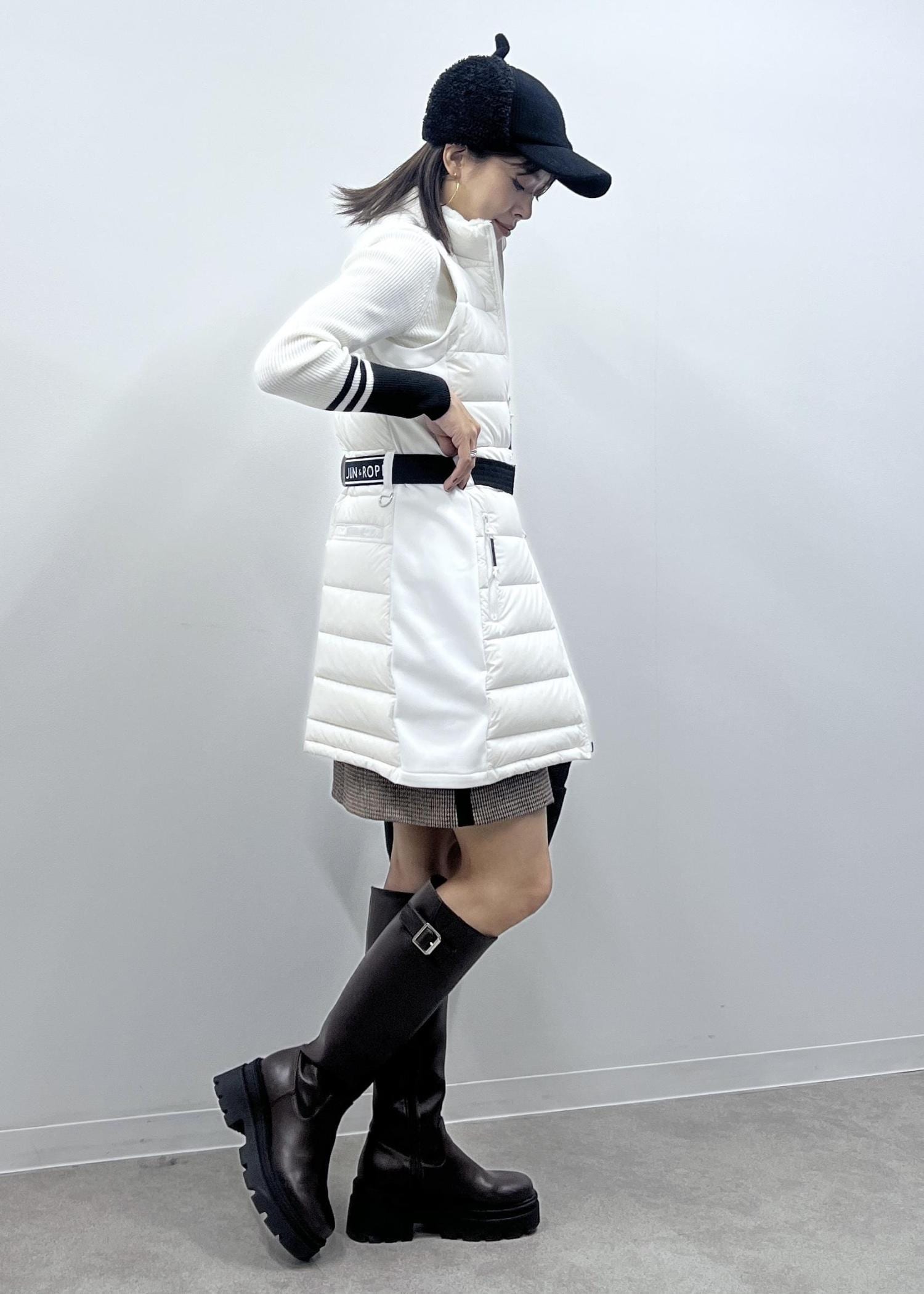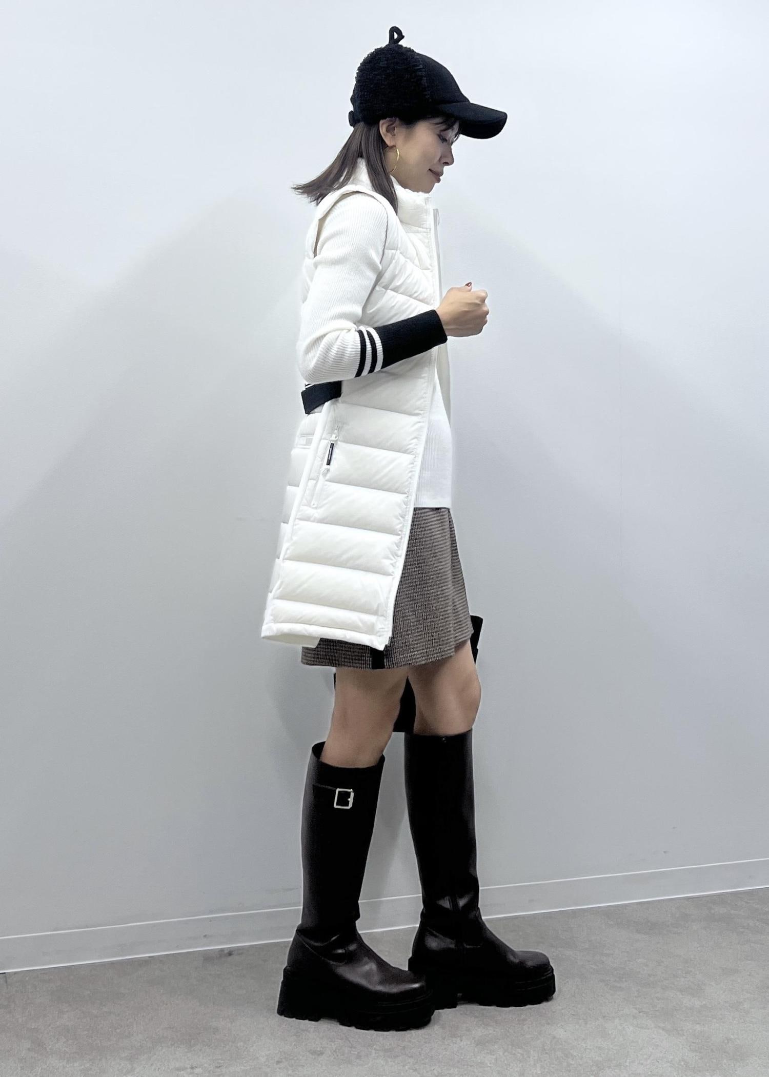 ヒップの隠れる着丈のダウンワンピースは、レイヤードしてロングベストのように着用しても◎。