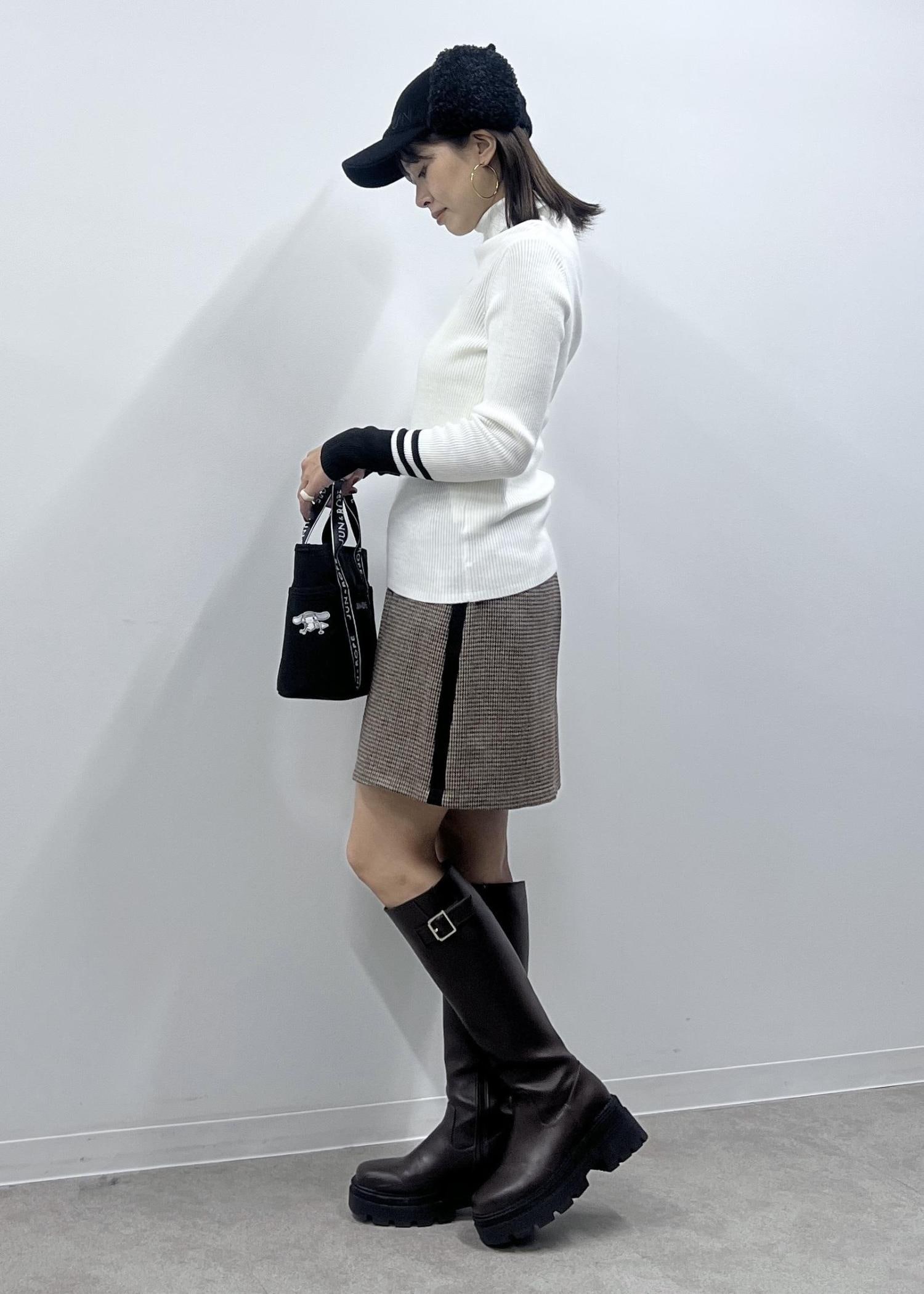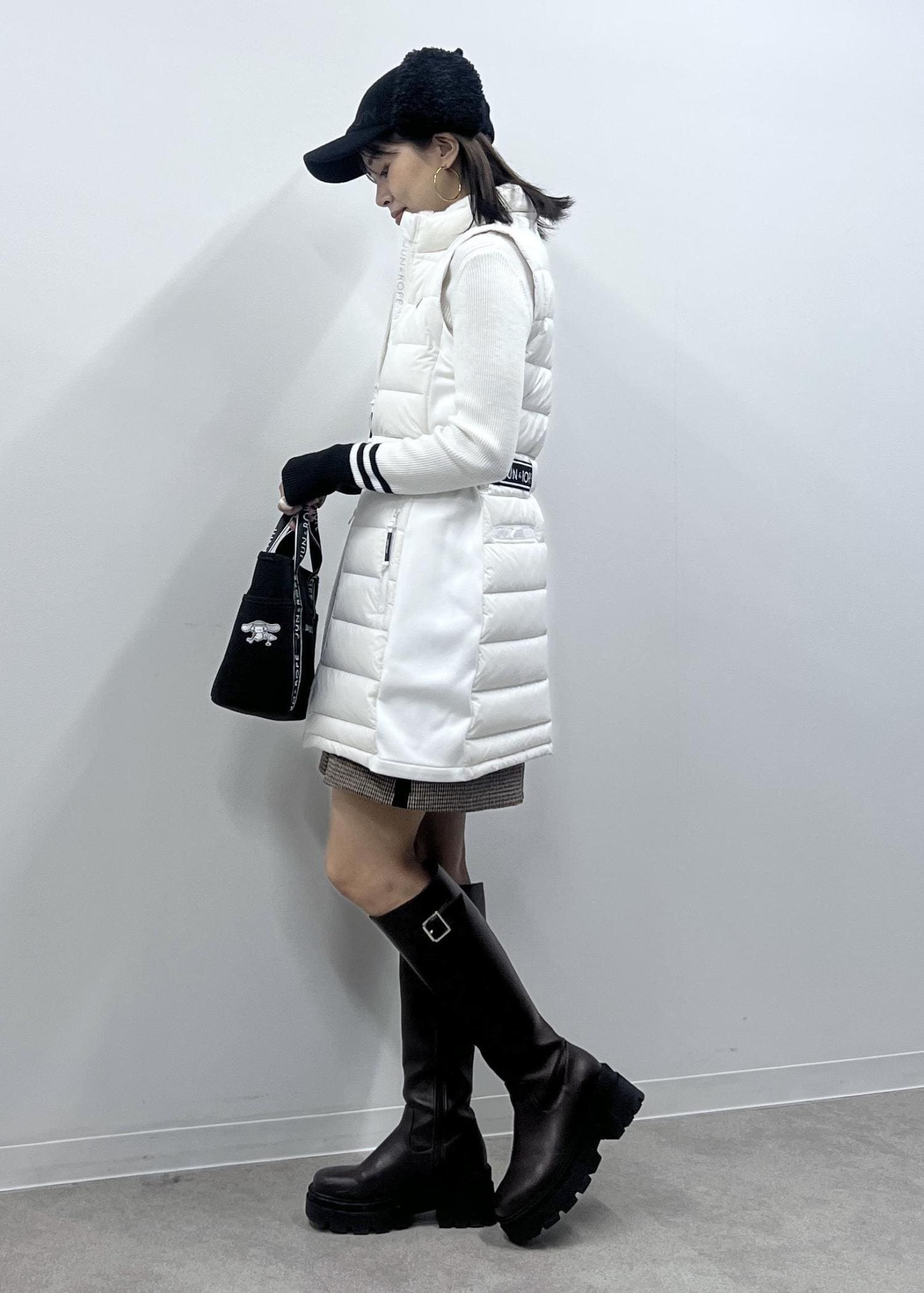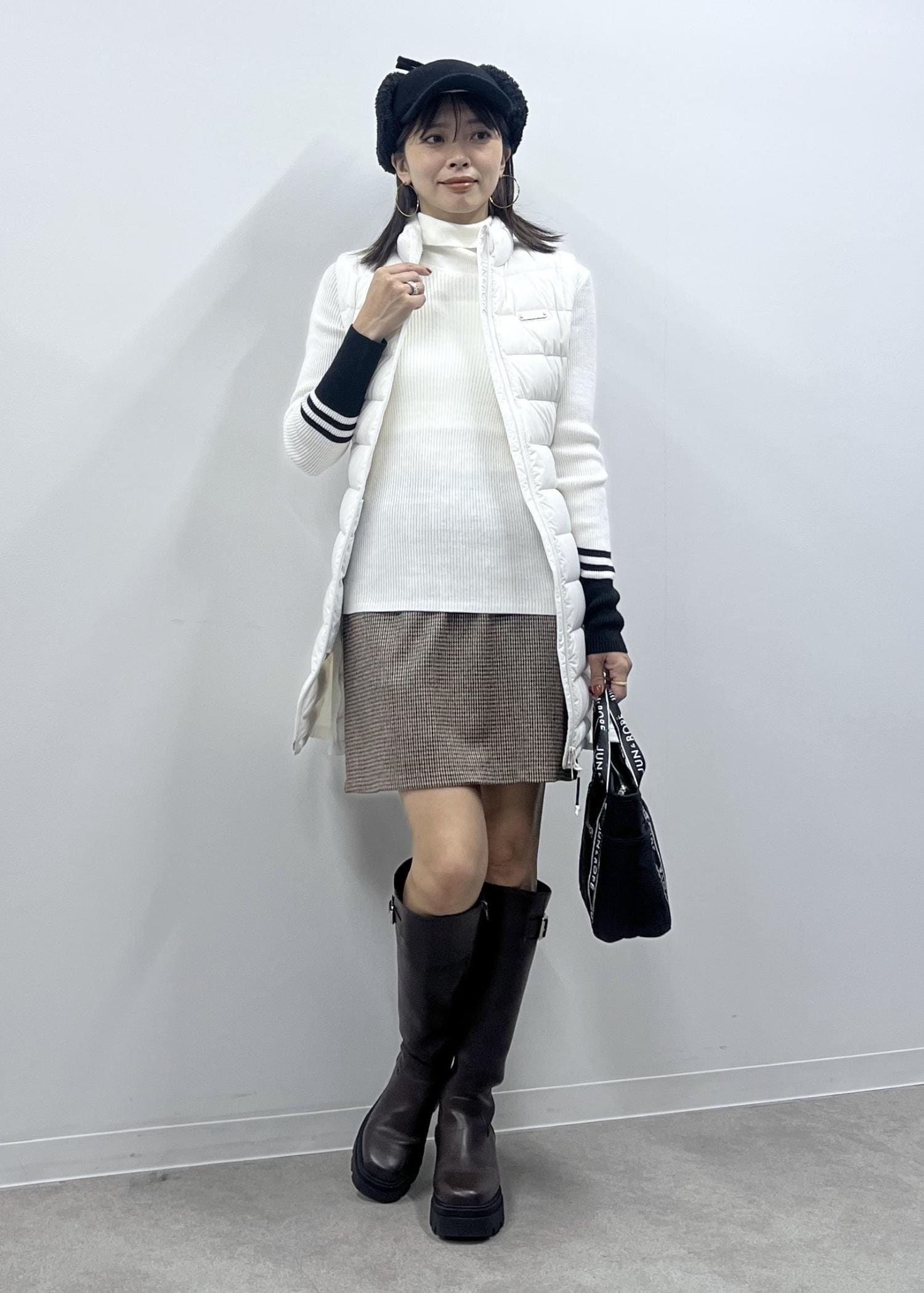 ホワイトのニットに、ブラウンのミニスカートを合わせてダウンを脱いでも華やかさのあるスタイリングにしました。