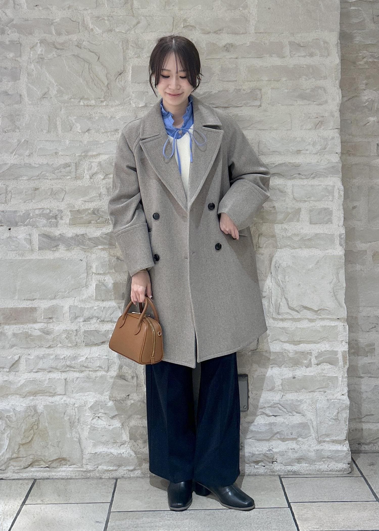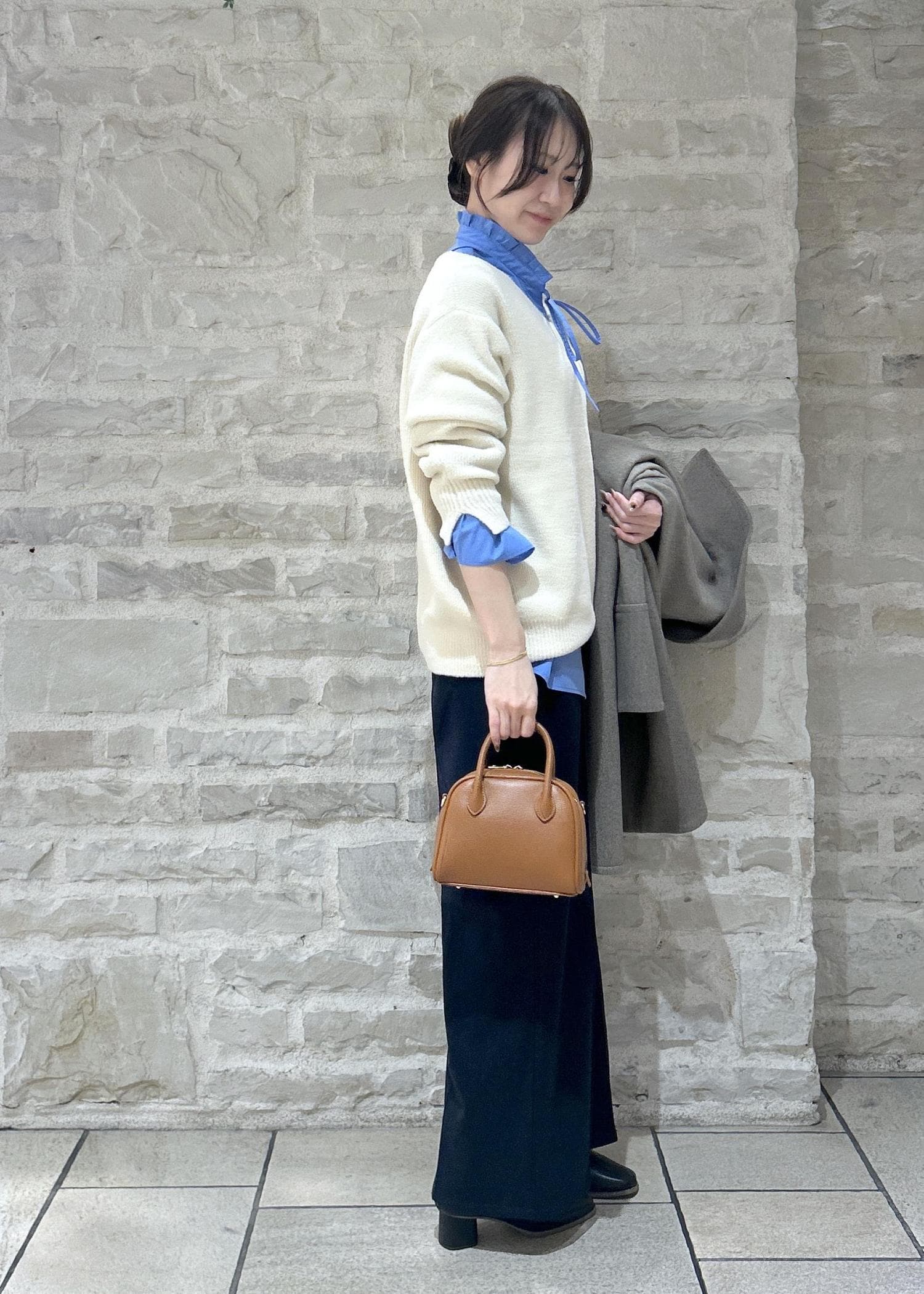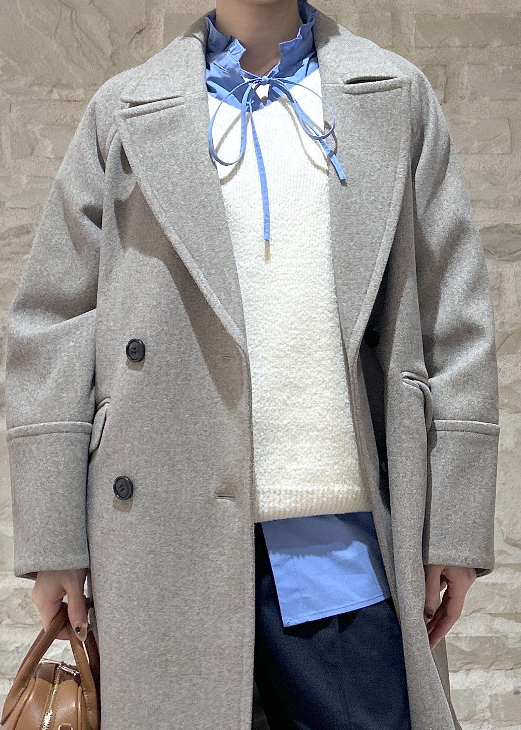 白のニットにグレーのコートで大人カジュアルな冬スタイリングにしました。