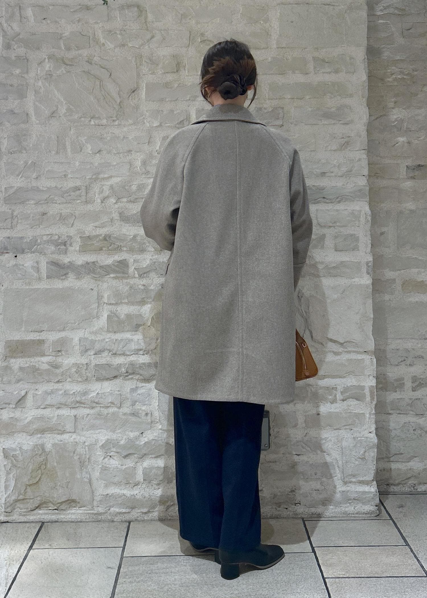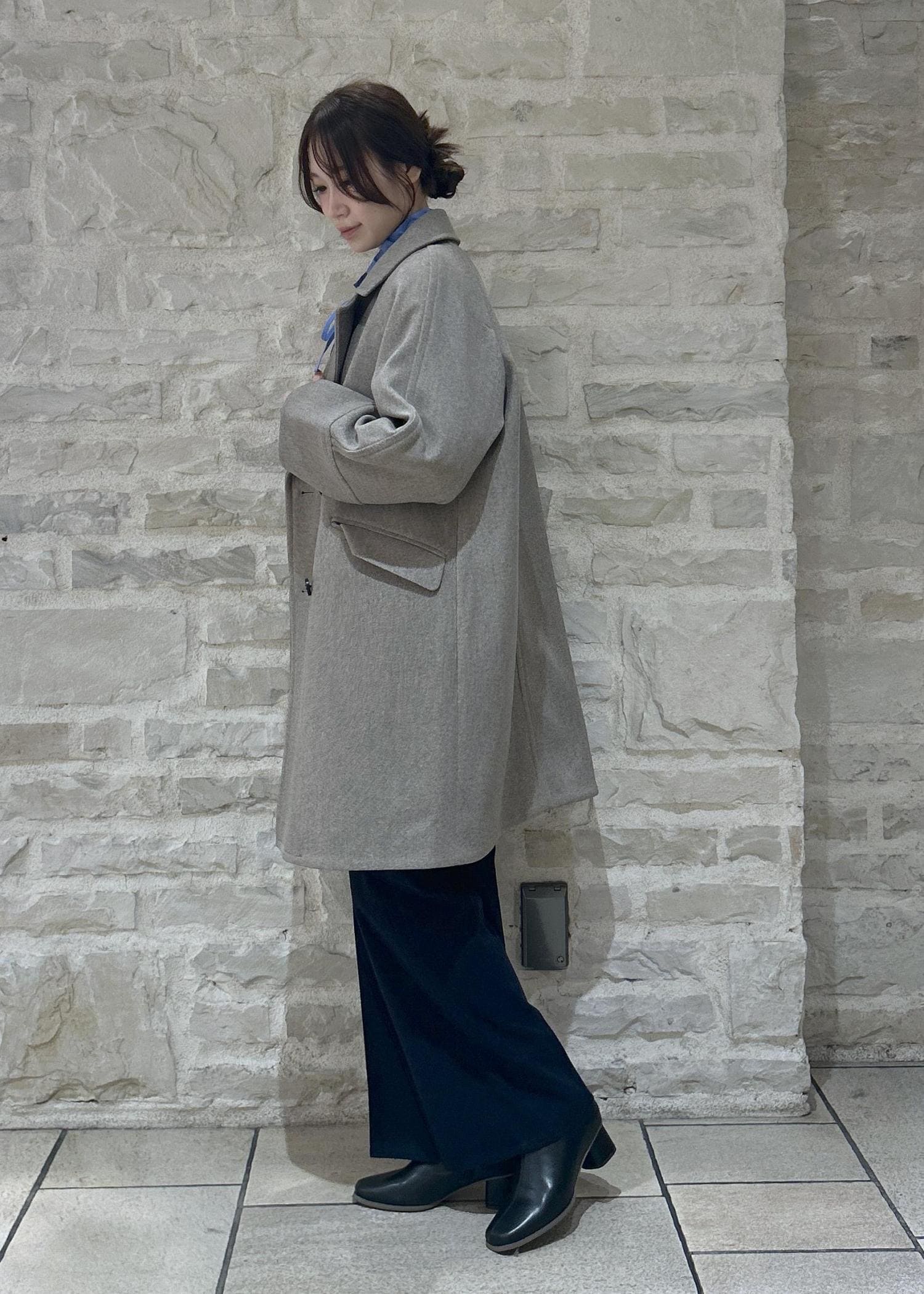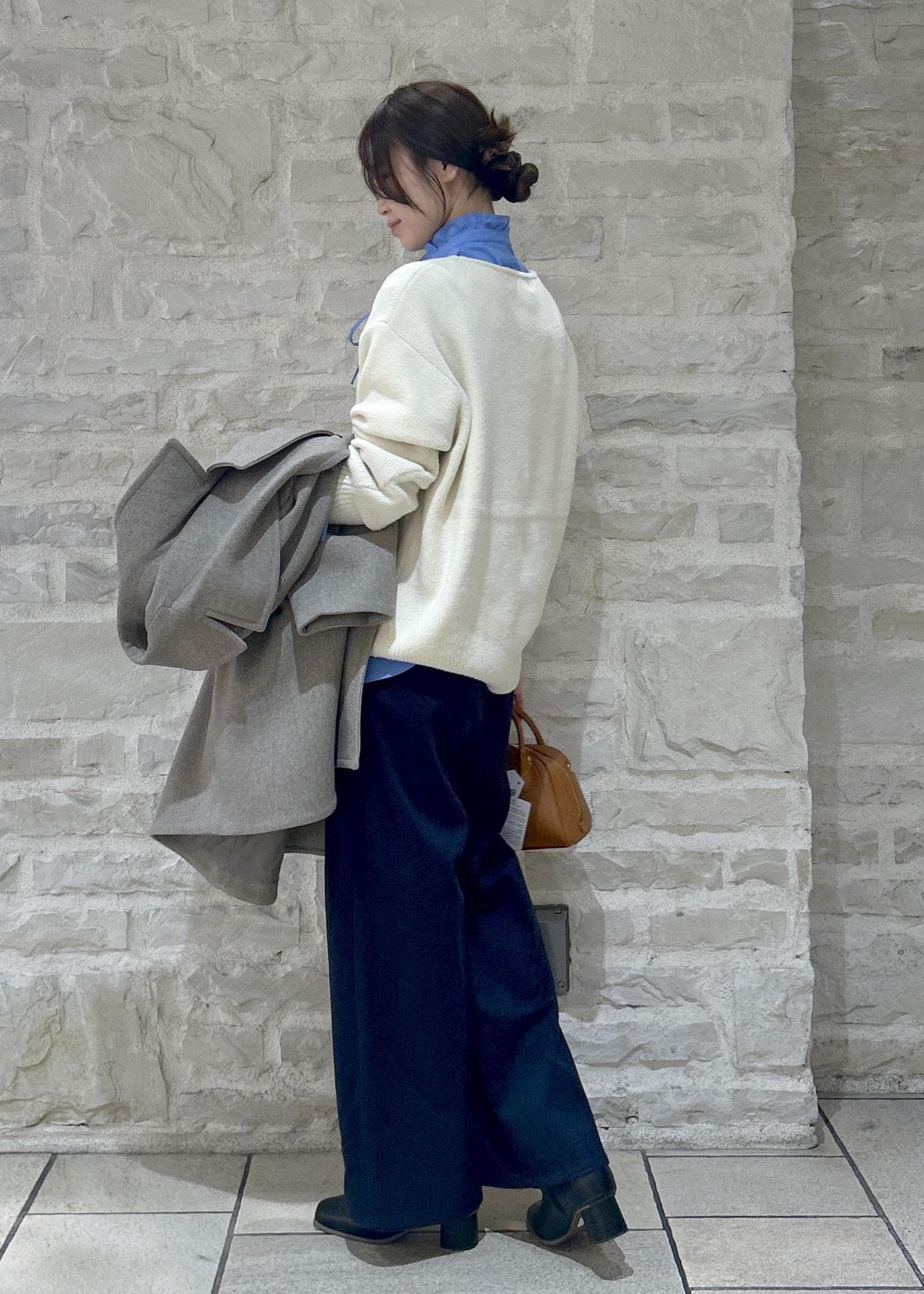 白のニットにグレーのコートで大人カジュアルな冬スタイリングにしました。