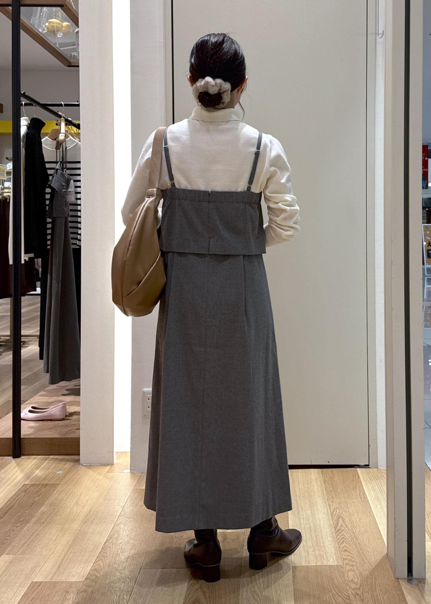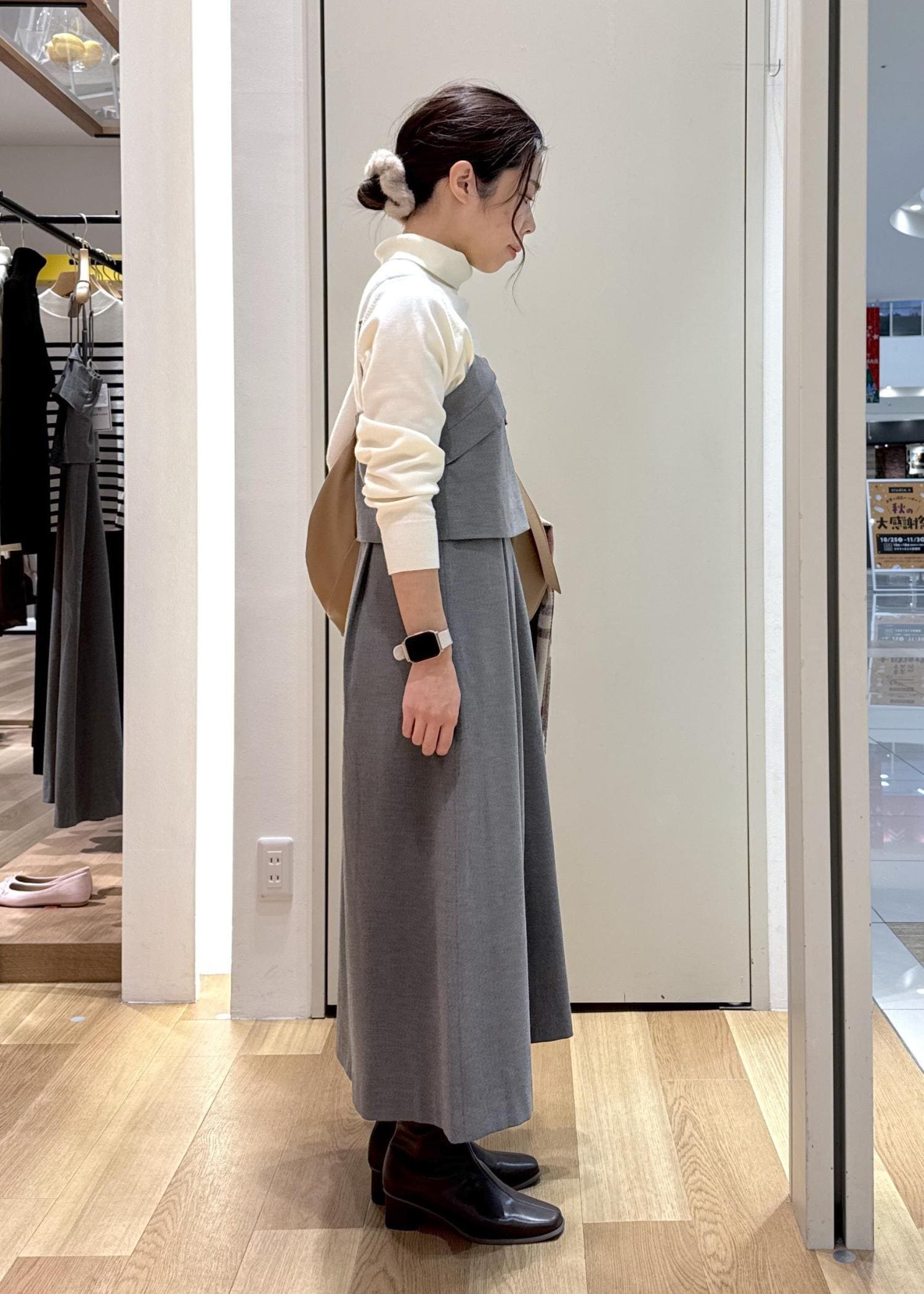 ヒップまわりはゆとりのある印象ですが、バストまわりはピタッとゆとり少なめな着心地で、インナーは薄手のニットがおすすめです。 -