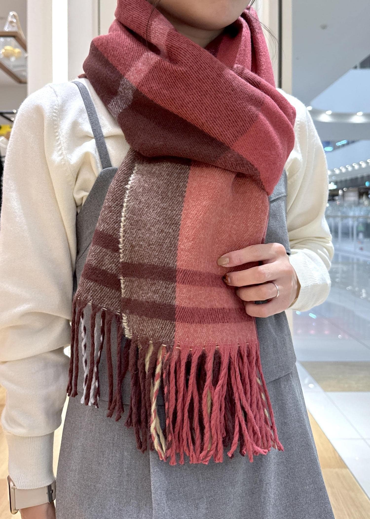 赤のチェックストールがアクセント♪その他はシンプルな色合わせで大人っぽくまとめました。