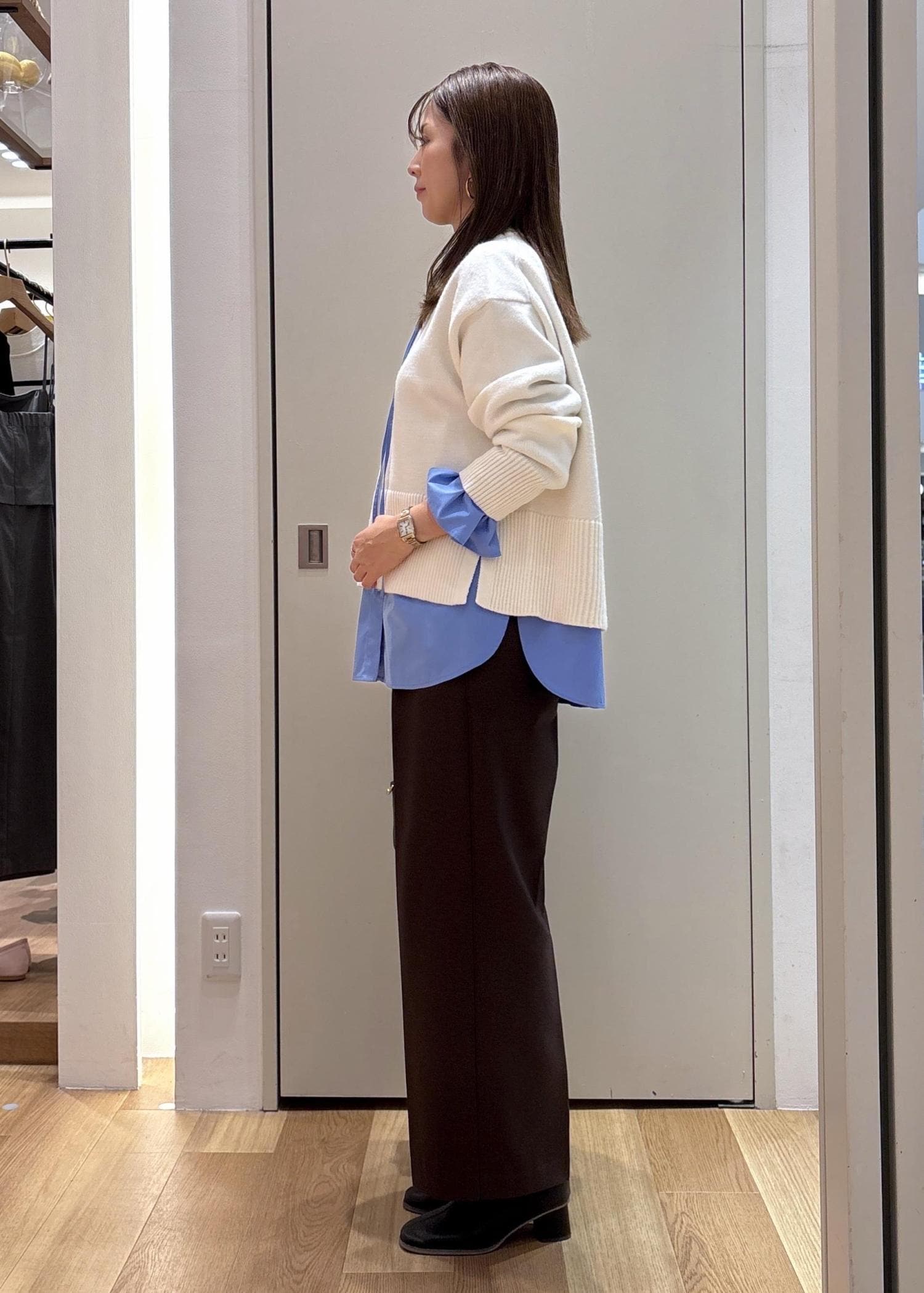 丈はヒップが隠れる長さなので、ニットやカーディガンを合わせてレイヤードスタイルにも◎