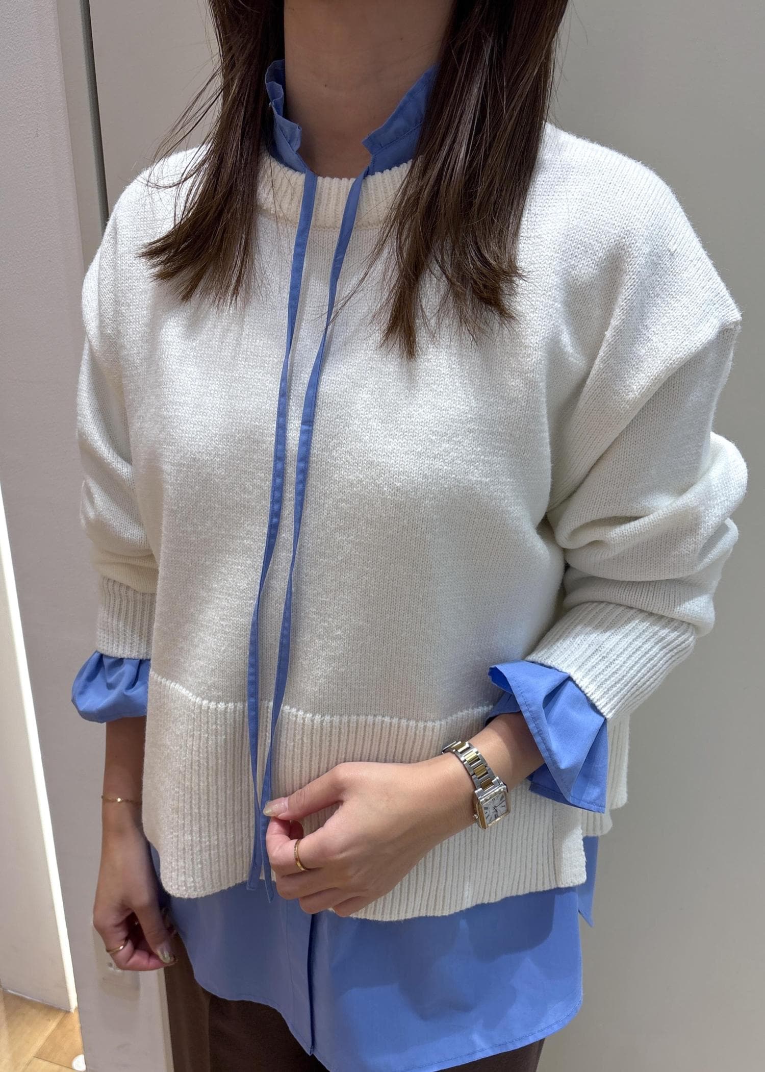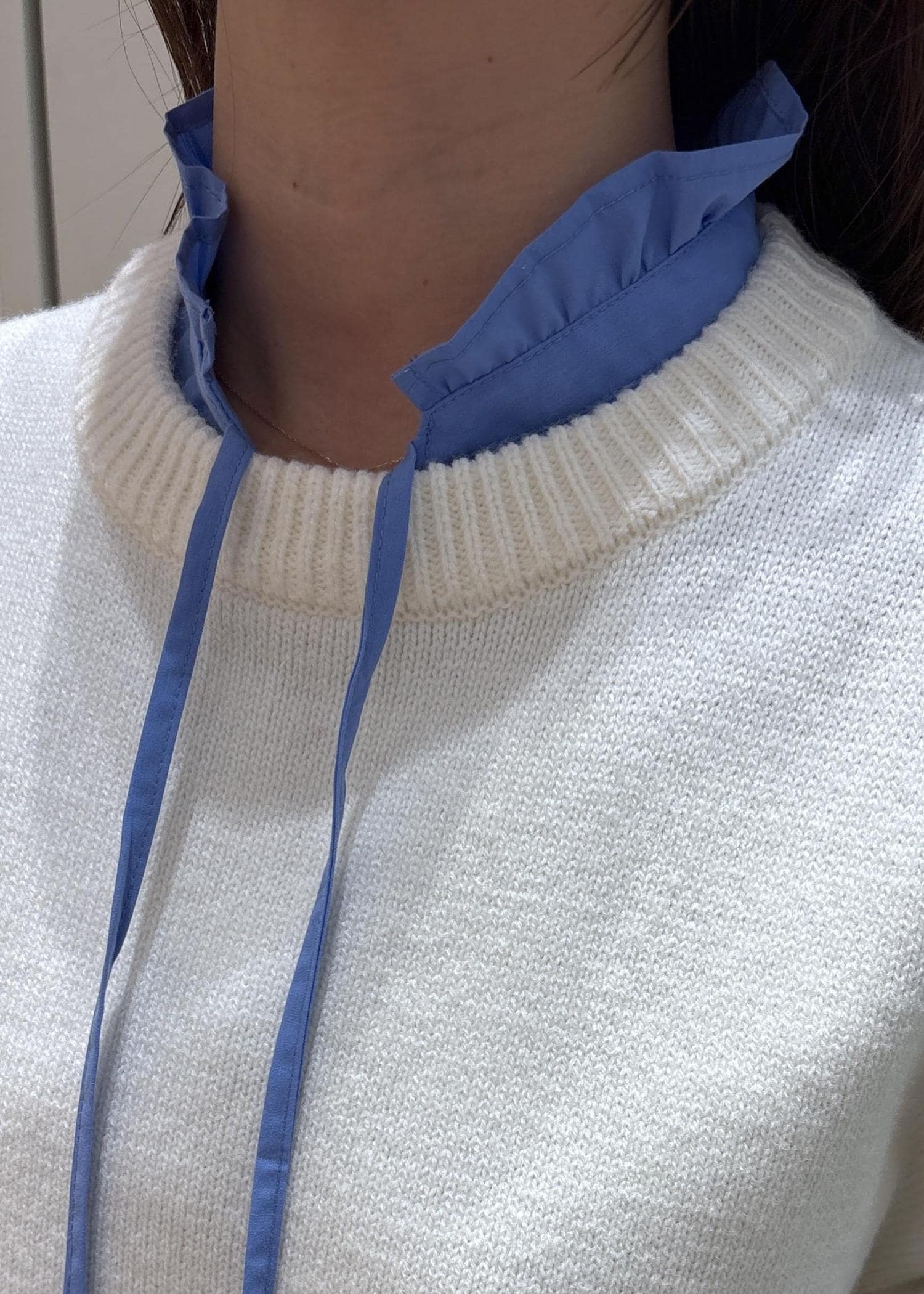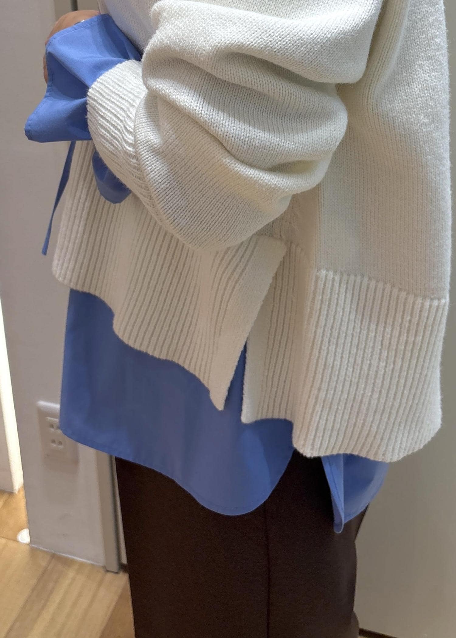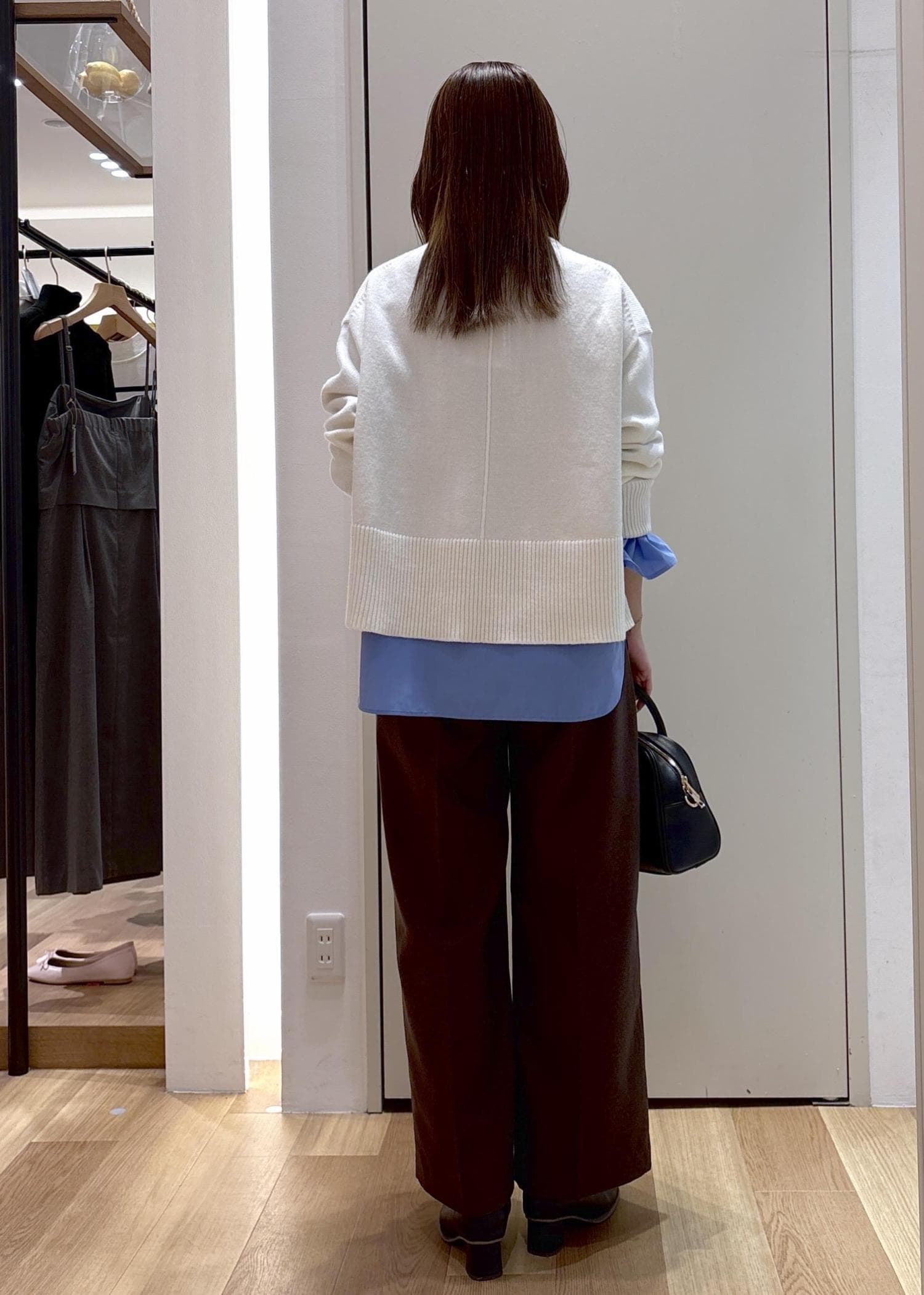 シンプルになりがちな白ニット×ワイドパンツにフリルブラウスをレイヤードしてこなれ感あるスタイリングにしました。