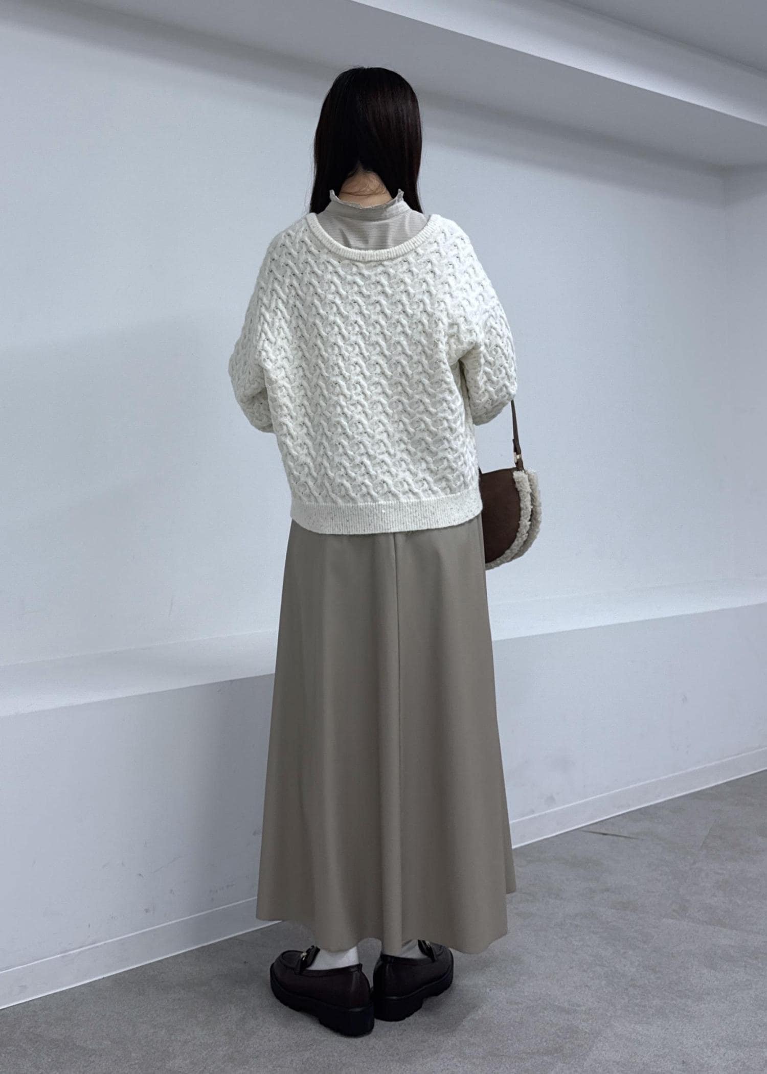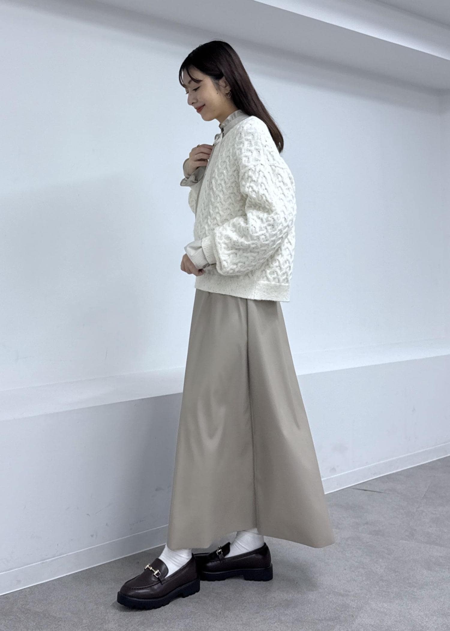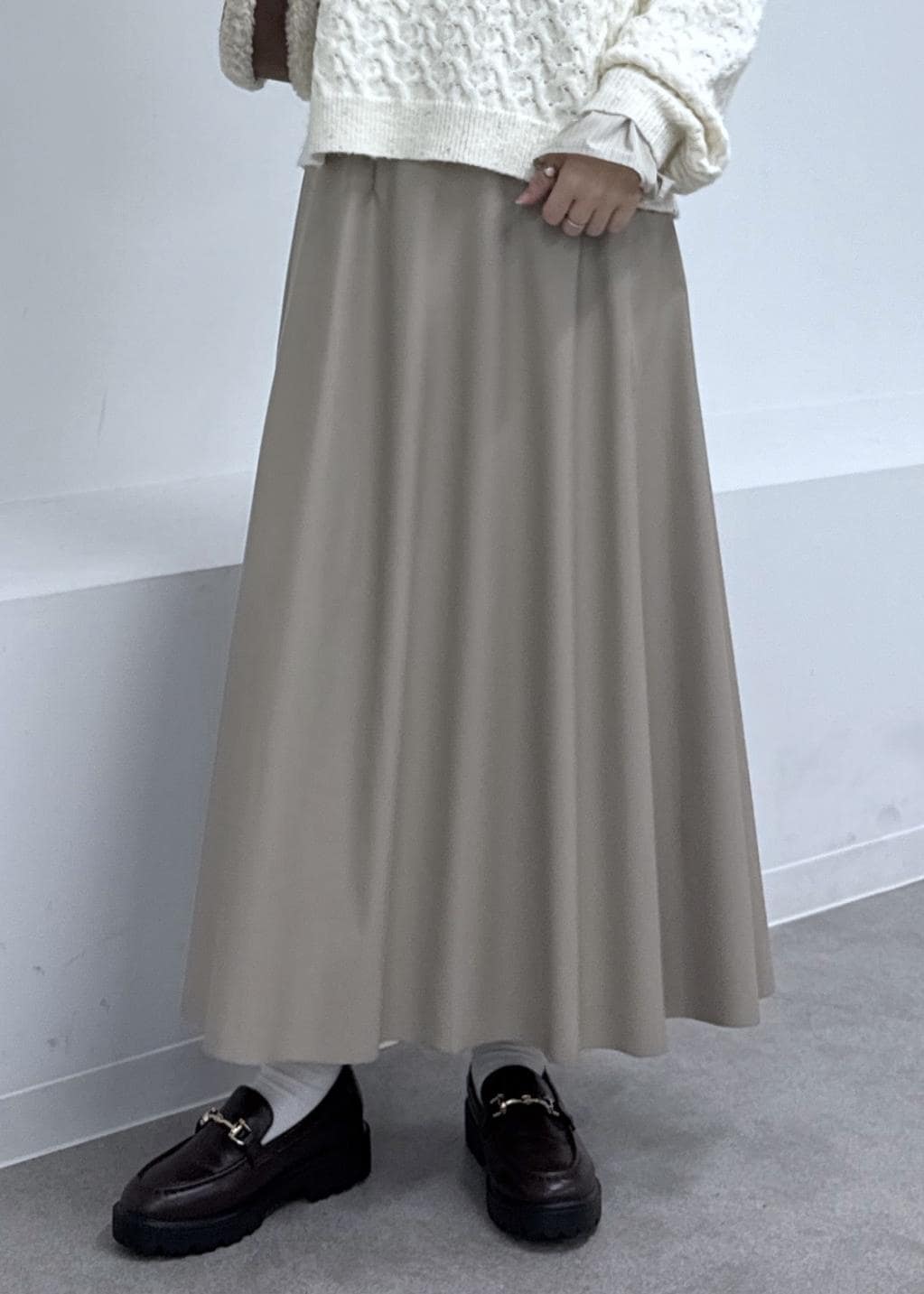 ROPÉ PICNICシンセティックレザーフレアロングスカートベージュ / M¥4,796レビューしっとり感のあるレザーで嫌なテカリはなくマットな生地。緩やかなAラインなので上品さがあります。着丈は162㎝でくるぶしより少し上くらいだったので秋冬はミドルブーツと合わせたりしたいです。