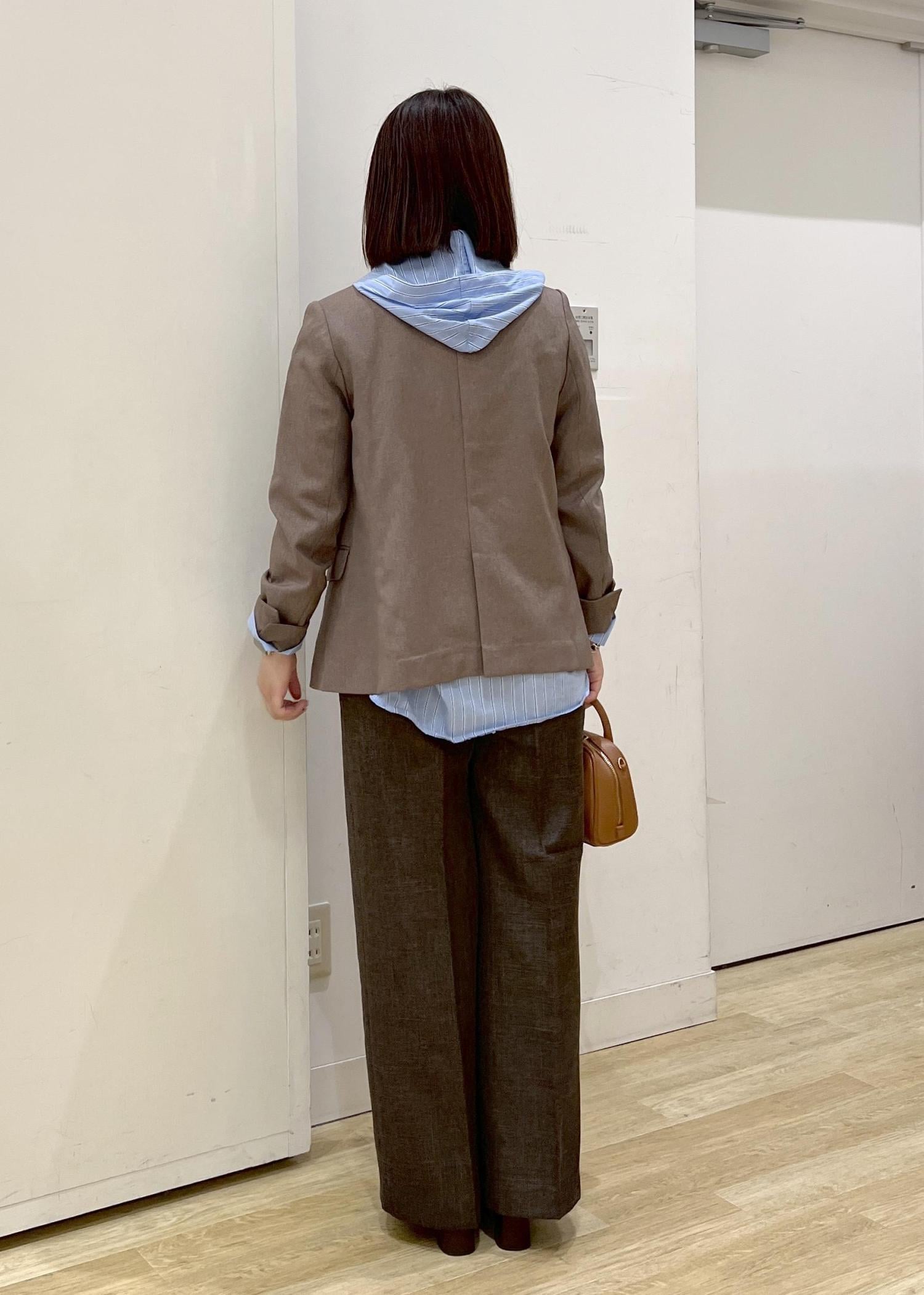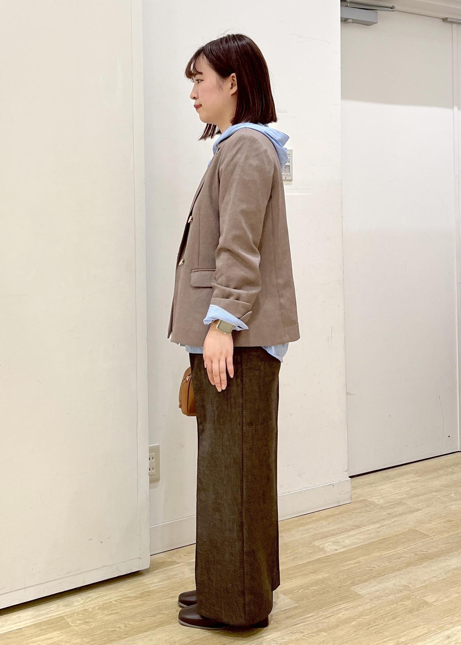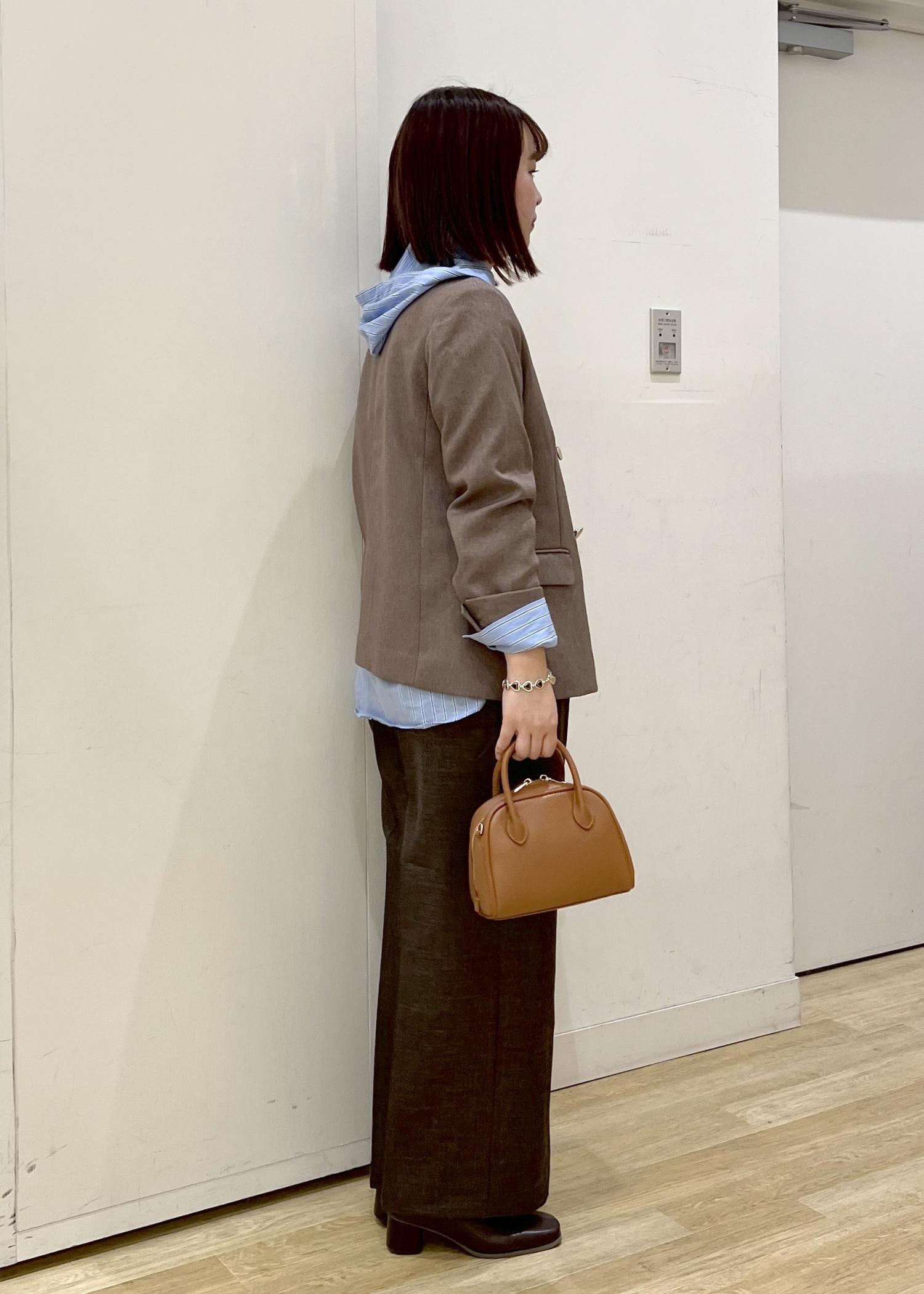 セットアップのアイテムを上下それぞれ違うブラウンのものを選ぶことによって硬い印象にならないようにしました◎