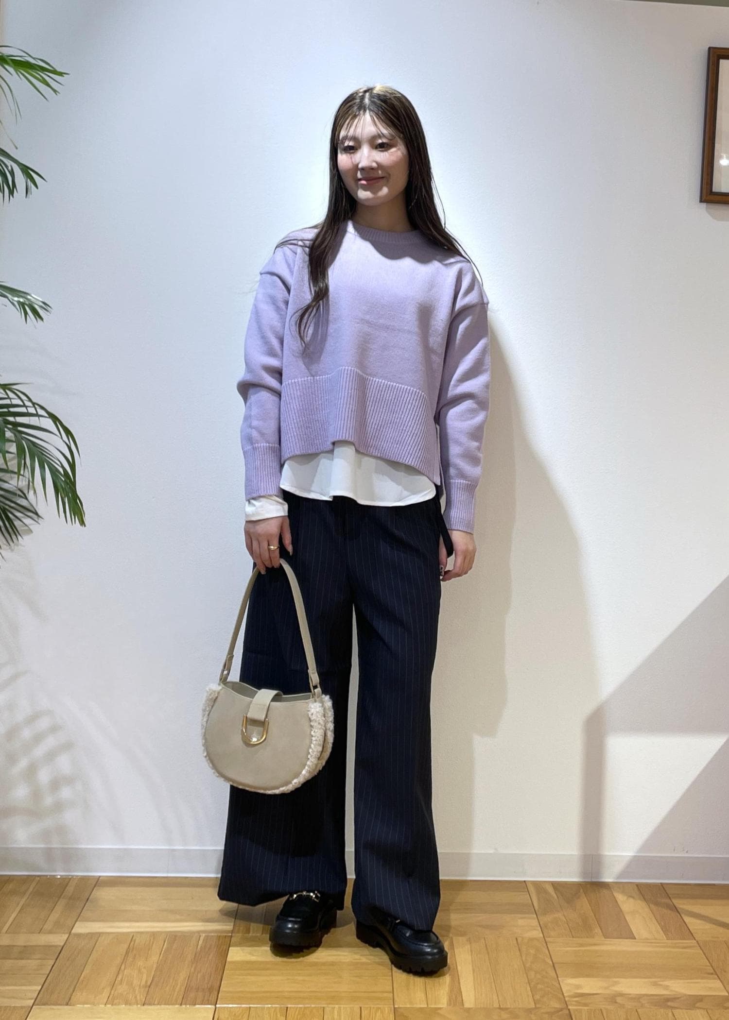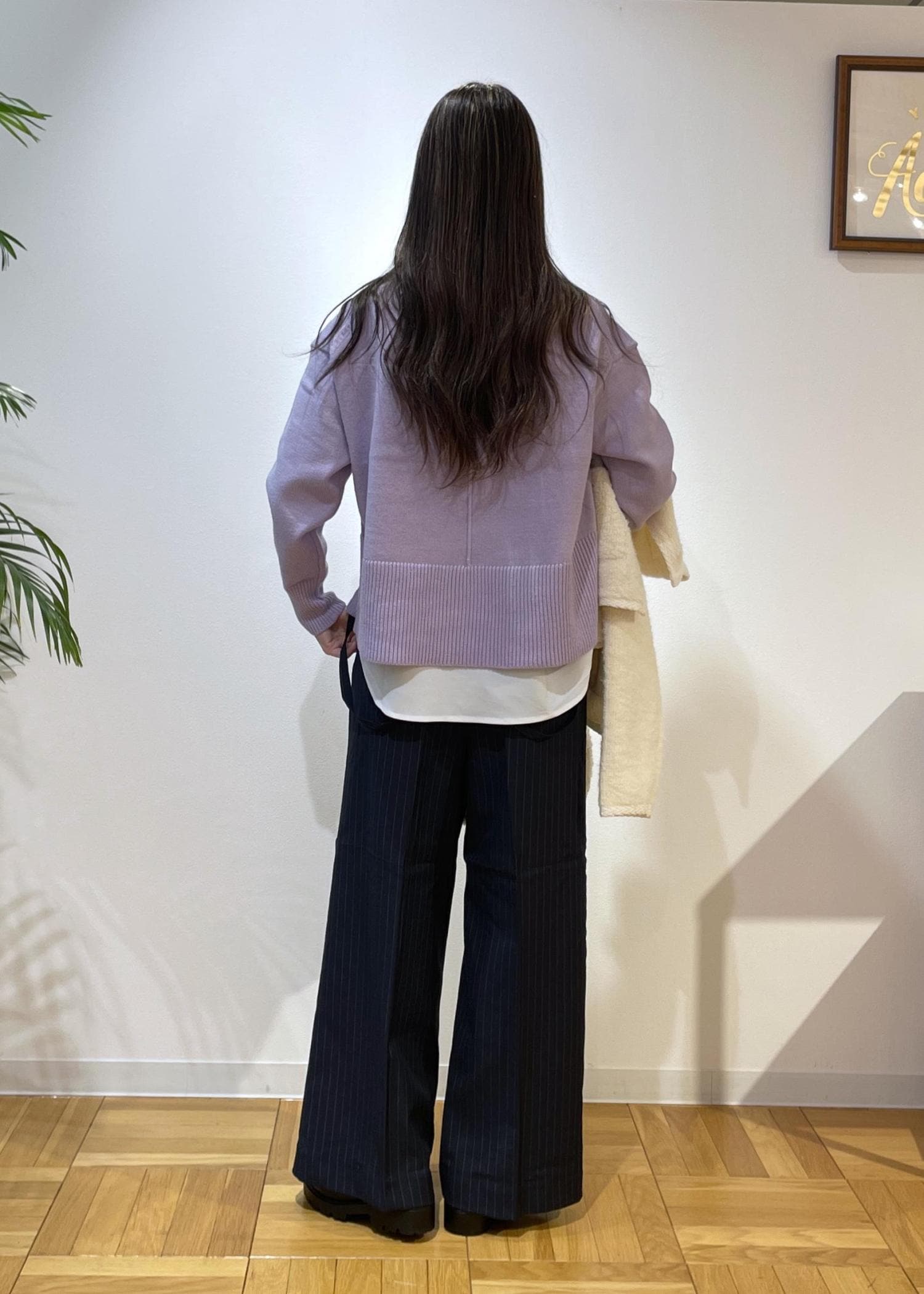 冬は落ち着いたお色味を着がちですが、キナリのカーディガンと紫のニットプルオーバーで明るく。