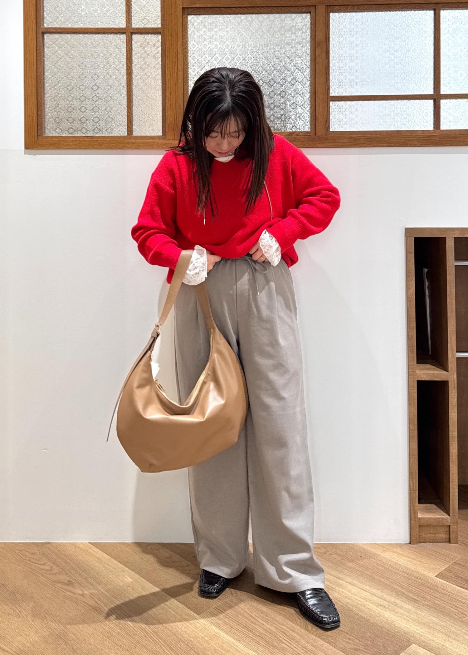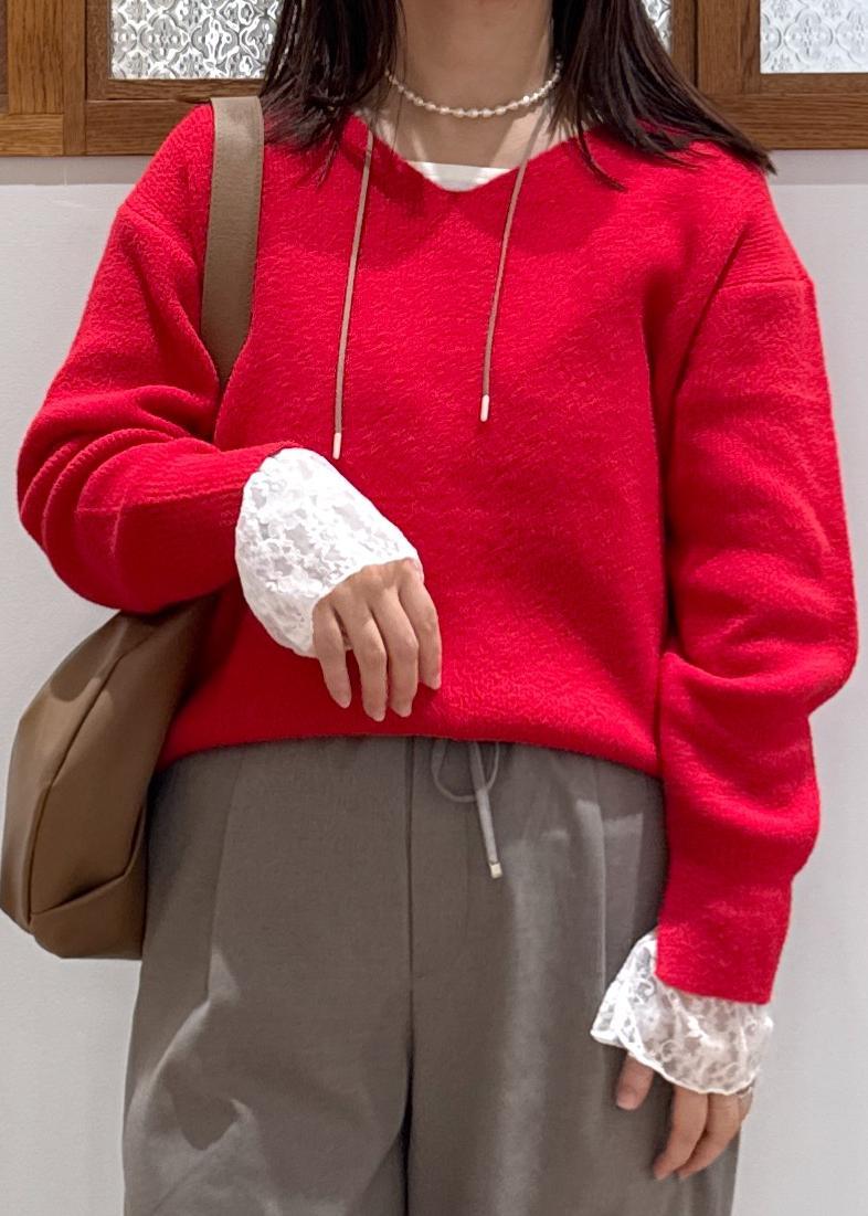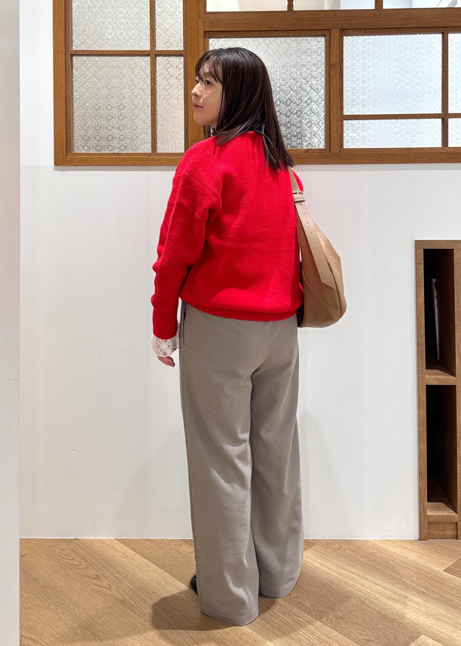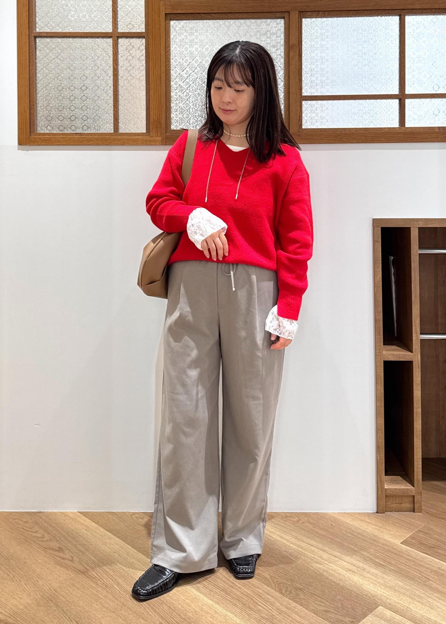 秋冬のムードにぴったりな赤ニットには、ベージュやブラウンの定番合わせが好きです!