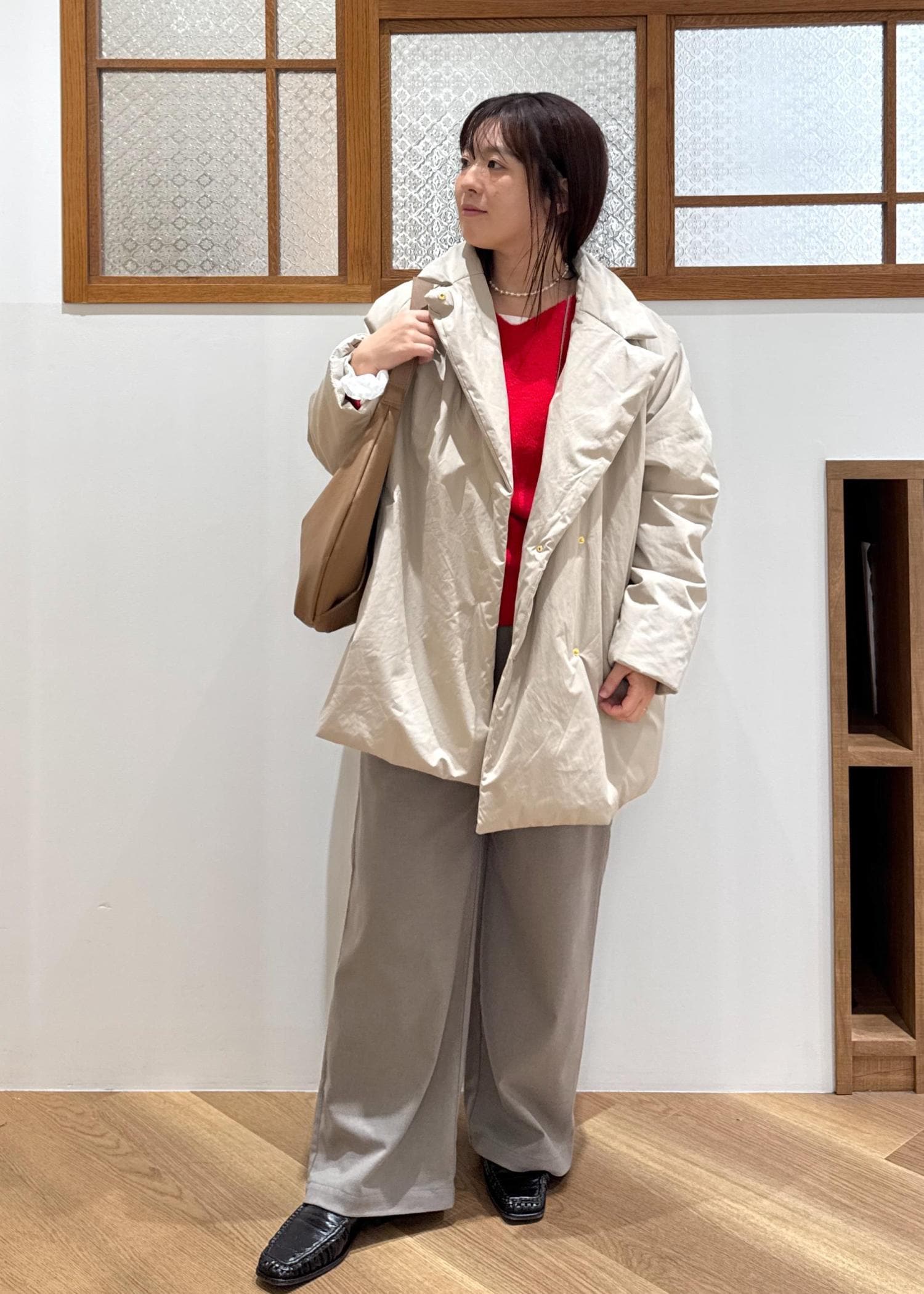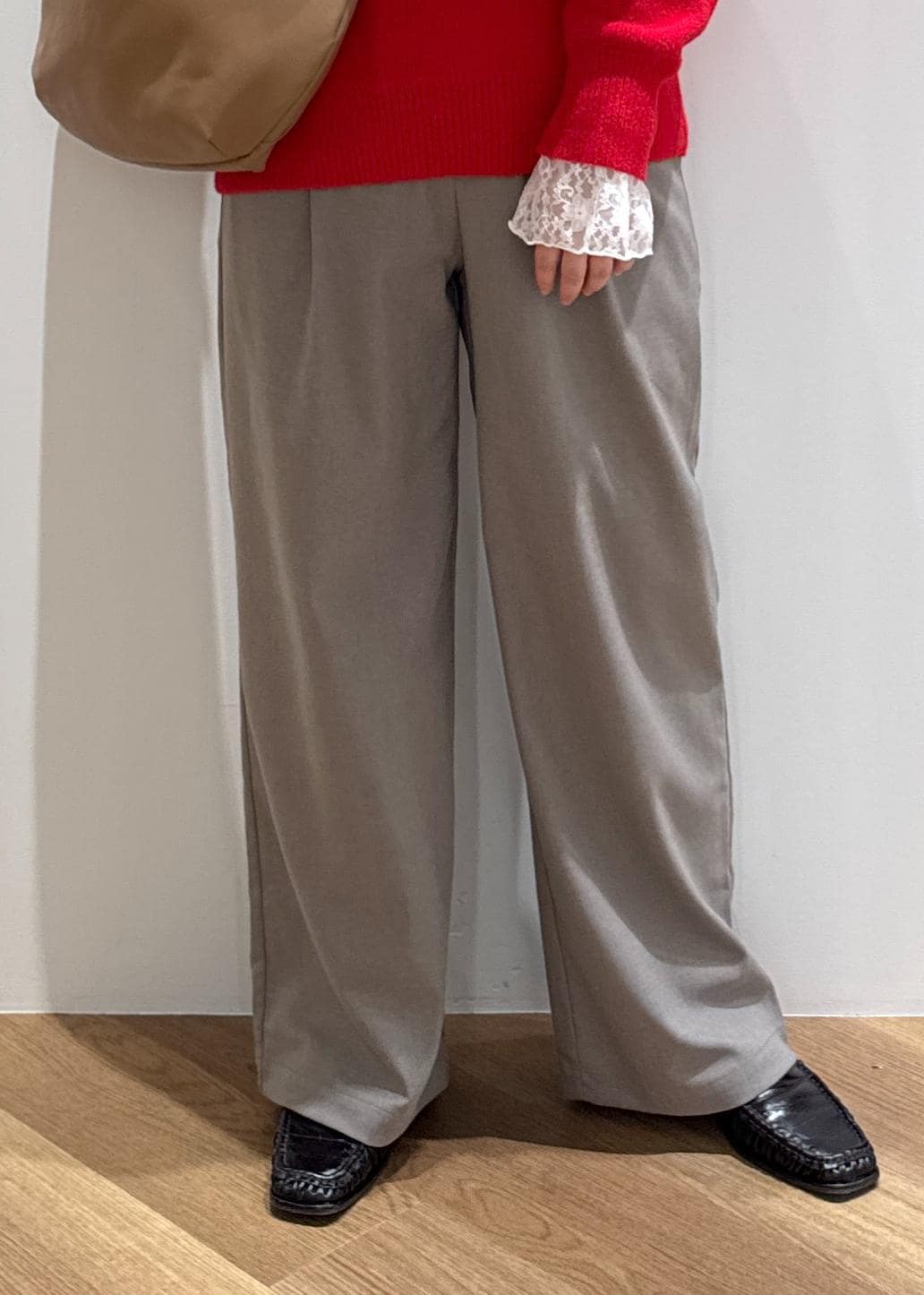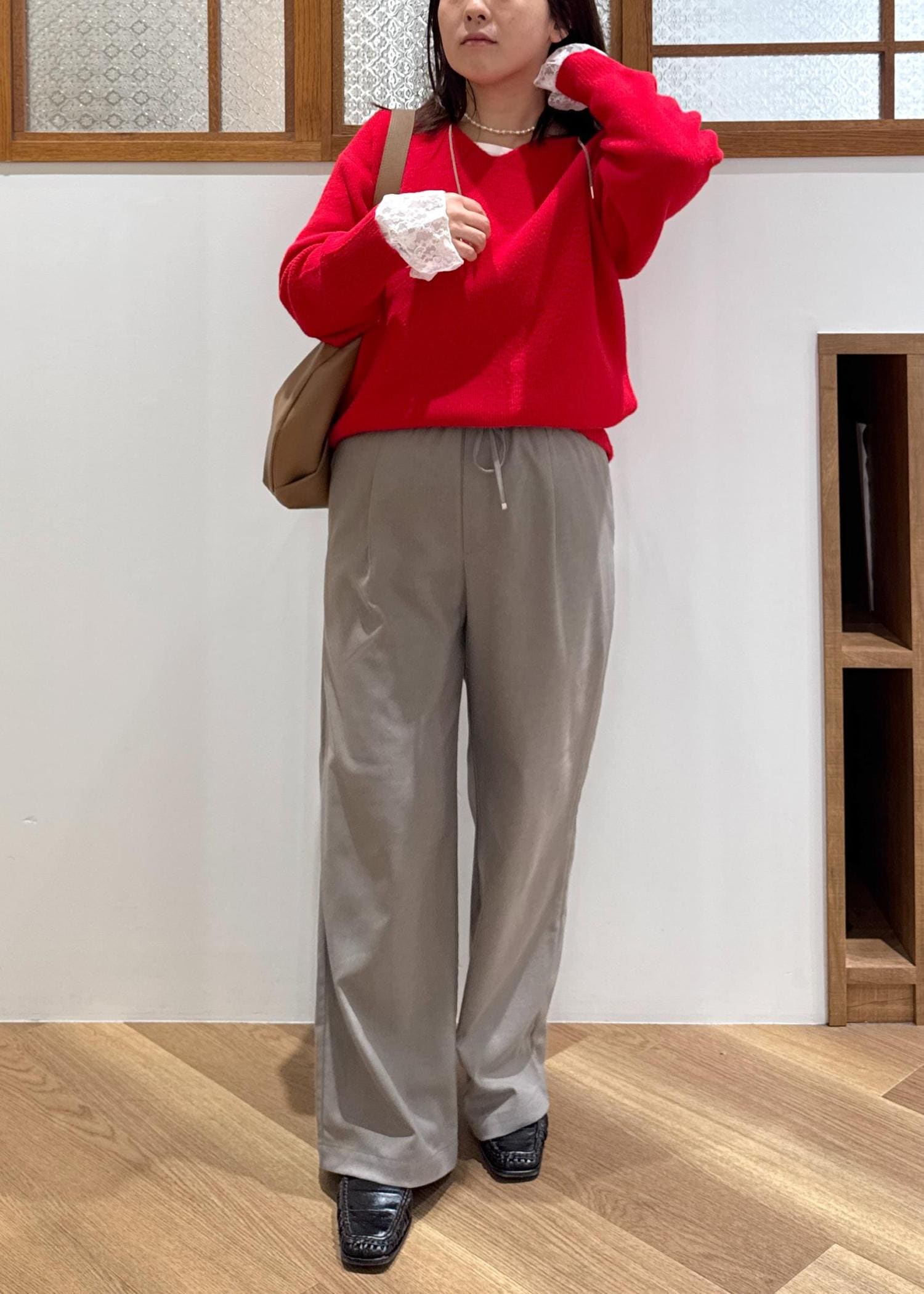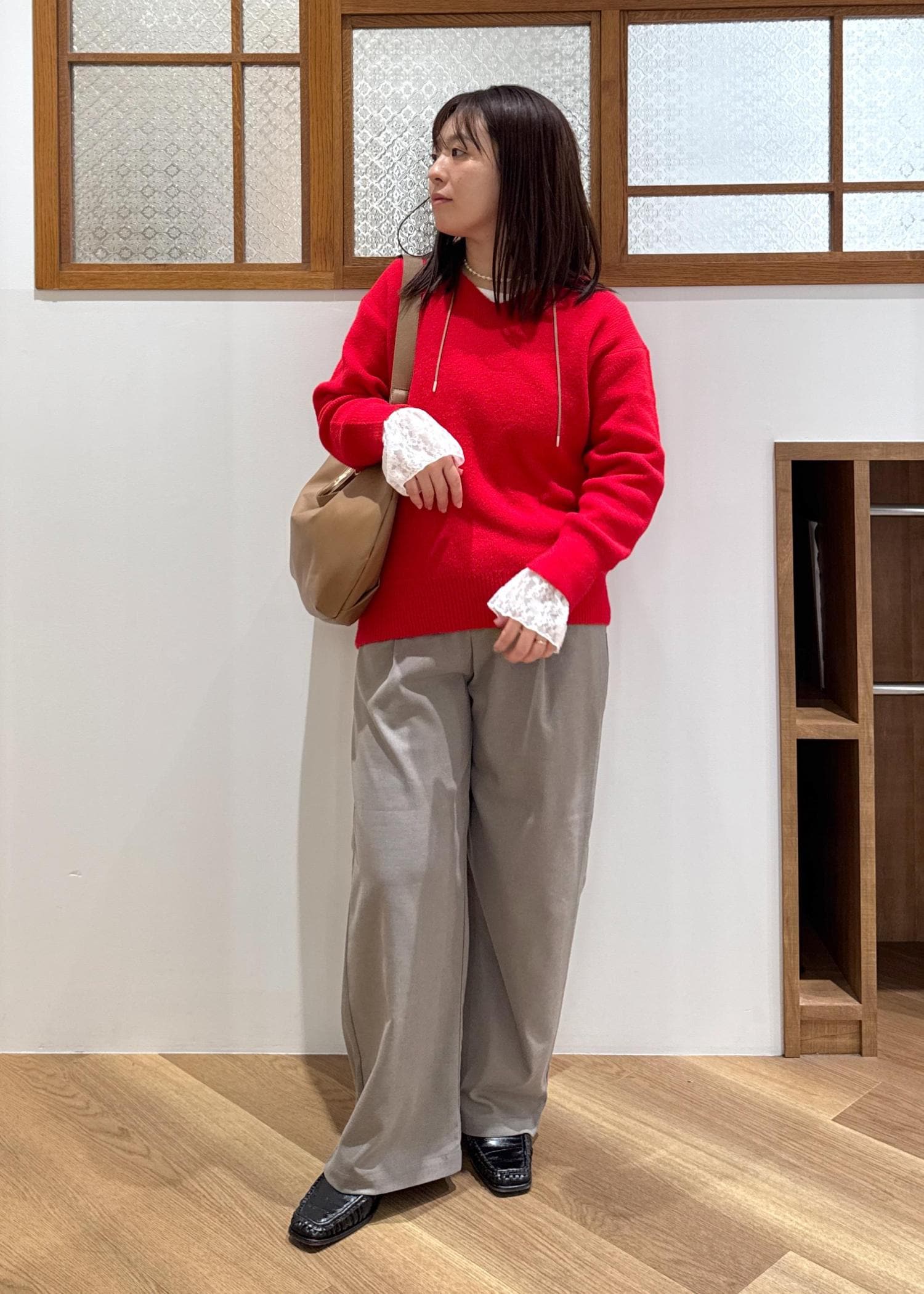 秋冬のムードにぴったりな赤ニットには、ベージュやブラウンの定番合わせが好きです!