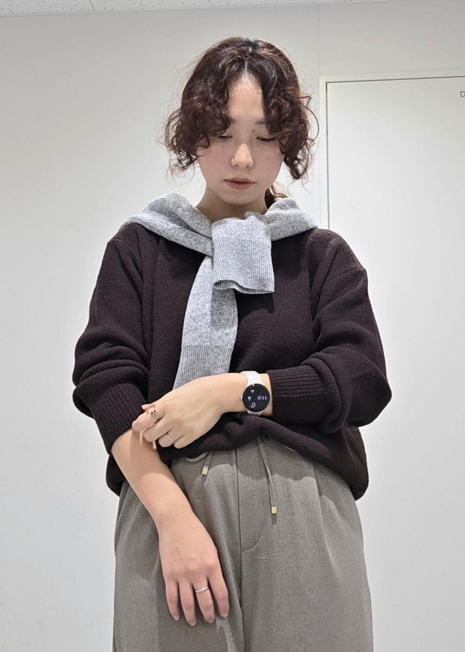 私は低身長なので袖をまくって手首を出し、Vネックのニットを選んでよりスッキリ見えるようにしました♡
