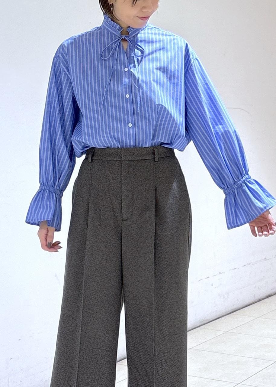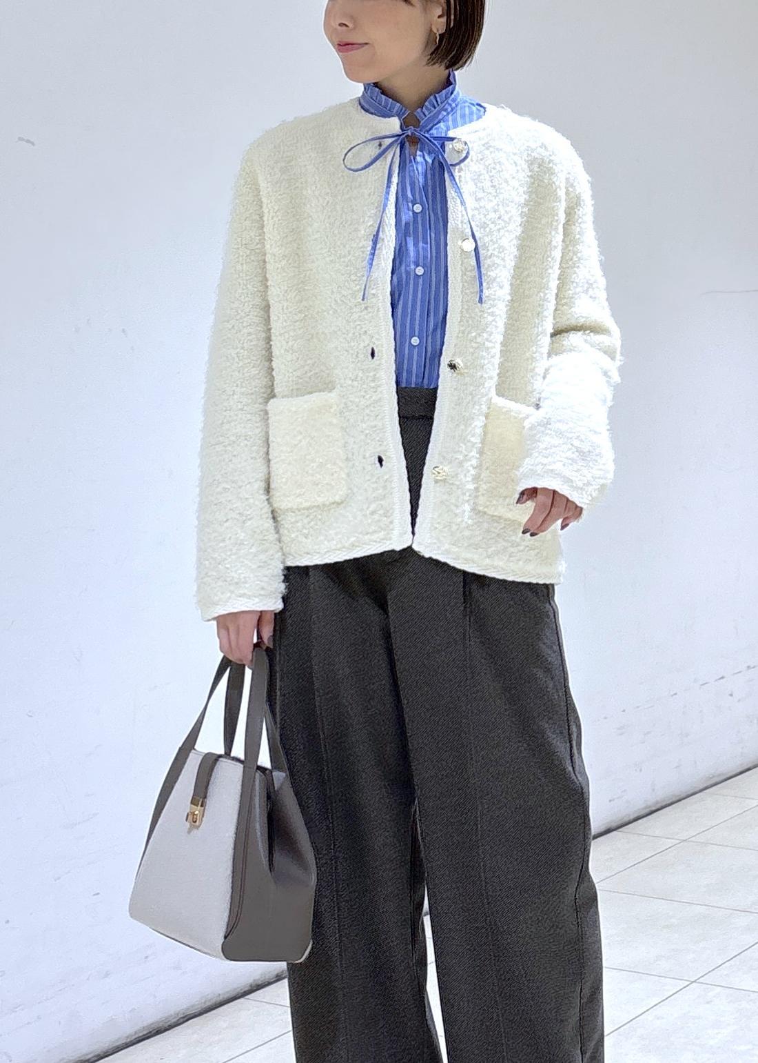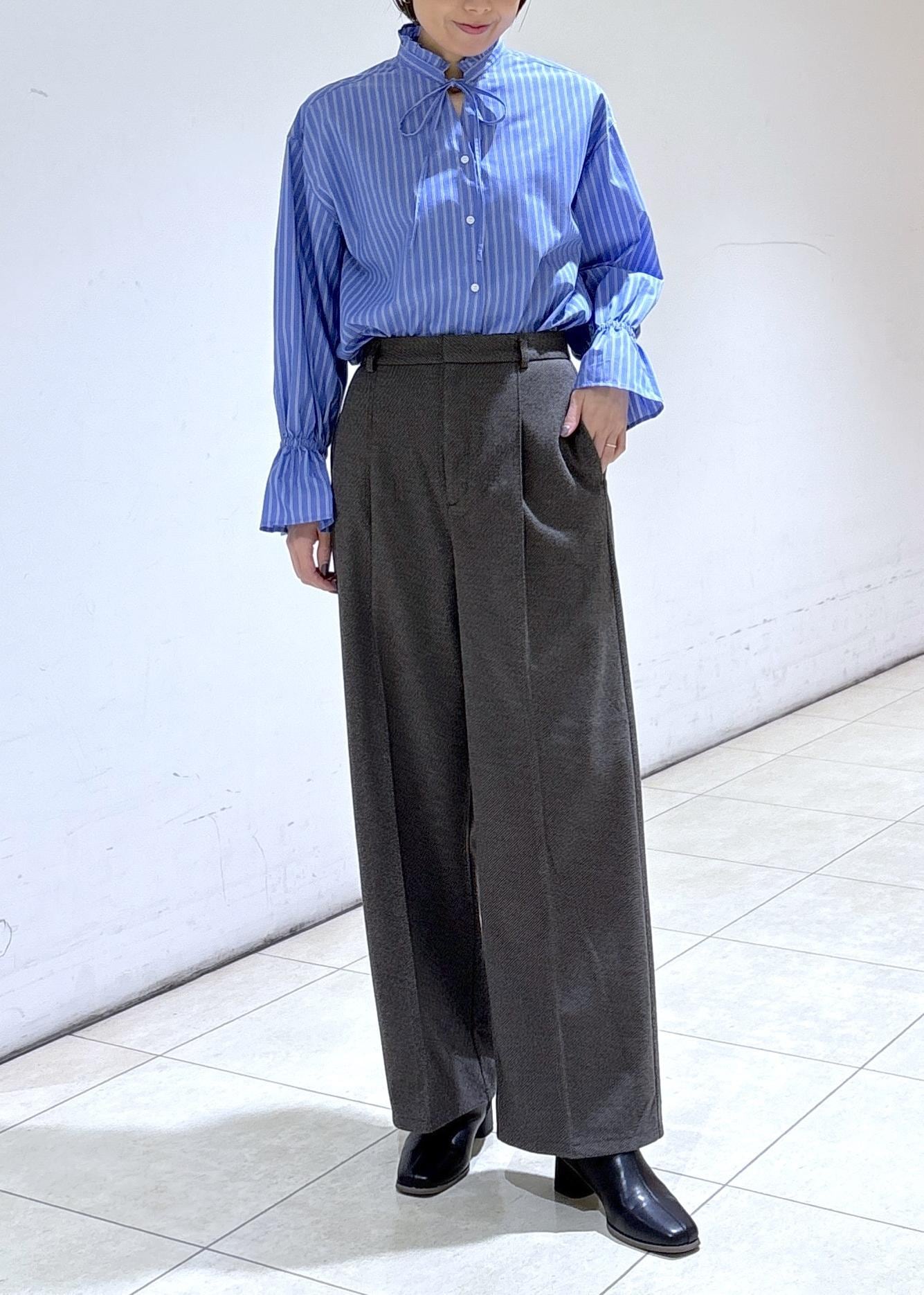 ニットやスウェットを重ねると首元のフリルがワンポイントになるので冬はレイヤードにおすすめです。