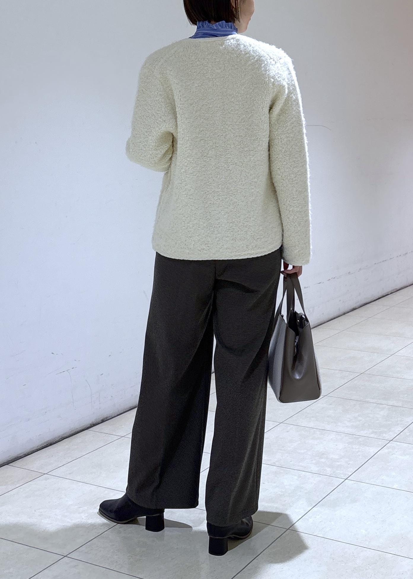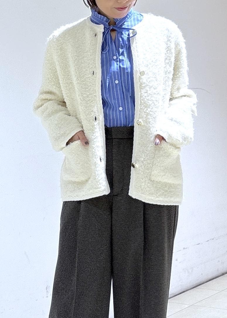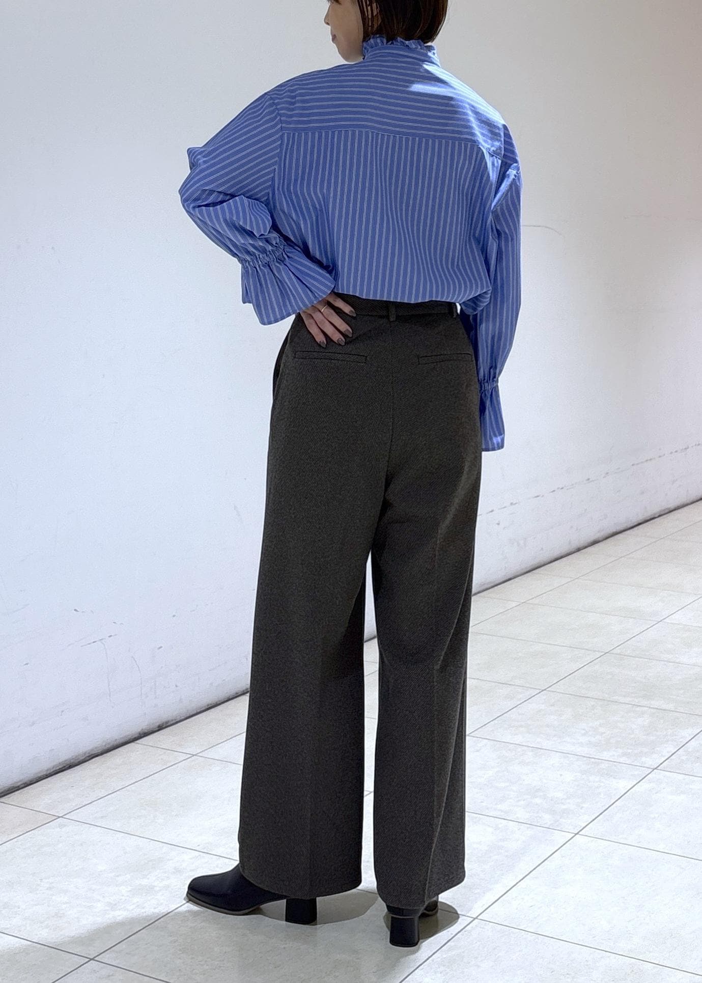 ニットやスウェットを重ねると首元のフリルがワンポイントになるので冬はレイヤードにおすすめです。