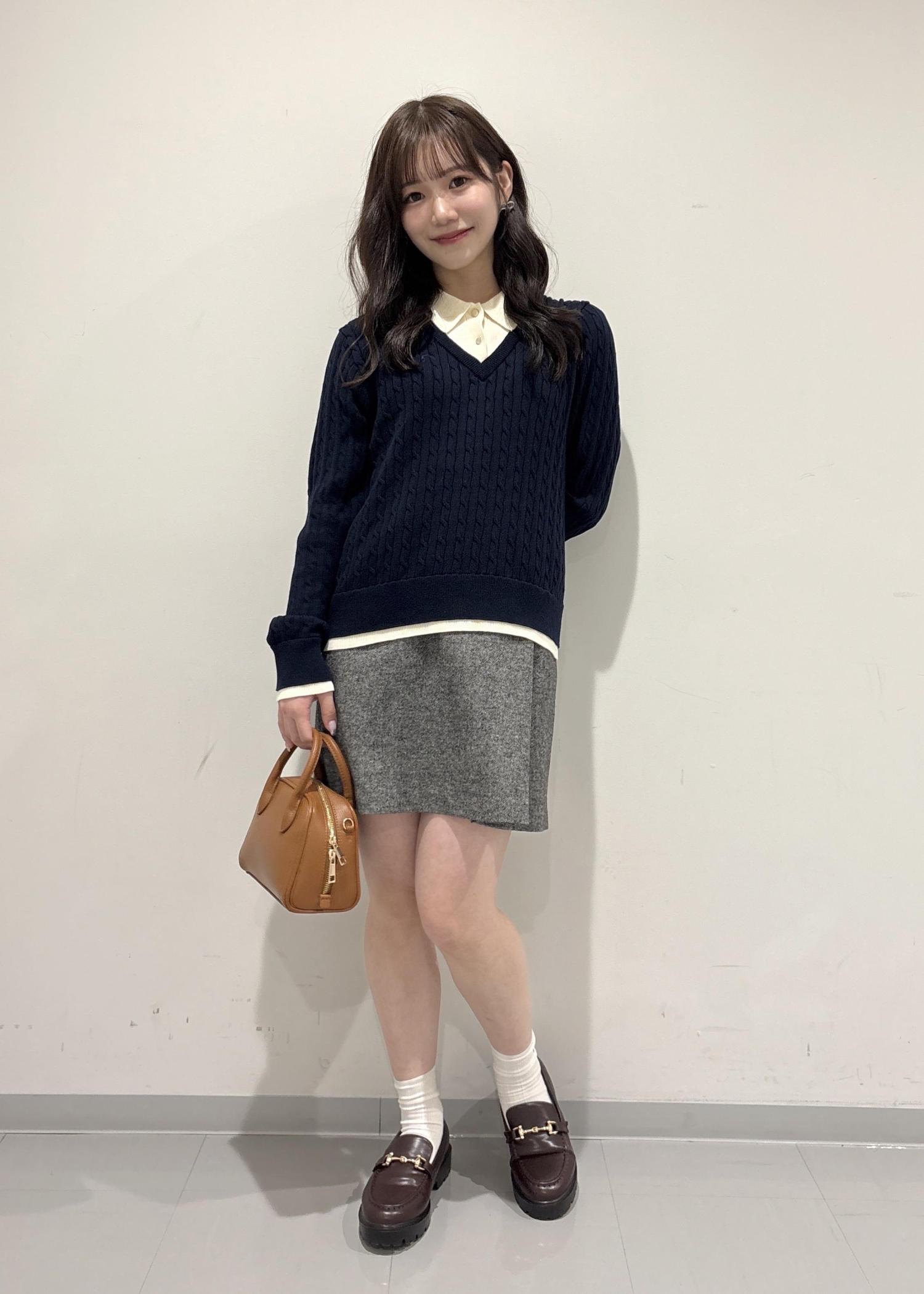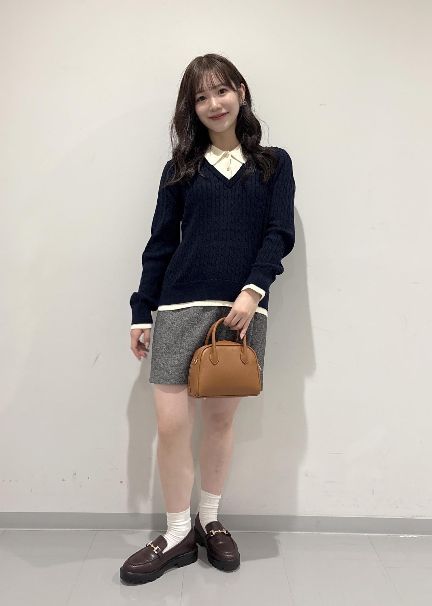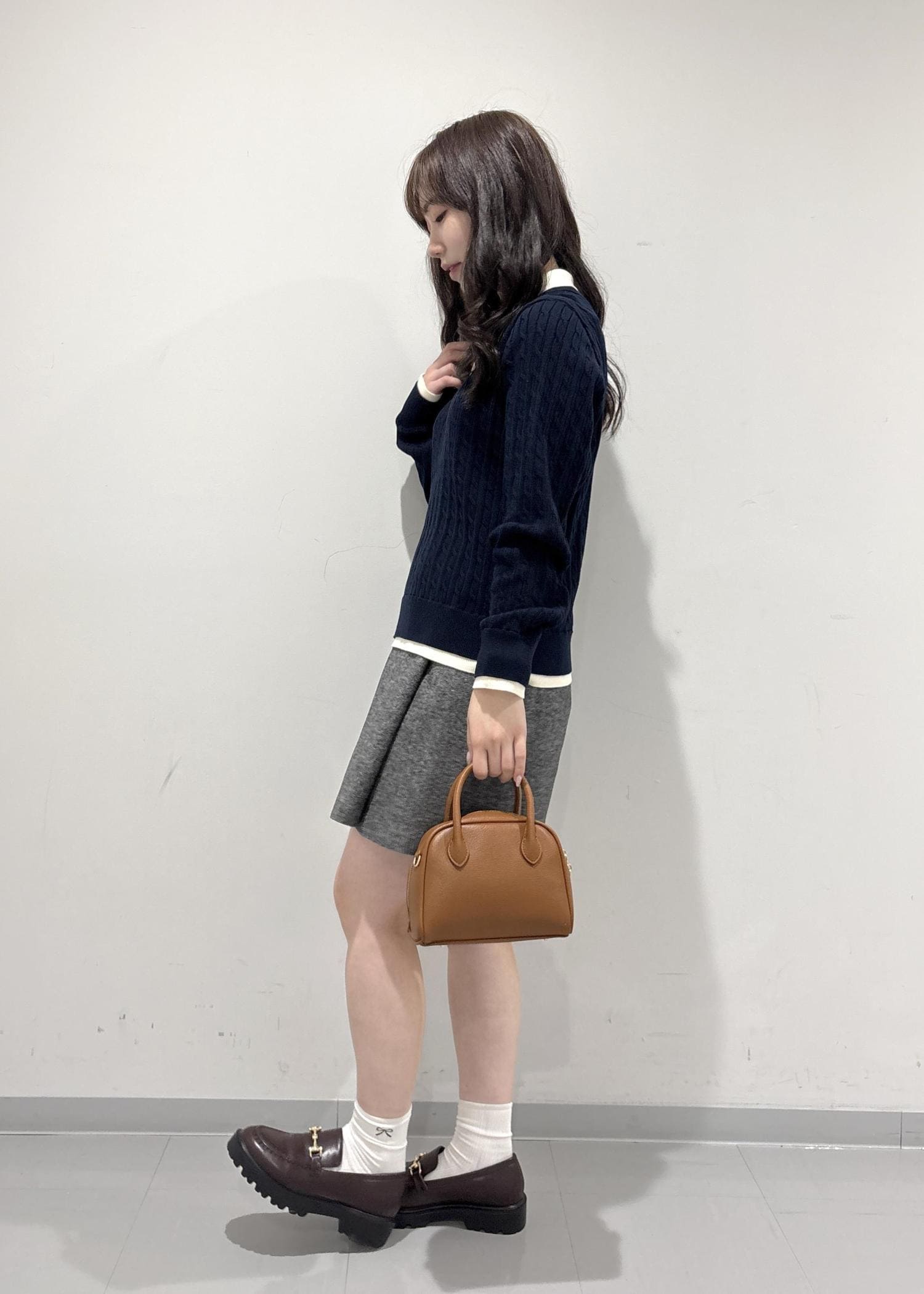 こちらのコーデのテーマは、韓国の学生をイメージしてみました!フェイクレイヤードで秋っぽさと学生感がより感じられます!膝上のグレーのミニスカートとローファーで脚を綺麗に見せてみました!ブラウンのミニバッグでこなれ感を出して、秋っぽい韓国風の学生をイメージしてみました!
