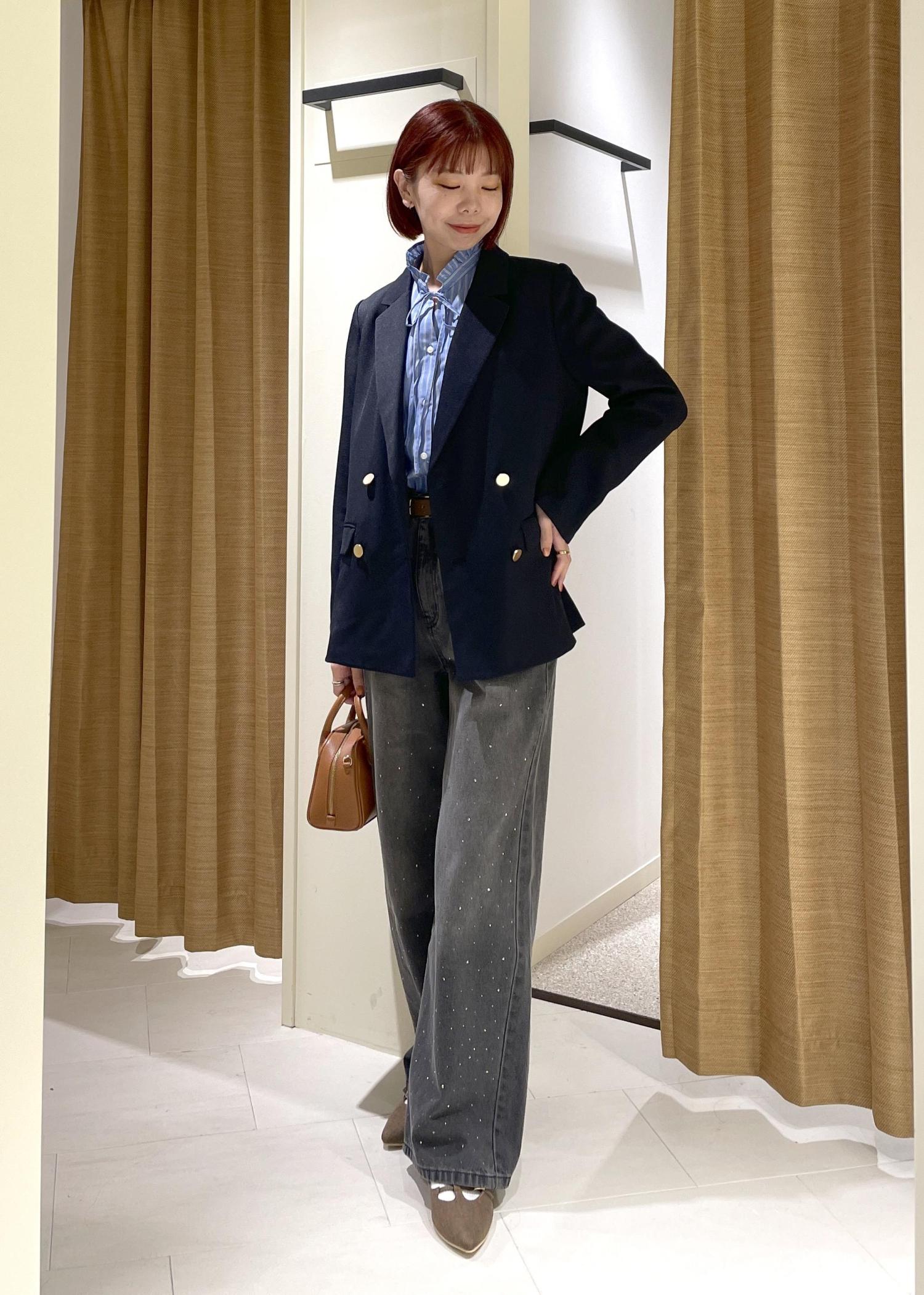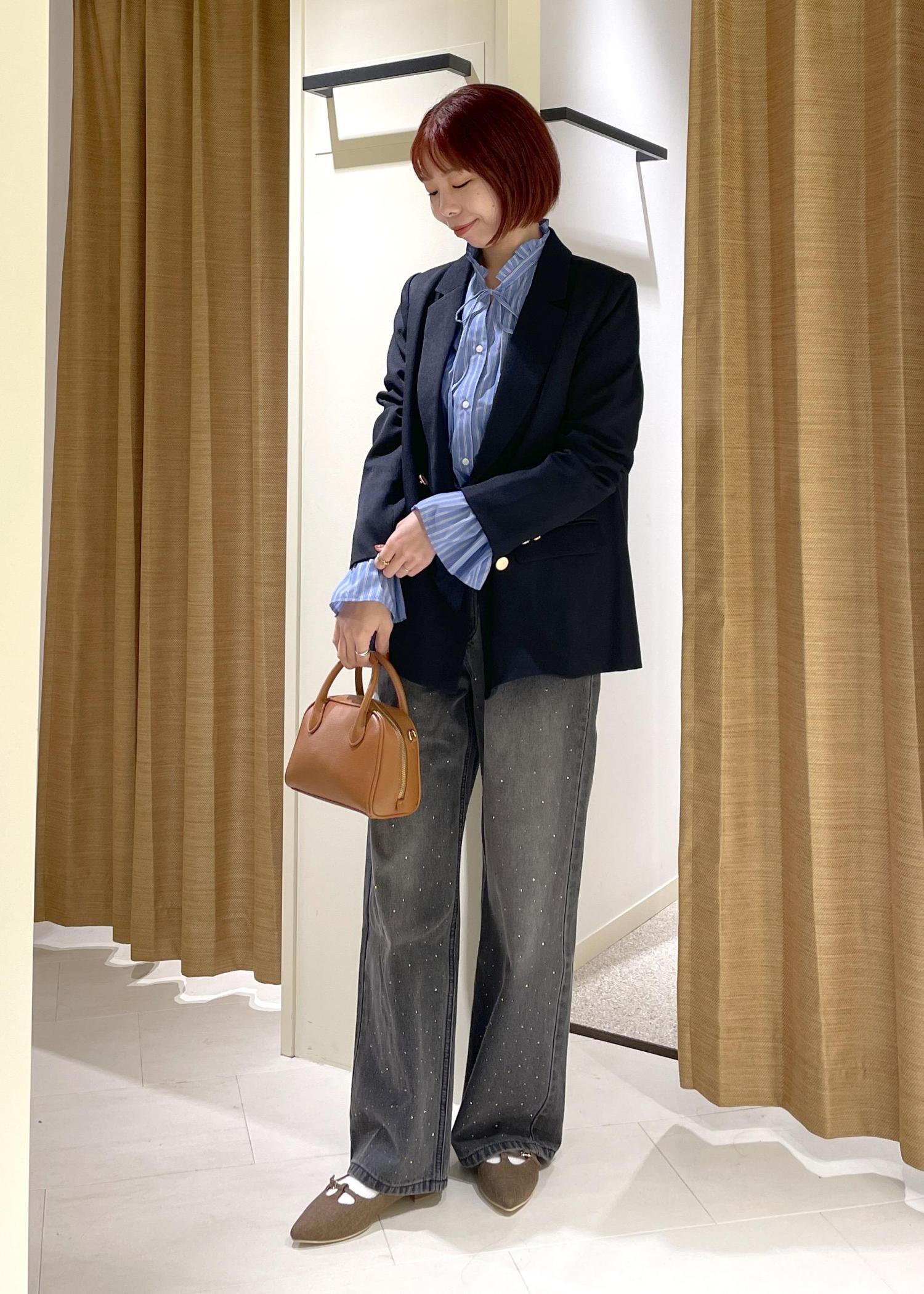 フリルシャツにビジューデニムを合わせたオンオフで着たいきれいめカジュアルコーデにまとめてみました。