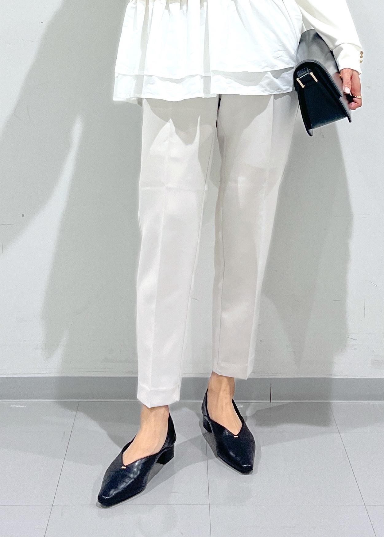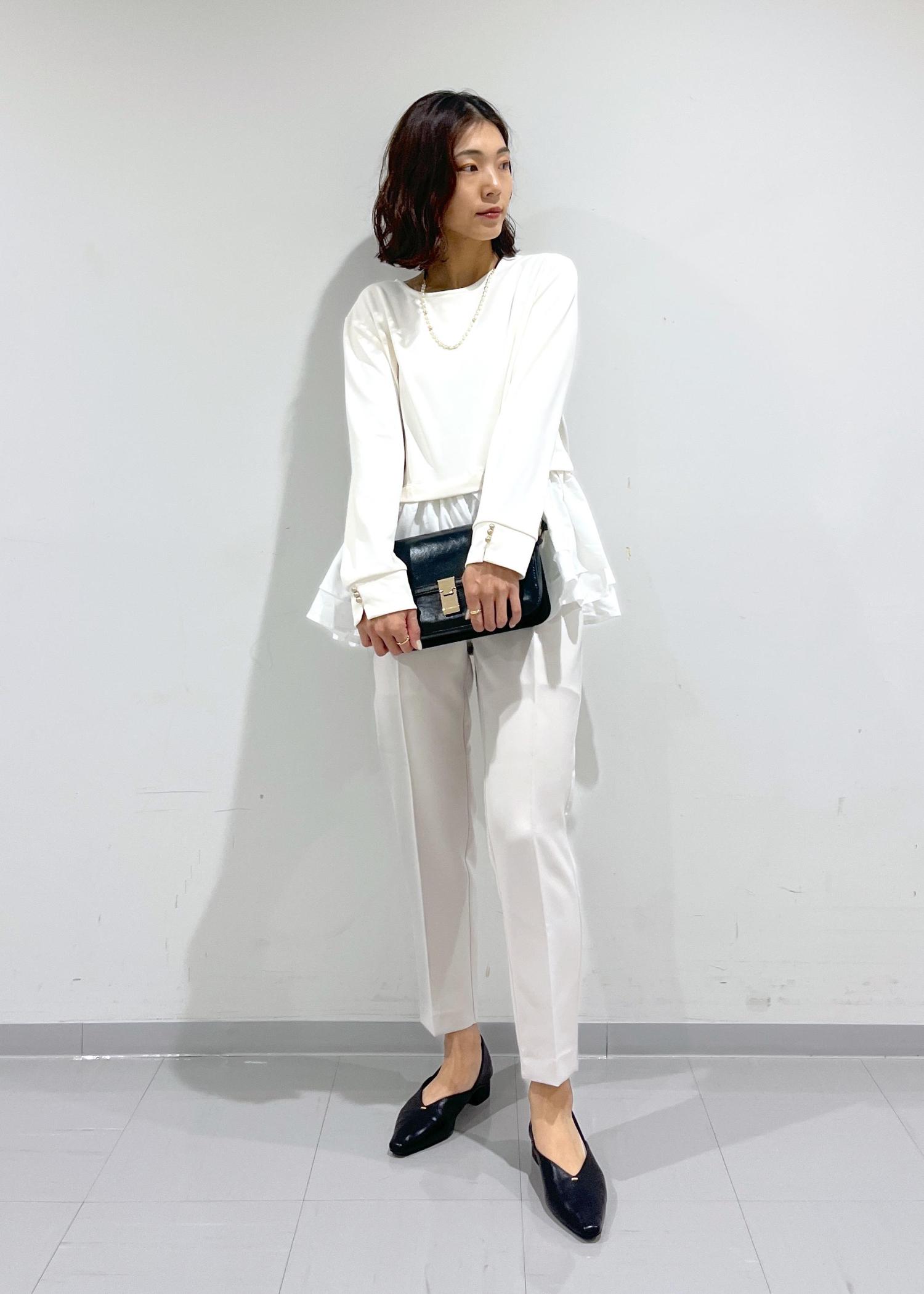 トップスはオフホワイト、パンツはライトグレーと真っ白ではないので、ニット素材でなくても寒々しさのない合わせに。