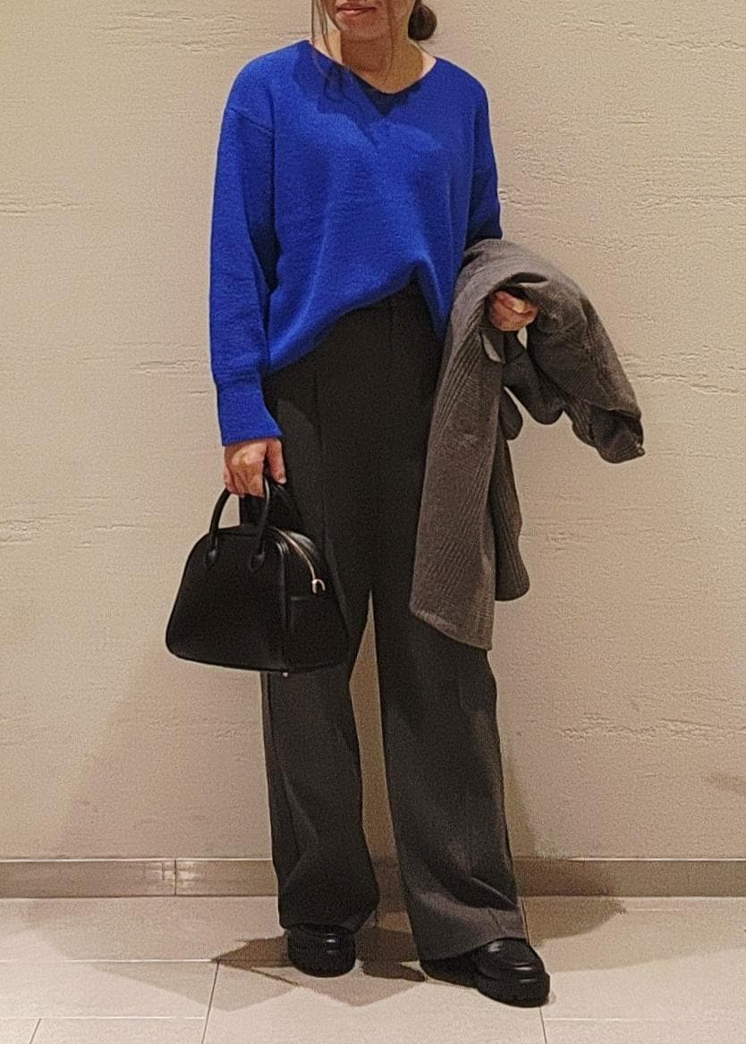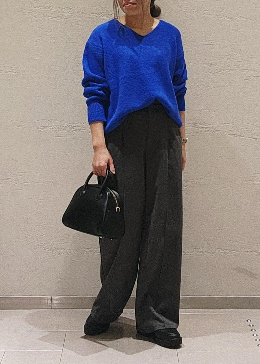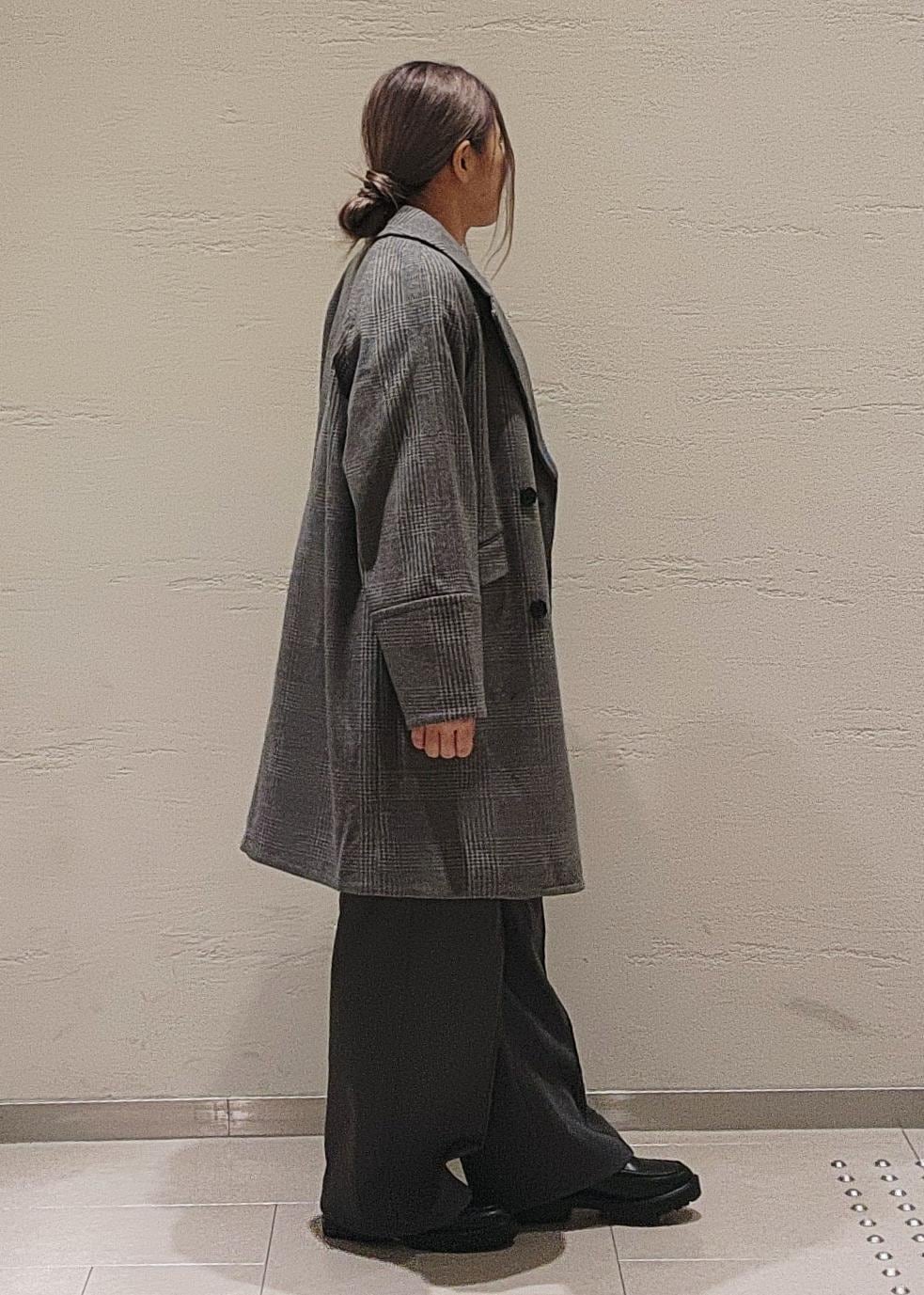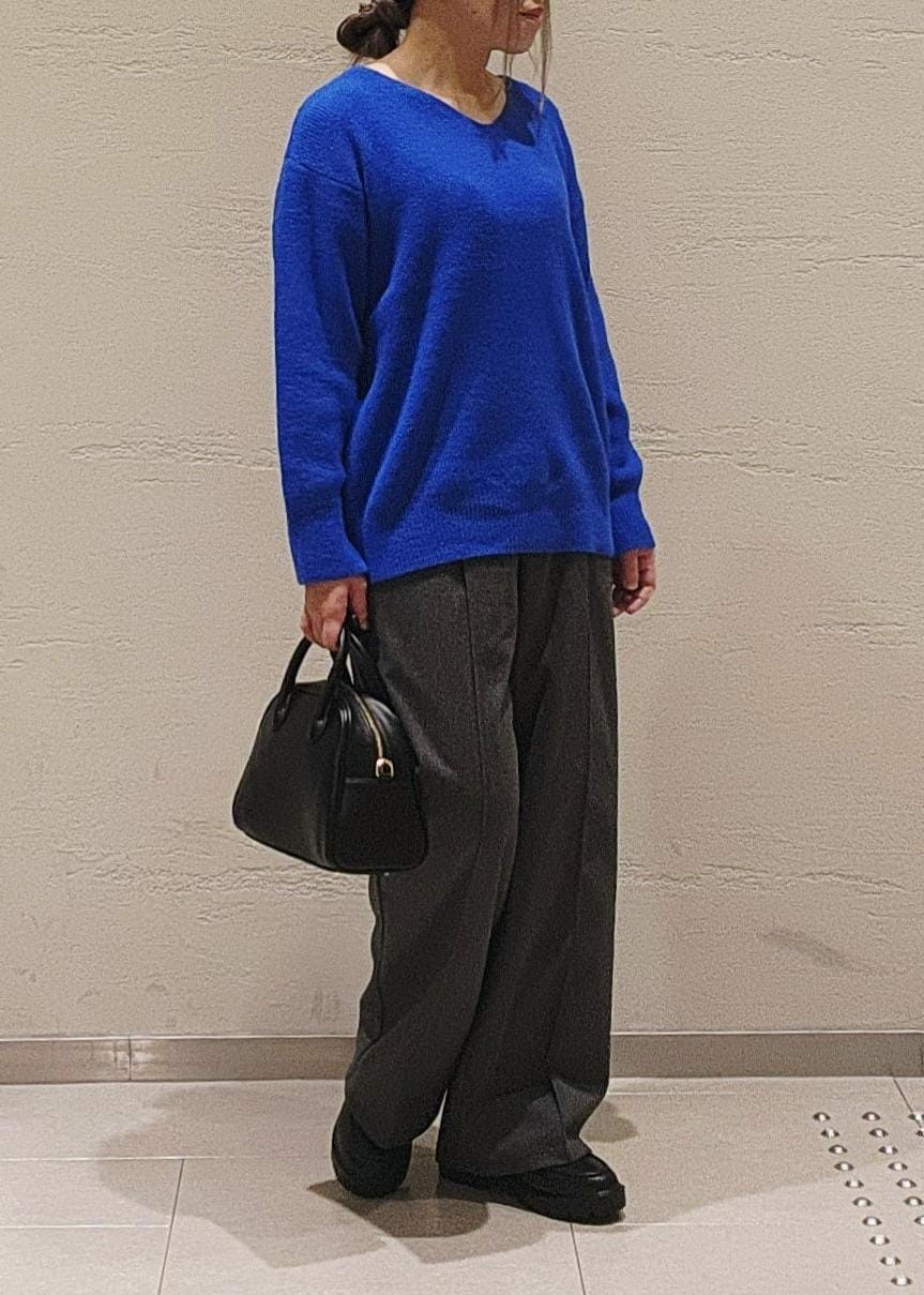 Pコートはオーバーサイズなので、Vネックニット+フロントインで目線を上げスタイルアップを意識しました。