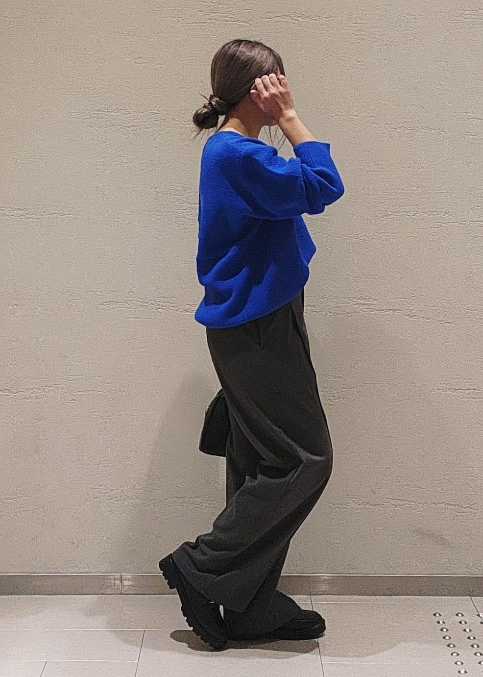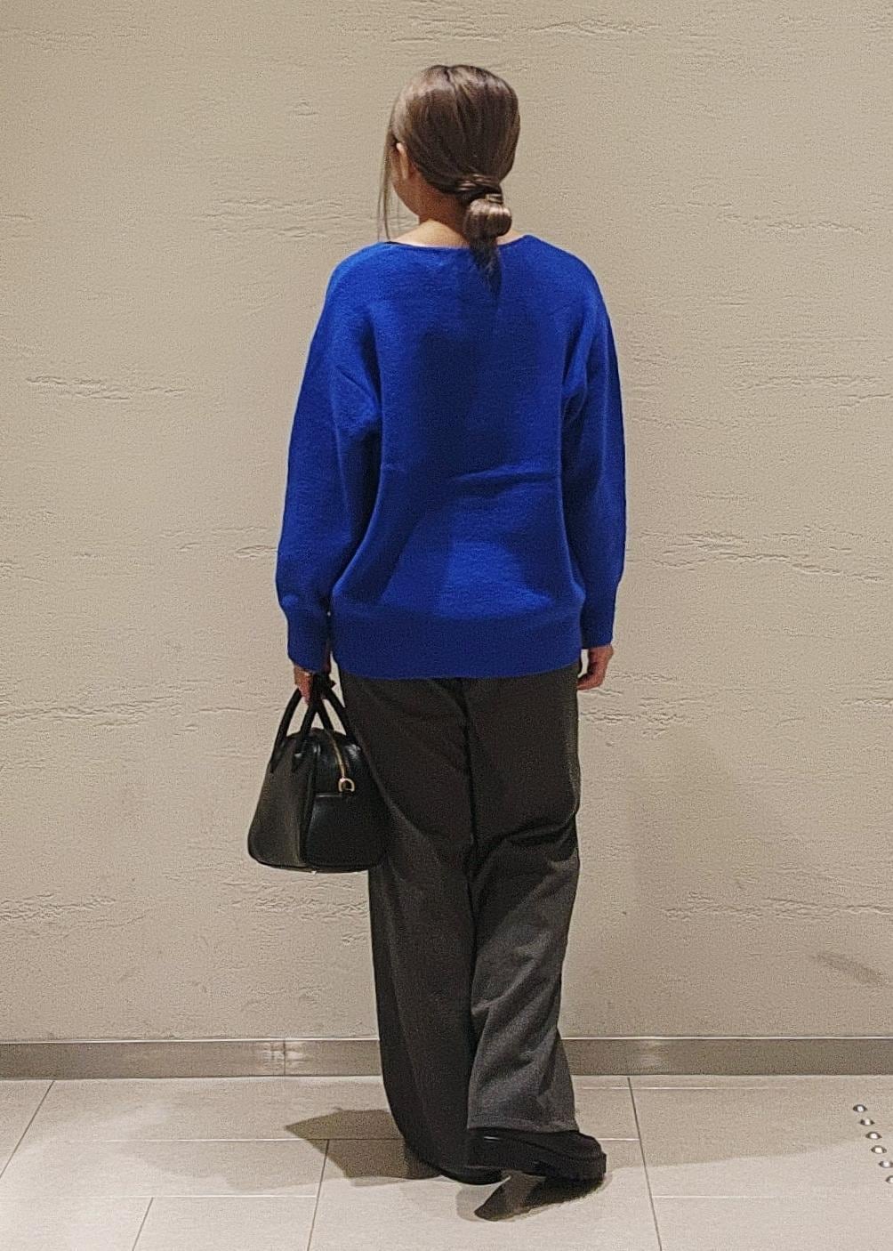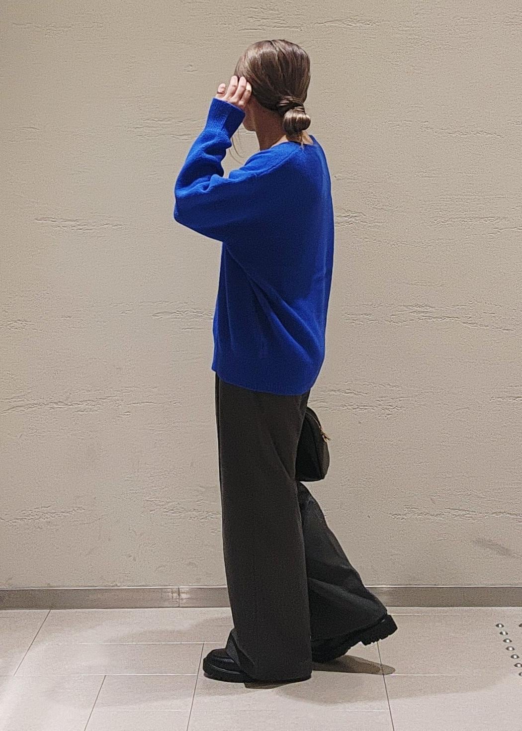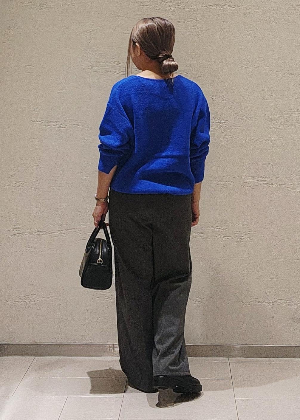 Pコートはオーバーサイズなので、Vネックニット+フロントインで目線を上げスタイルアップを意識しました。