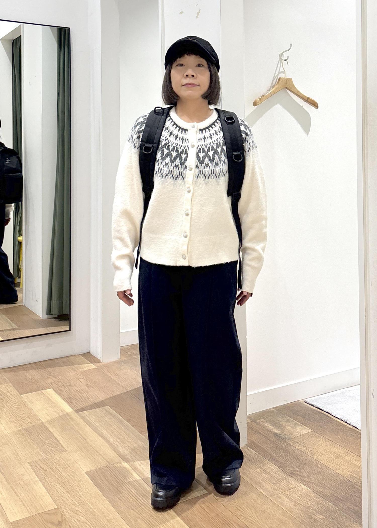 ノルディック柄のカーディガンと裏起毛のパンツ、ボア素材のキャップで暖かいコーディネートにしてみました⭐︎