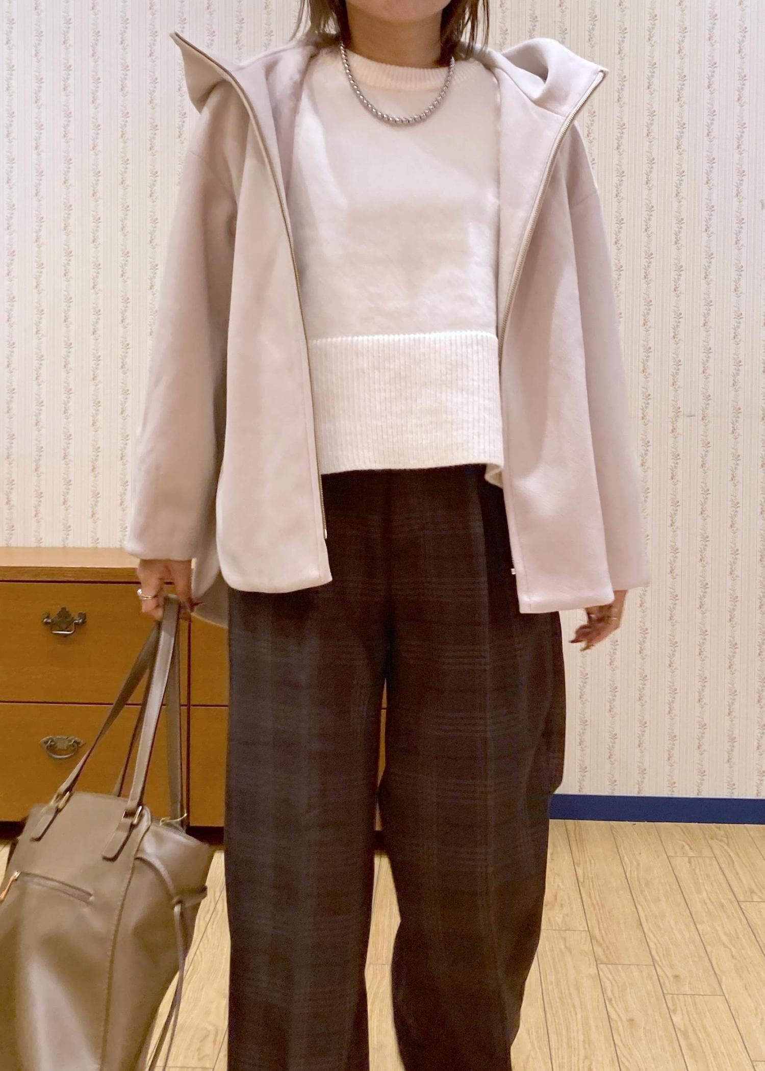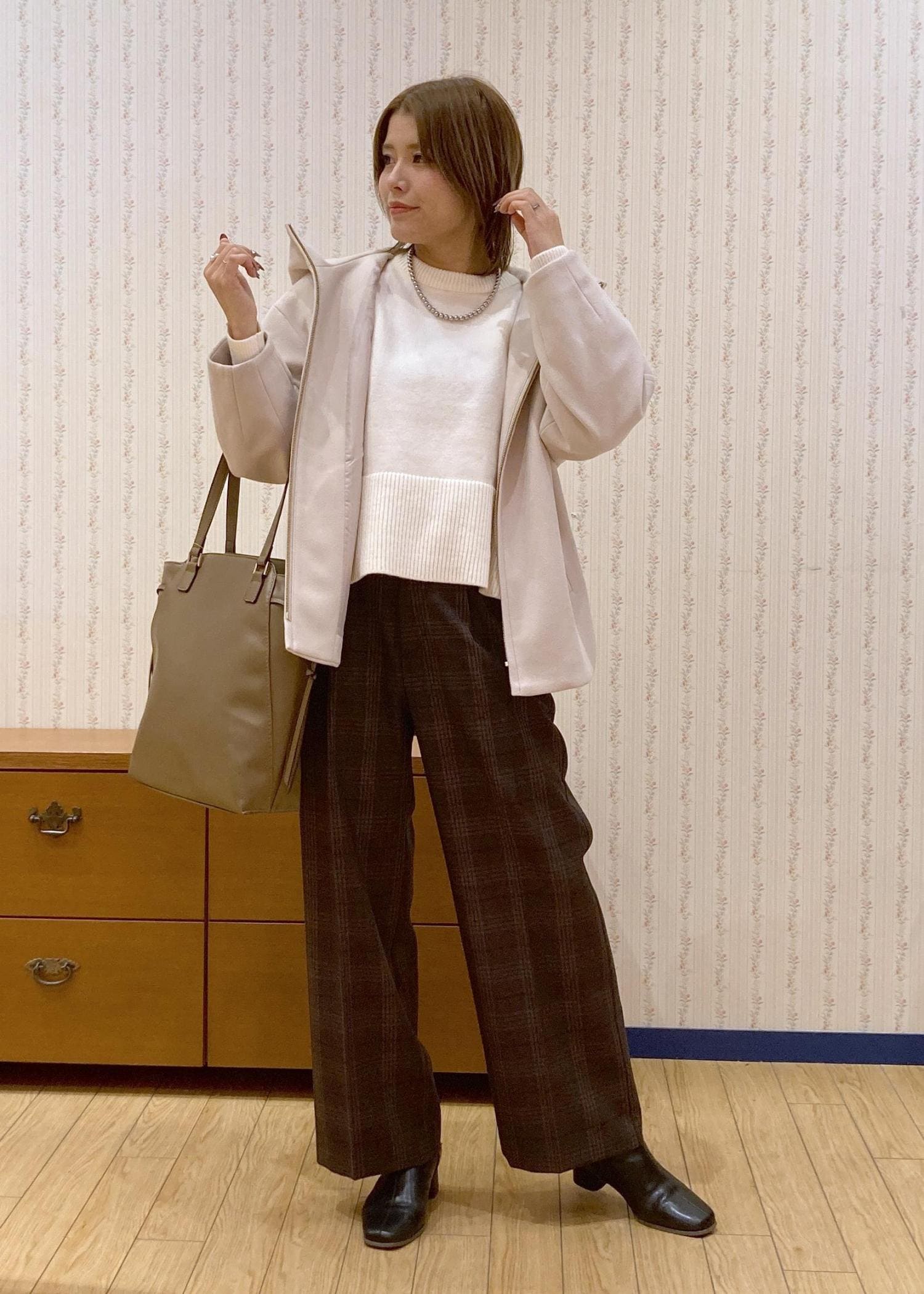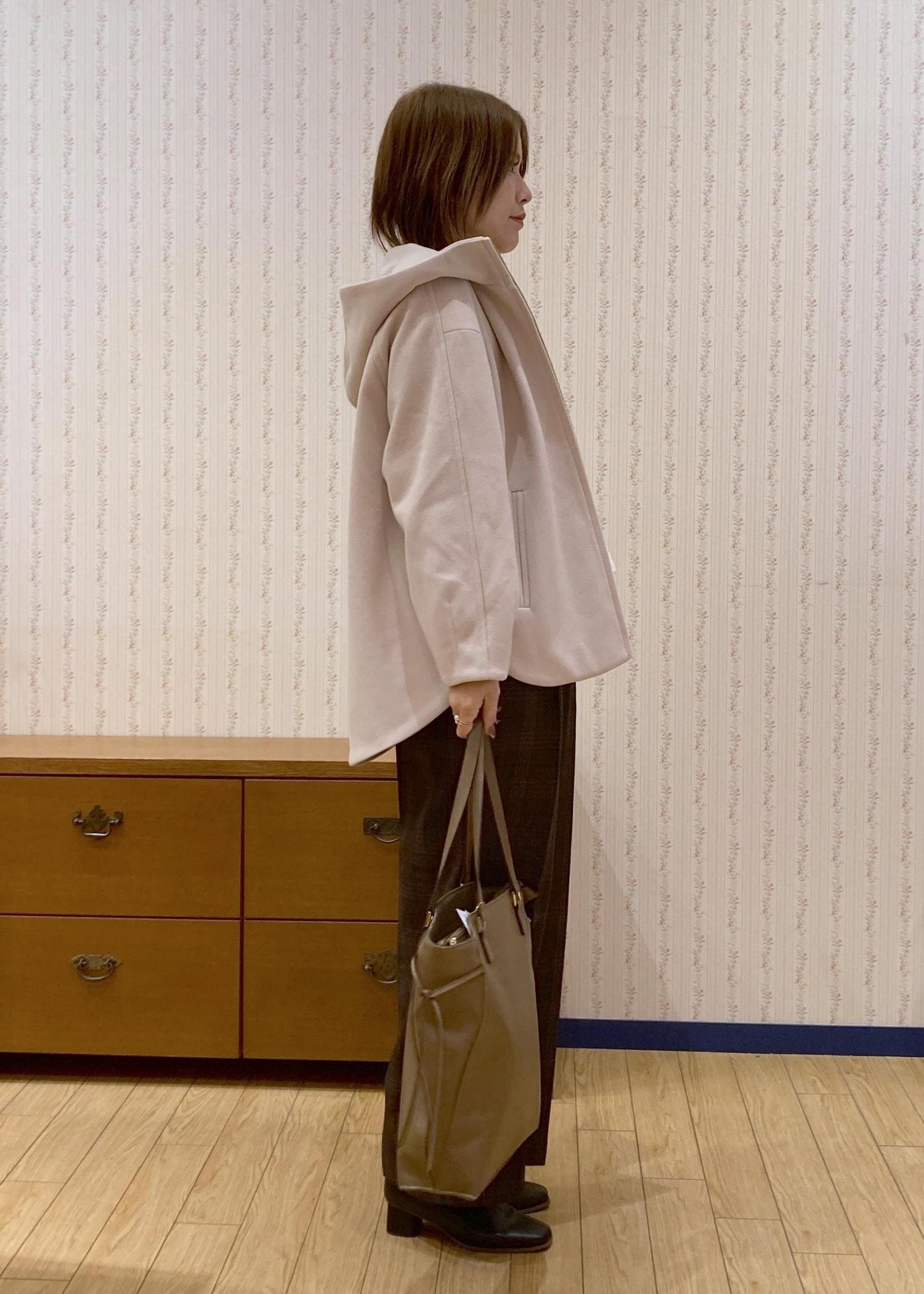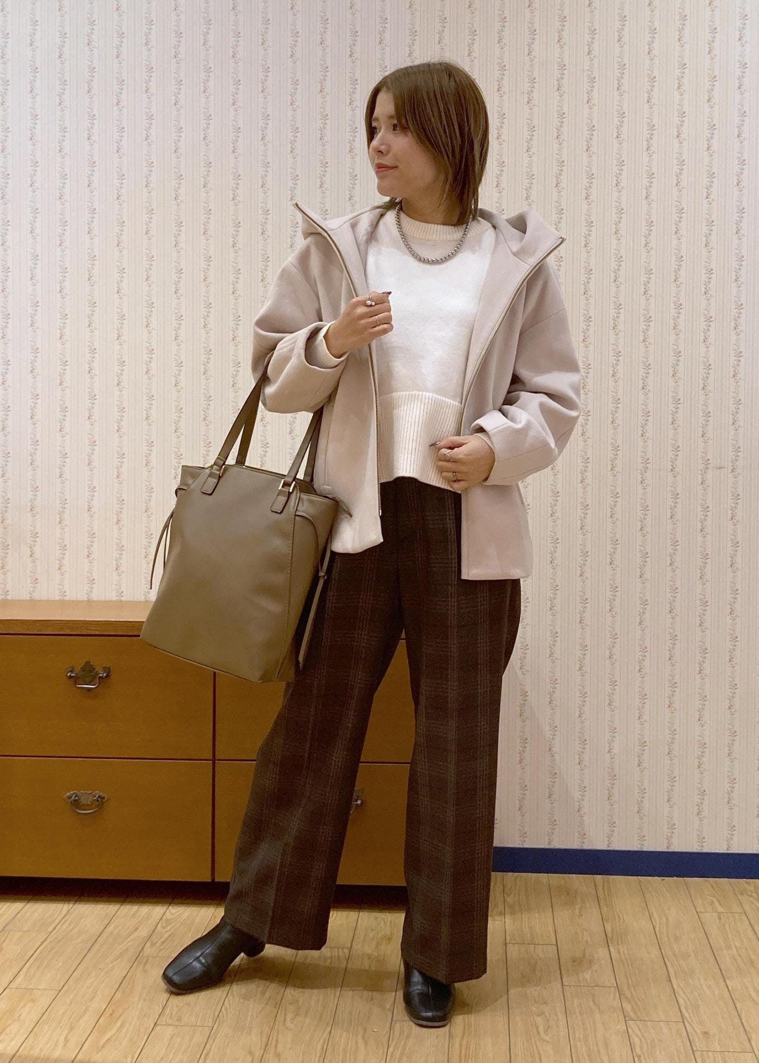 ゆったりとしたアウターを羽織ってON/OFF使えるコーディネートにまとめました。