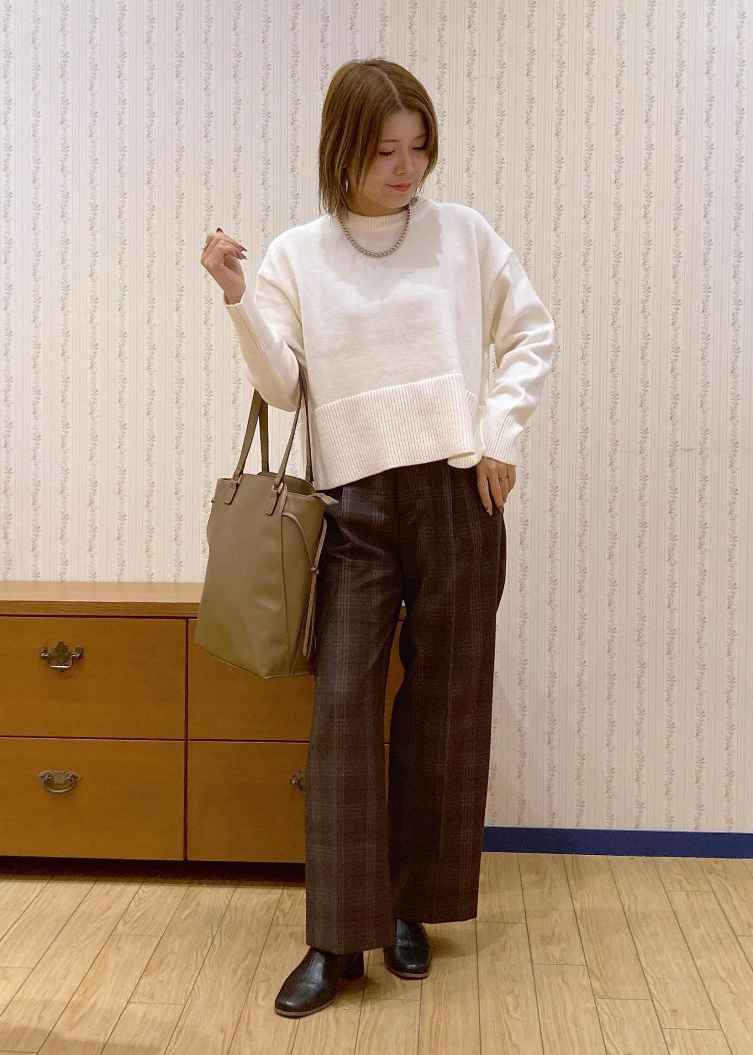 コンパクトな着丈のニットとワイドパンツを合わせることでウエストインしなくてもスタイルアップして見えるので体型カバーも叶います!