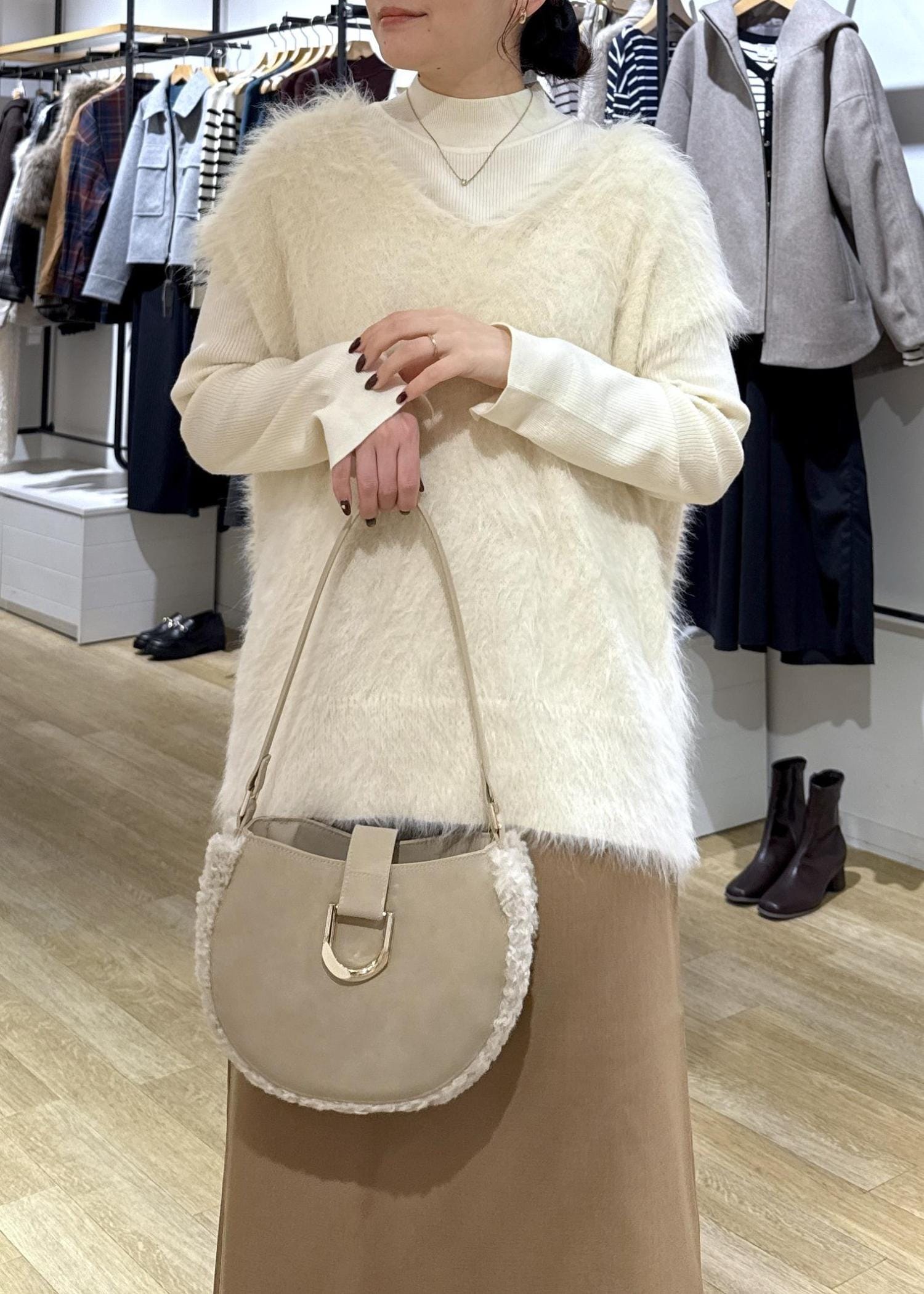 トレンドのスエード素材で、縁取りがボアになっている秋冬のコーデのポイントにぴったりのバッグです。