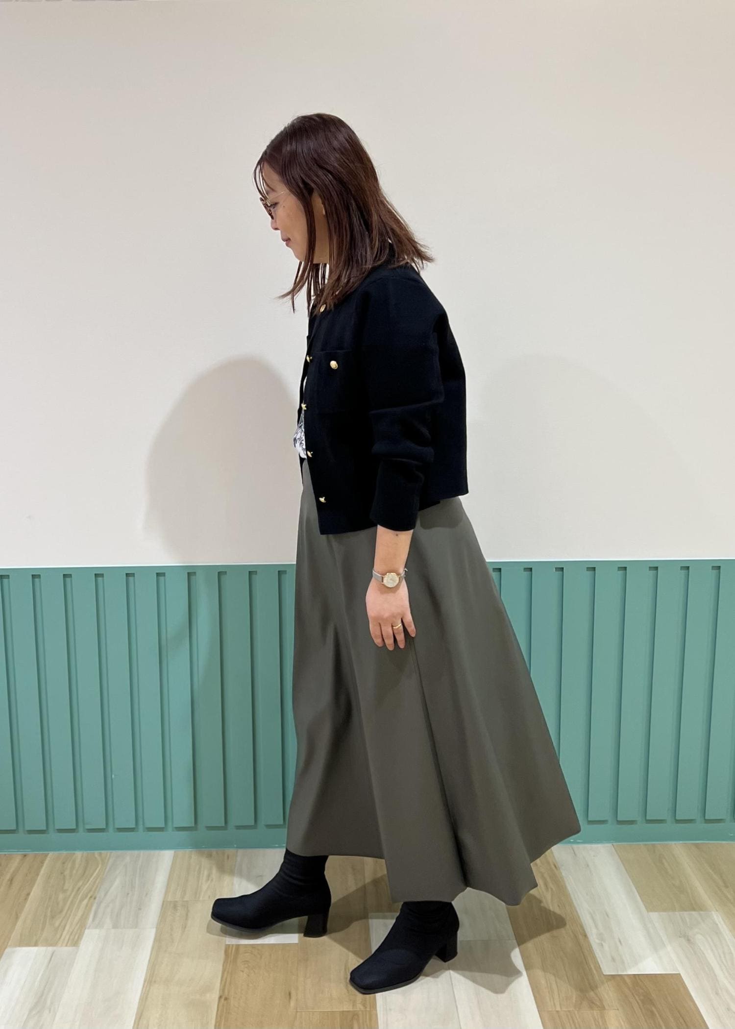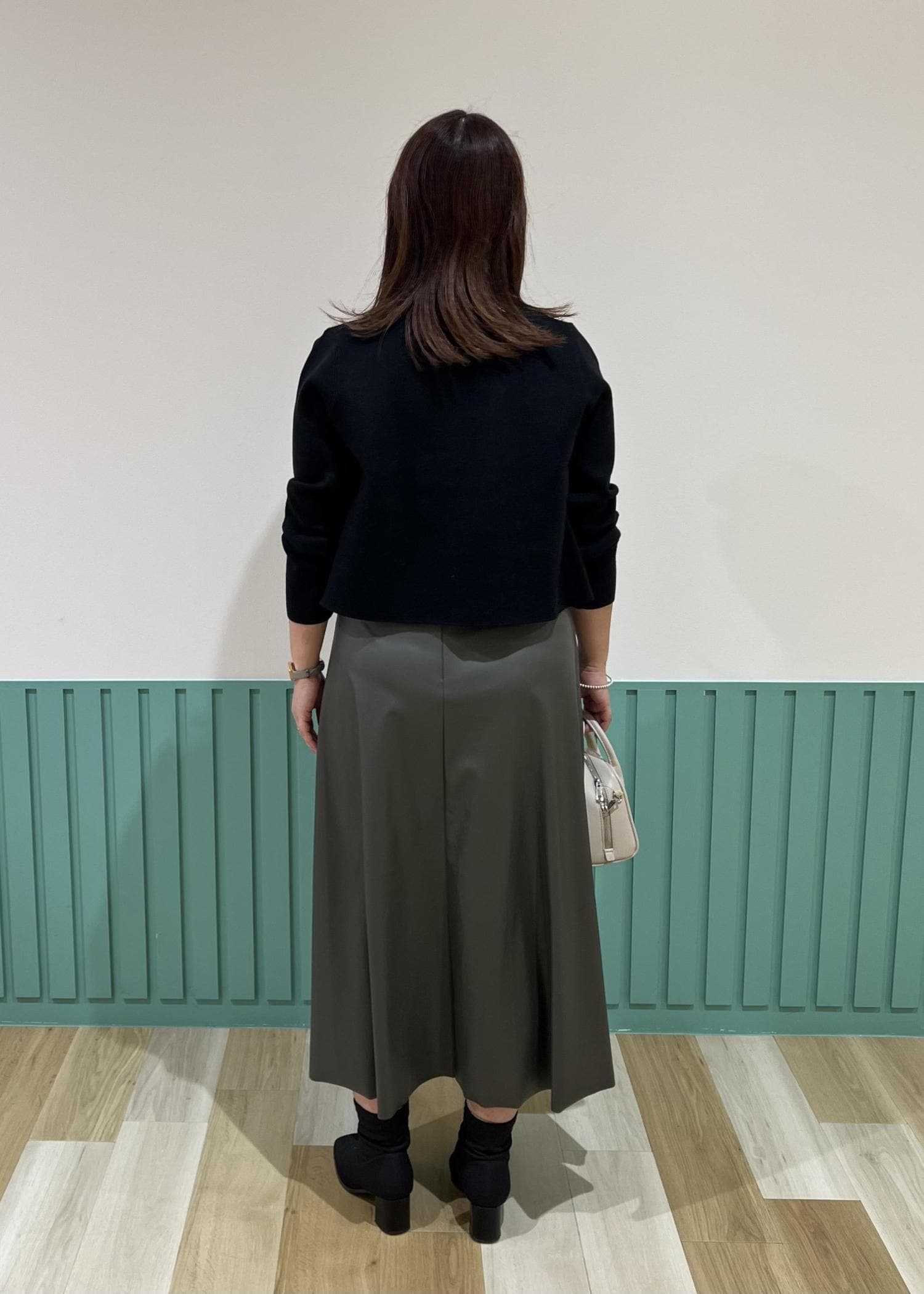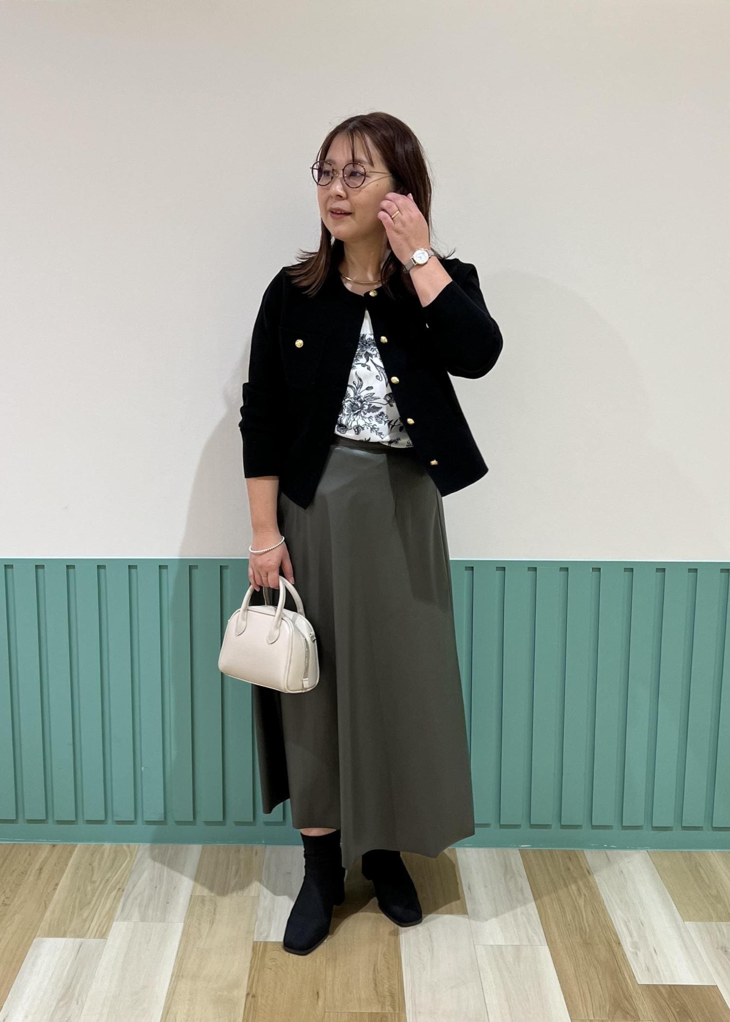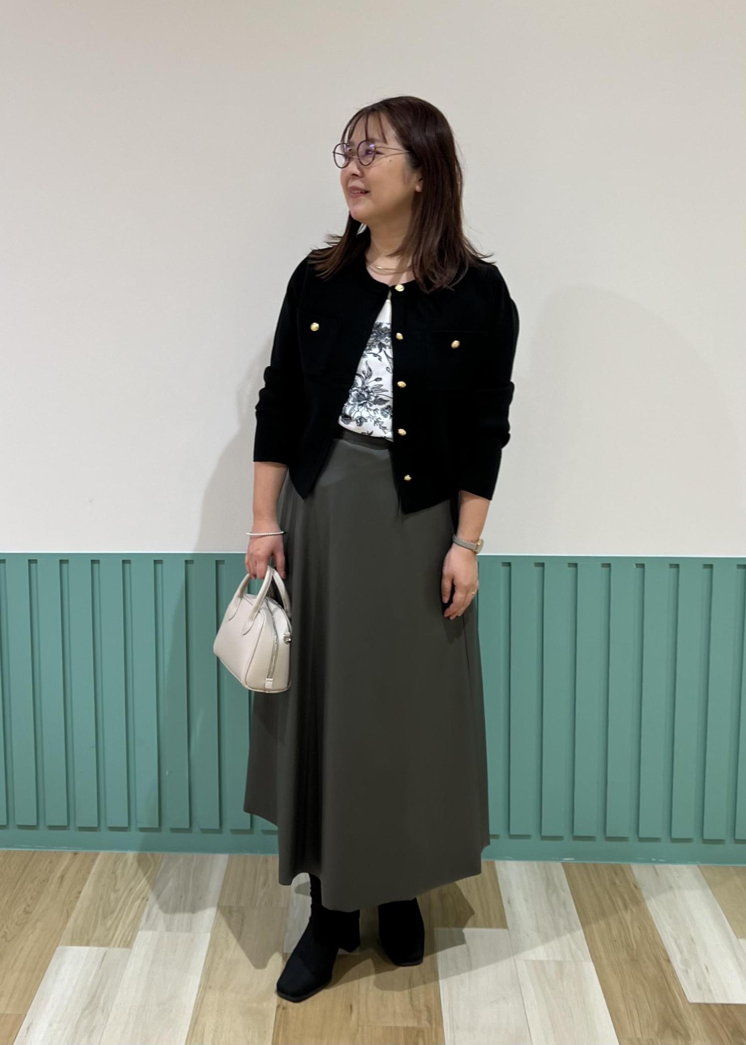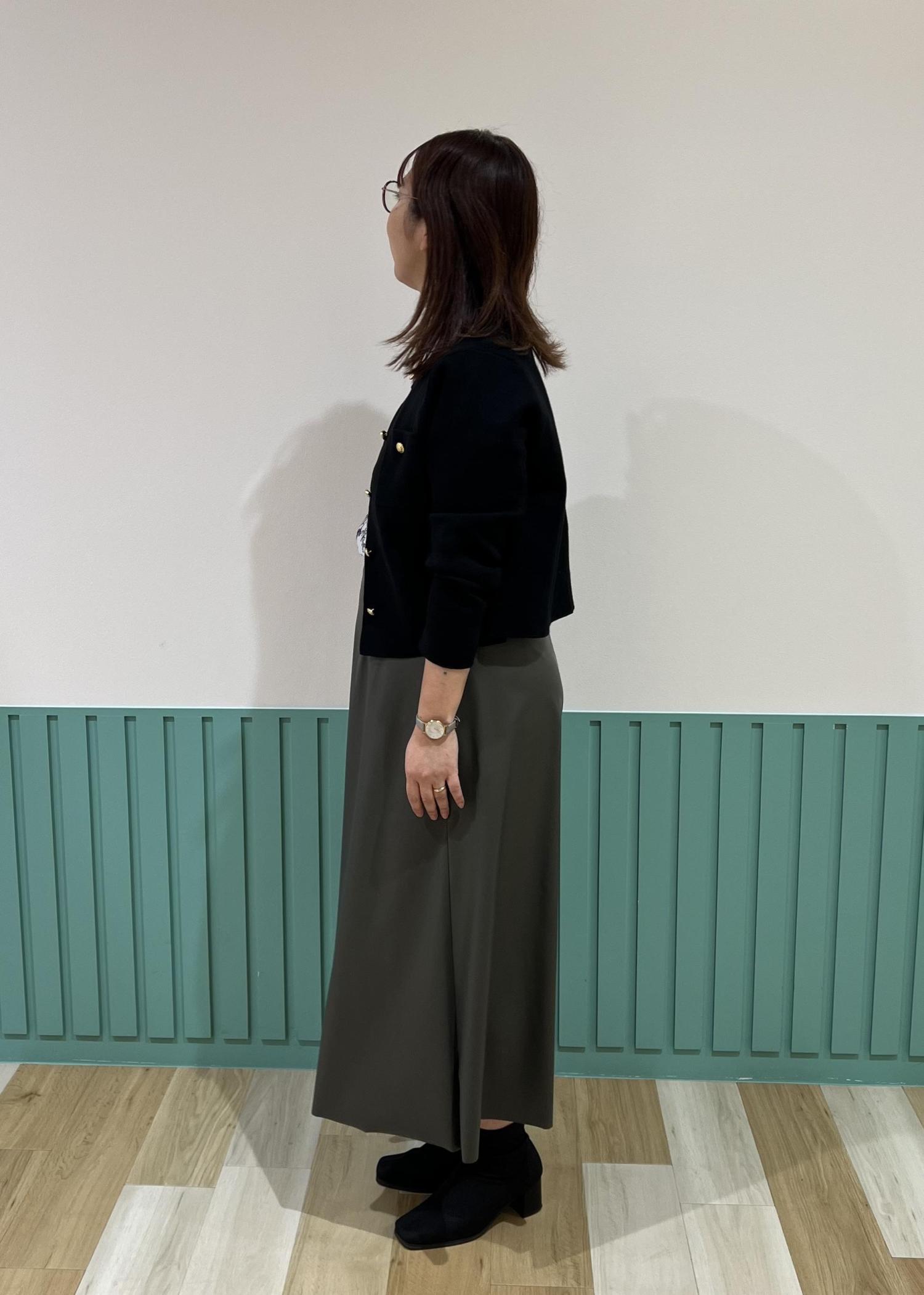 黒ニットにカーキを合わせて上品な印象に仕上げました。