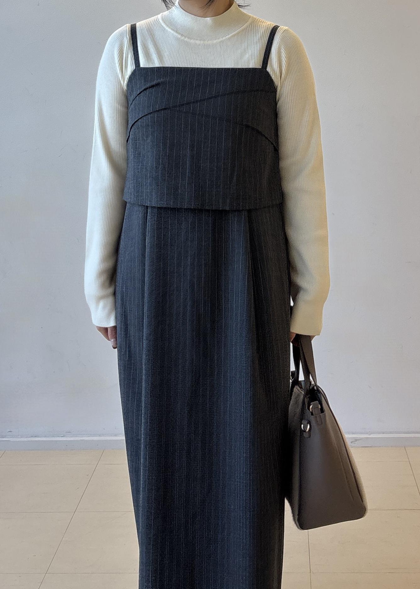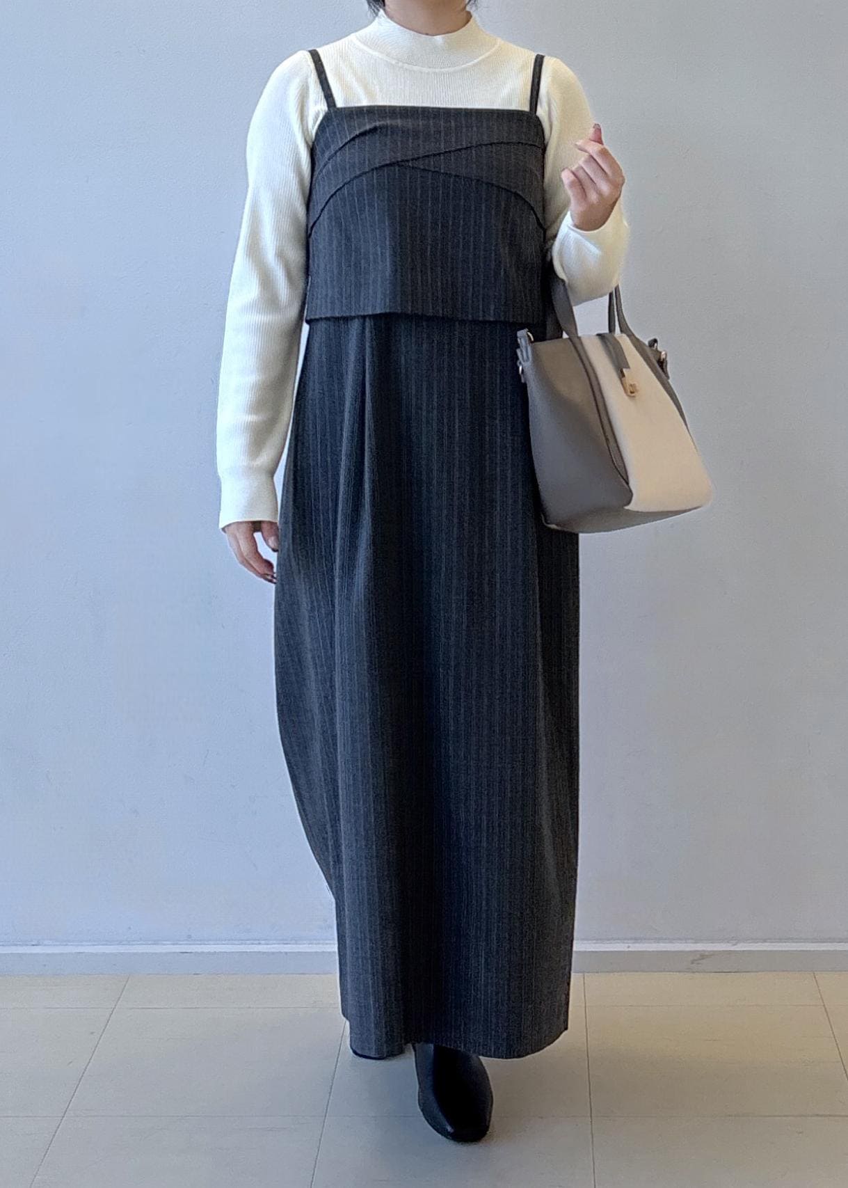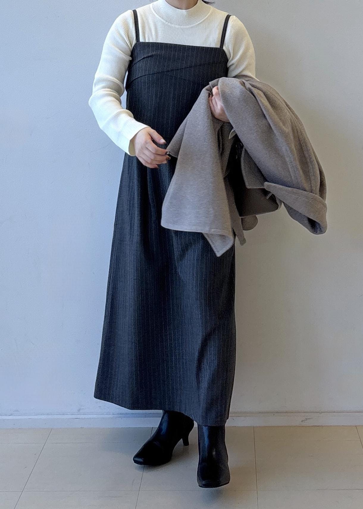 柔らかなアイボリーのニットに、ストライプのキャミワンピースを重ねたきれいめコーデ。
