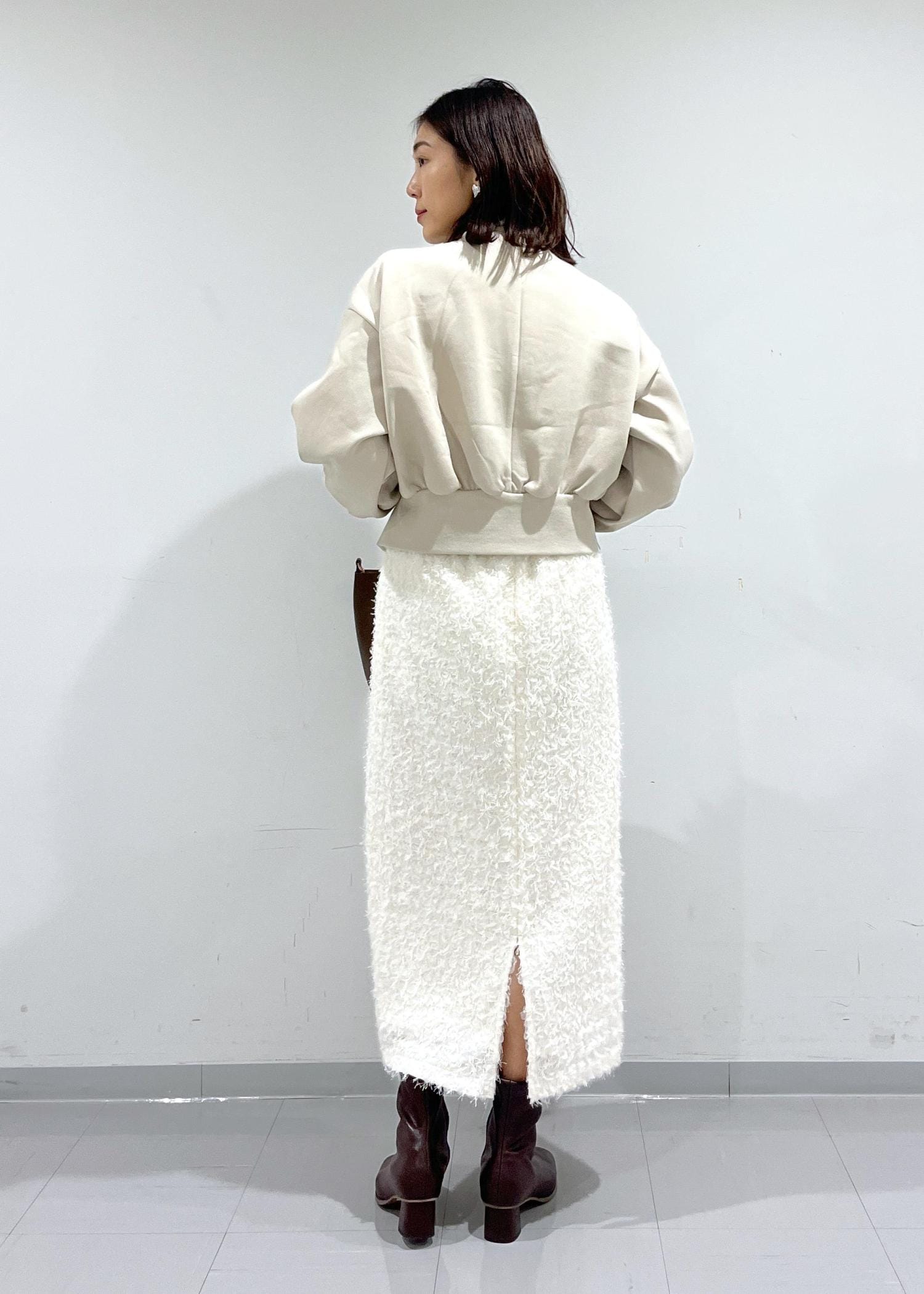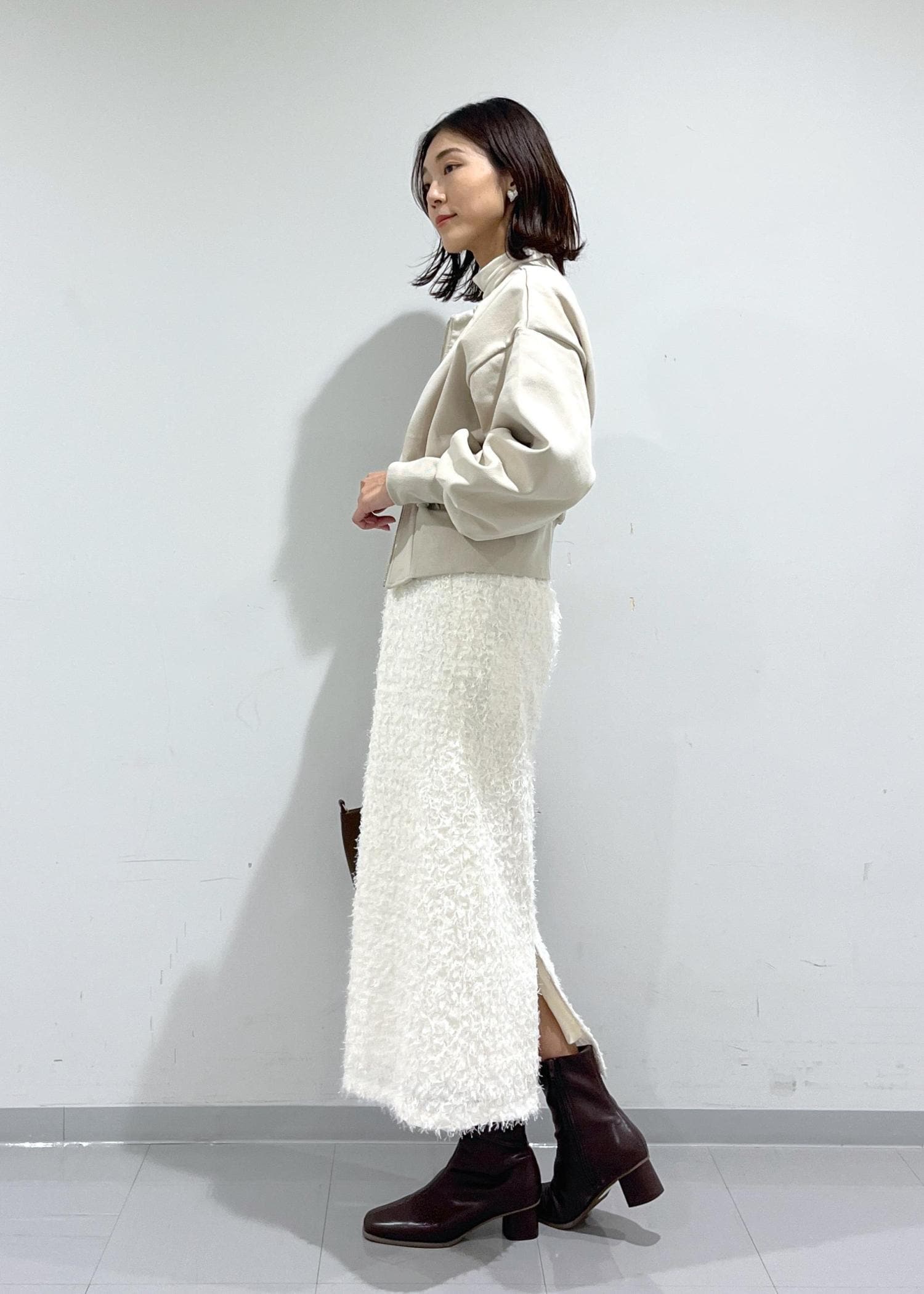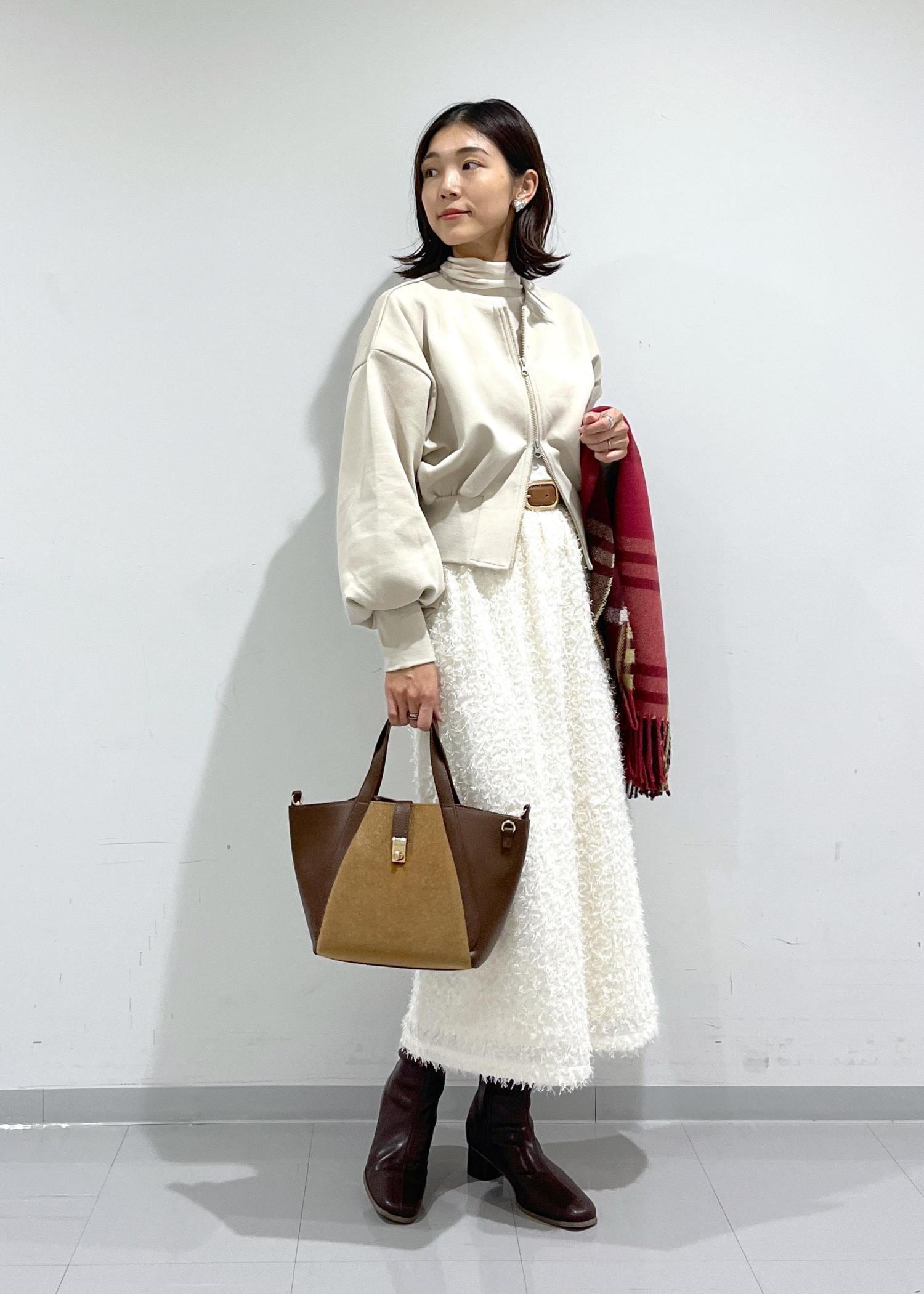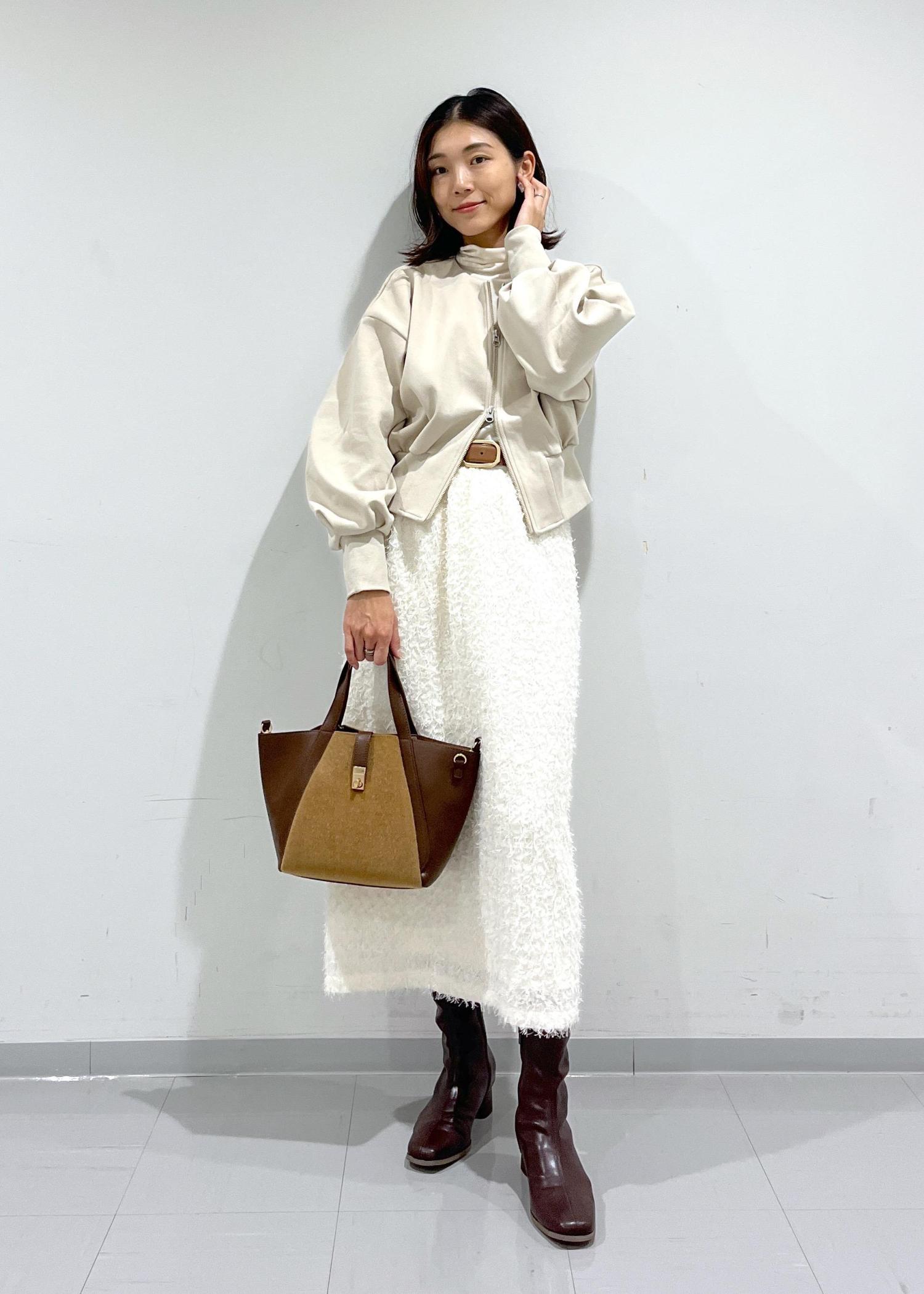 ホワイト系のワントーンでまとめ、ふわっとした素材や丸みのあるシルエットで冬のほっこり感もプラス。