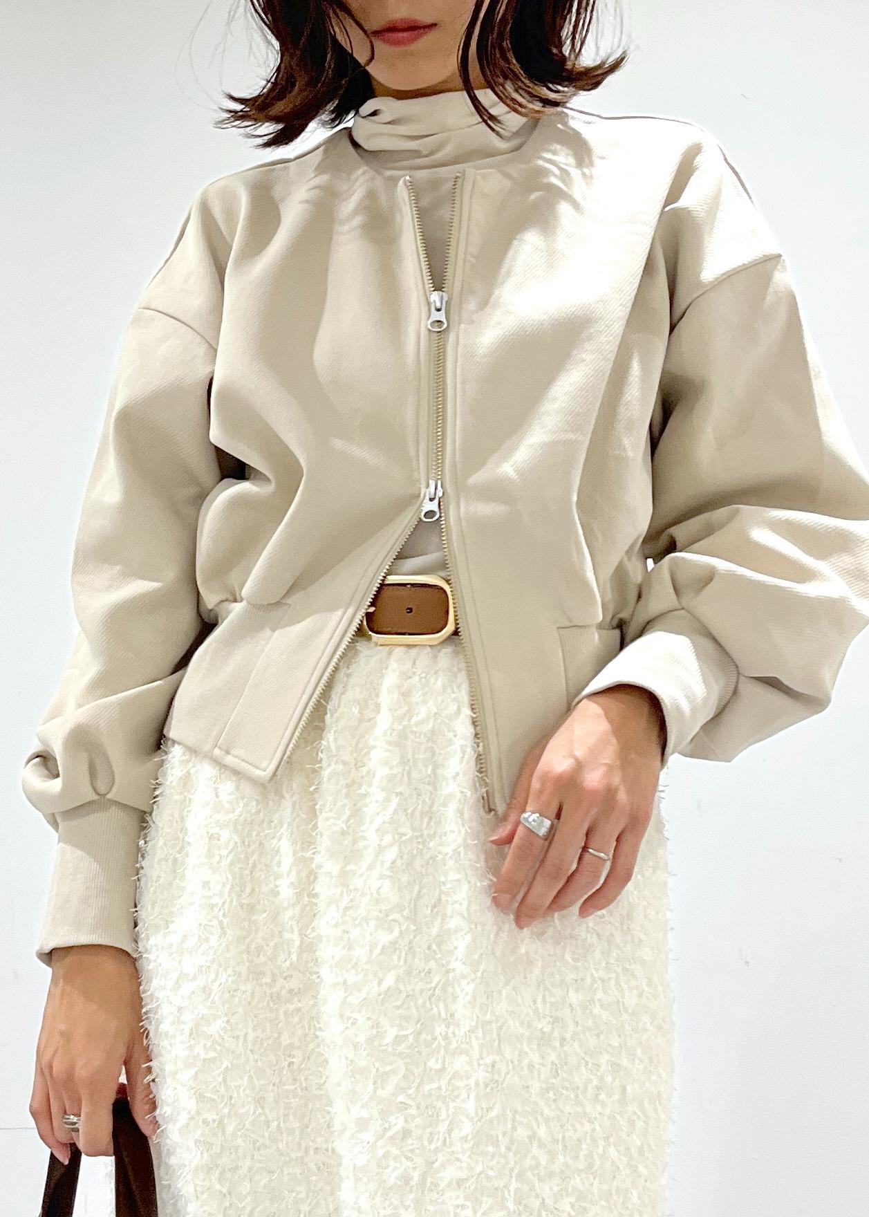 ダブルジップなので、下のジップを少し上げてスリットを作るとよりすっきりとした印象で着こなせます。