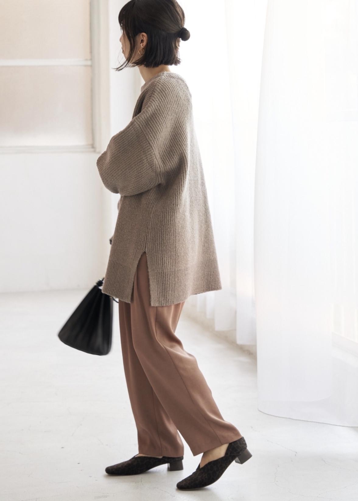 程よいボリューム感あるニットのニュアンスカラーコーデ