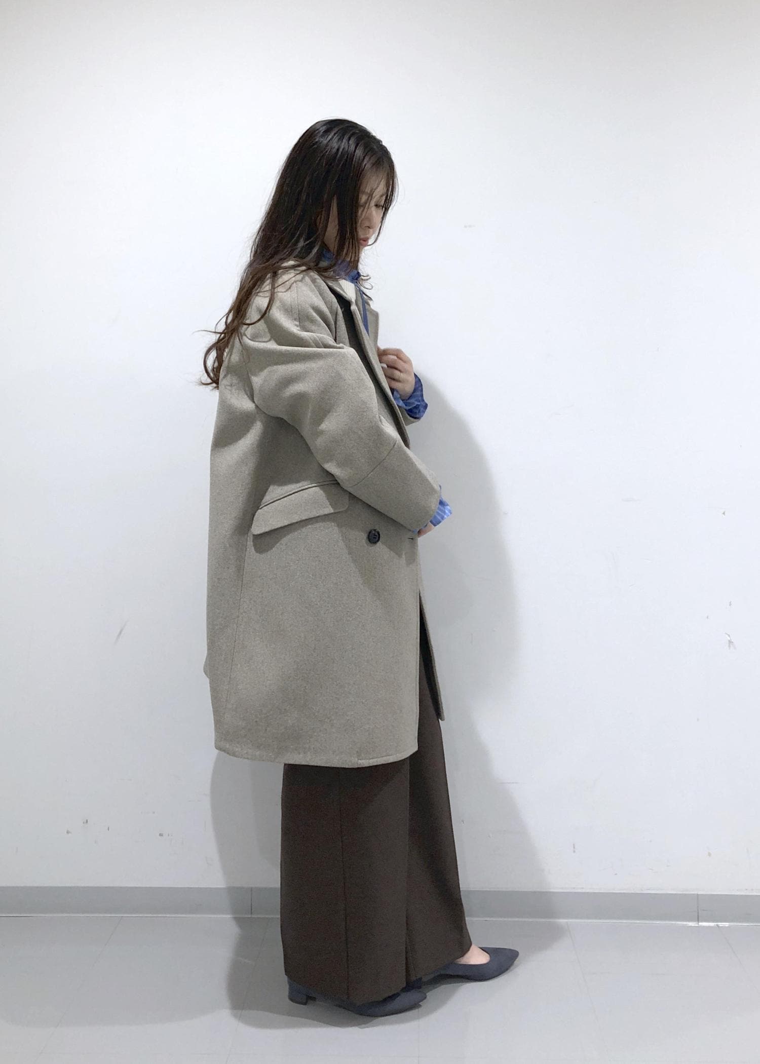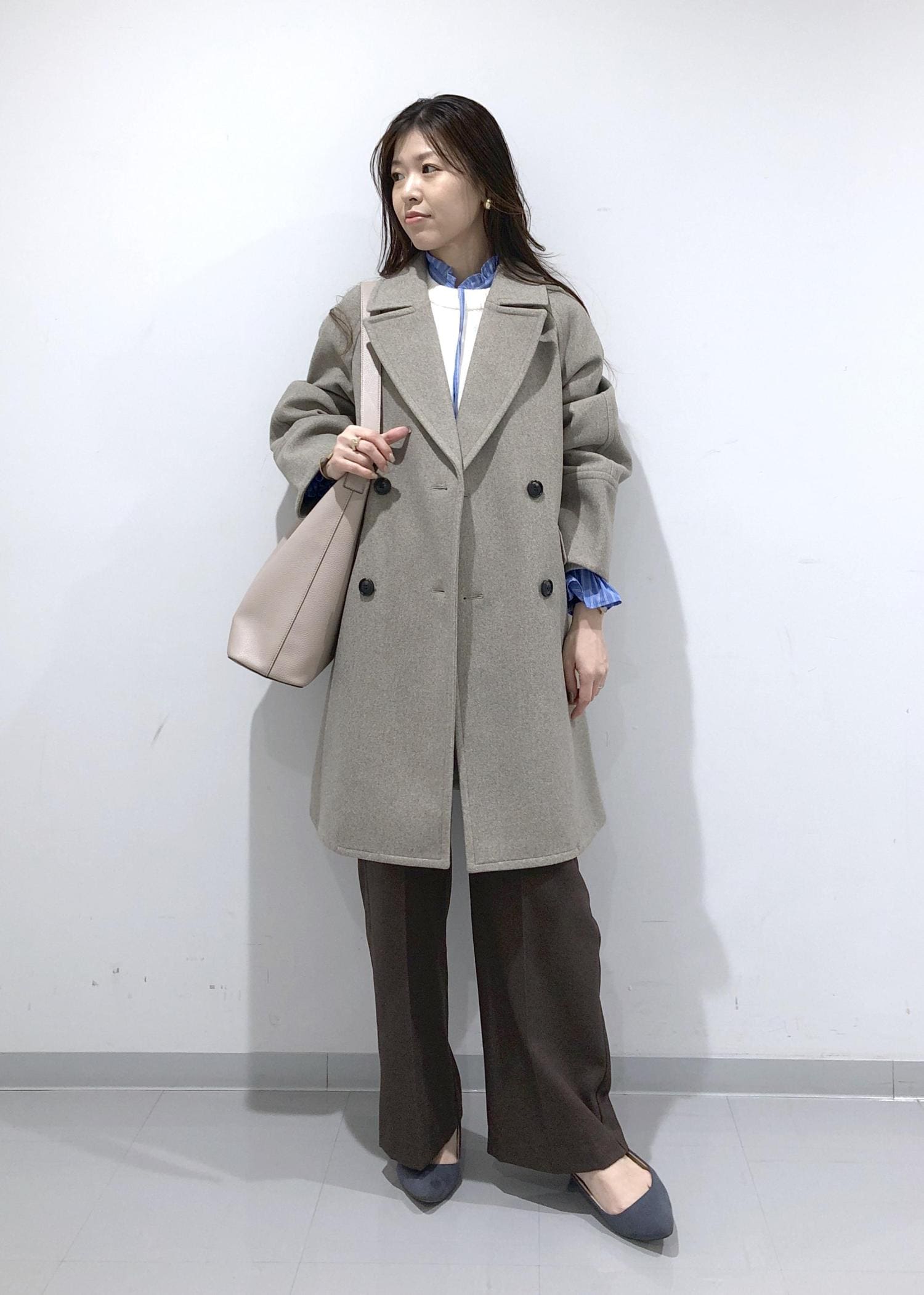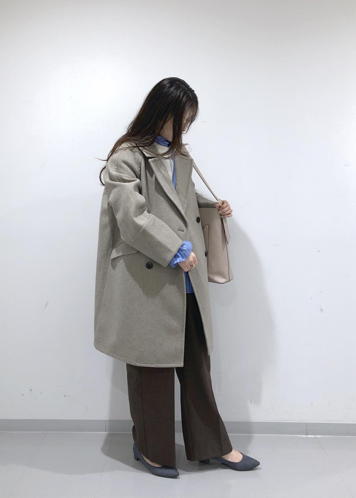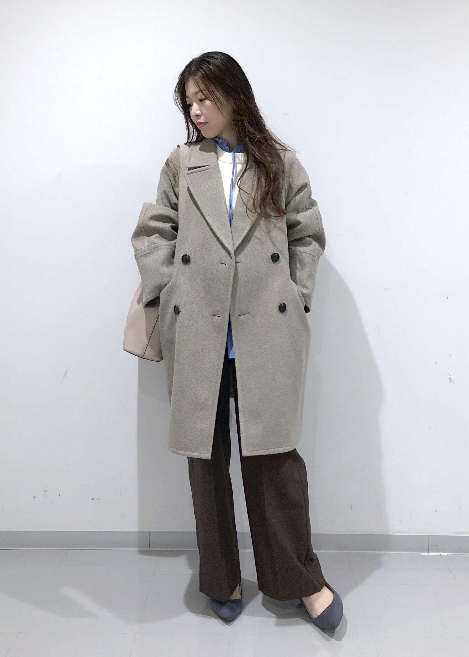 淡く優しい色味のブラウンのオーバーPコートの中は、シンプルニット+大人可愛いデザインブラウスのレイヤードに、旬のブラウンのワイドパンツを合わせたカジュアルコーデに!