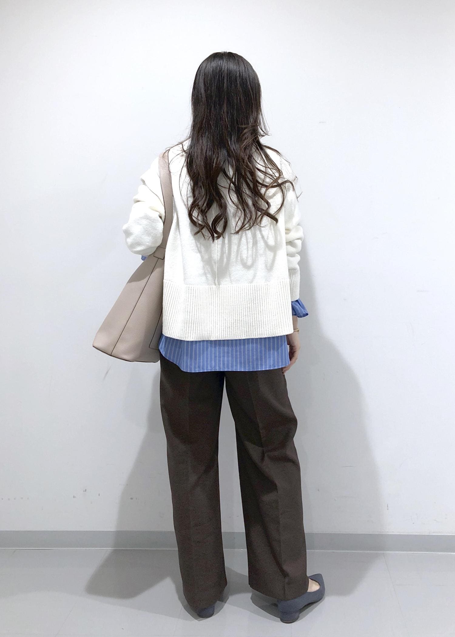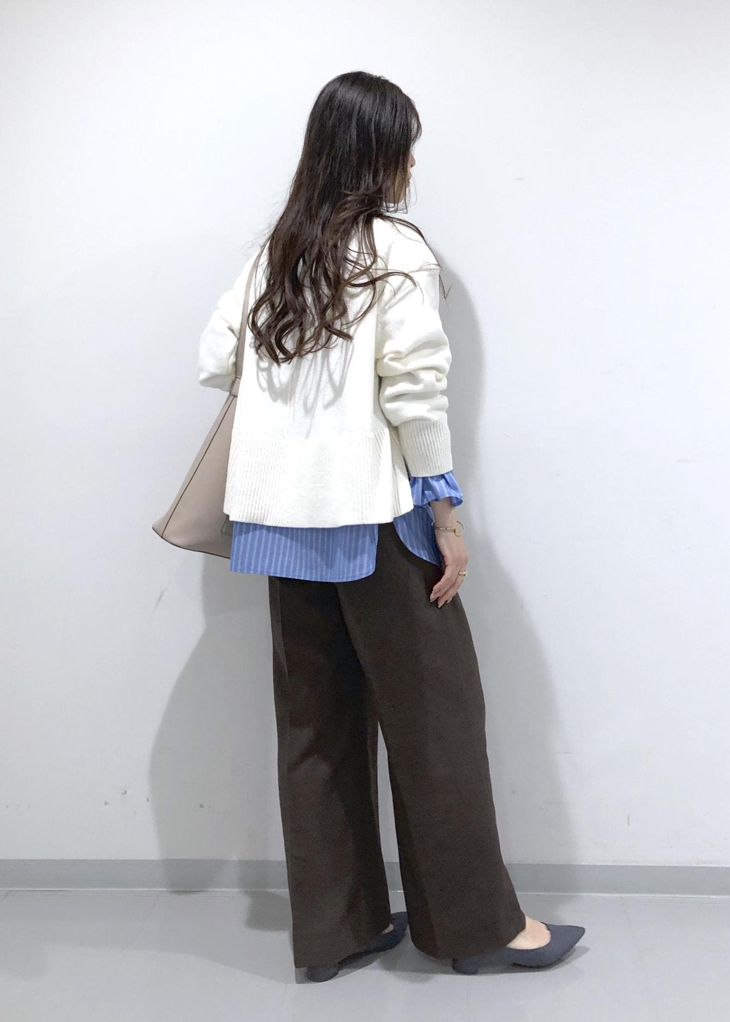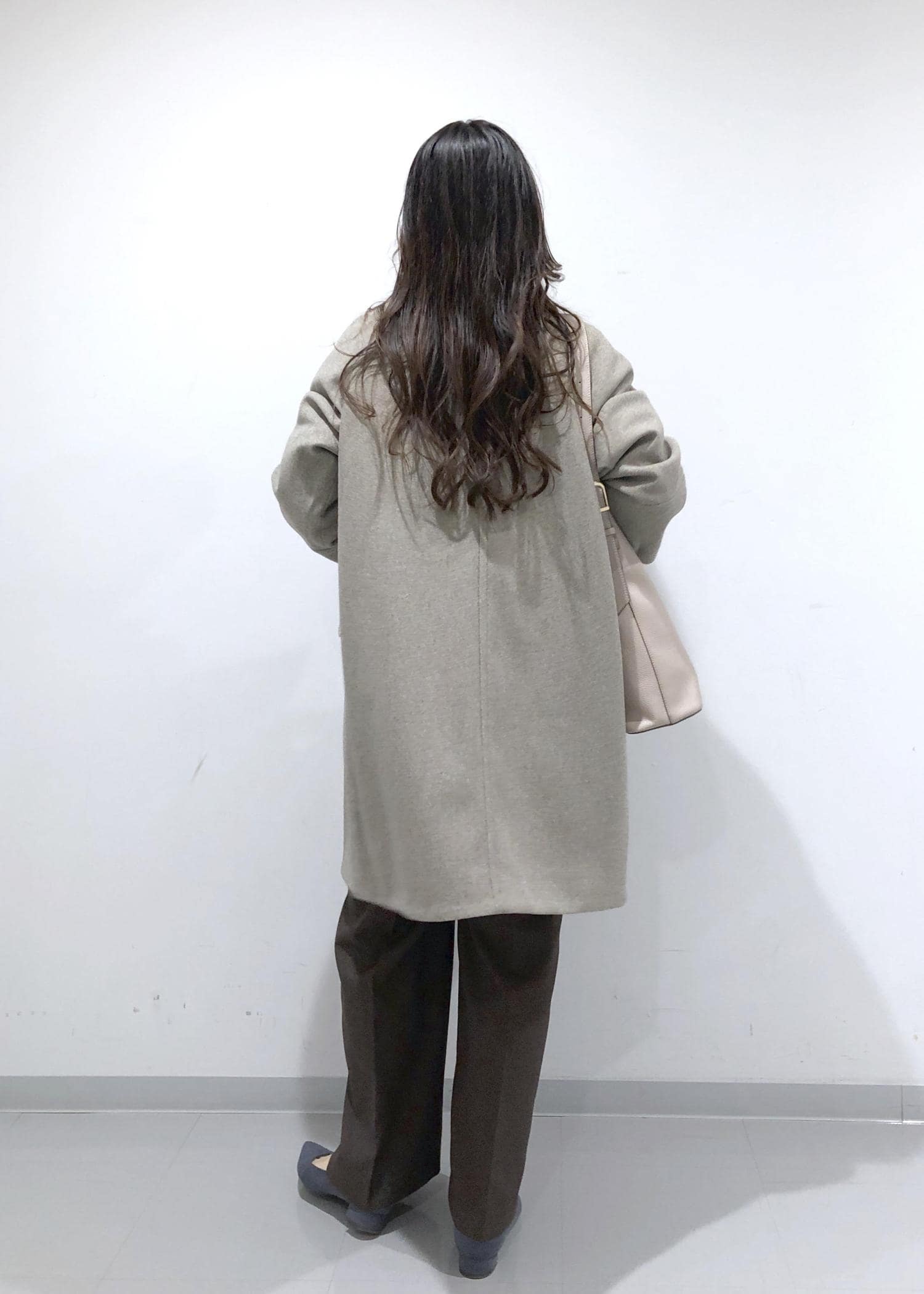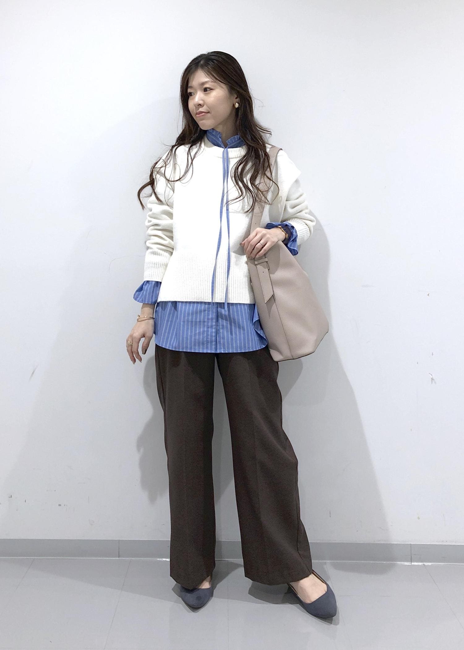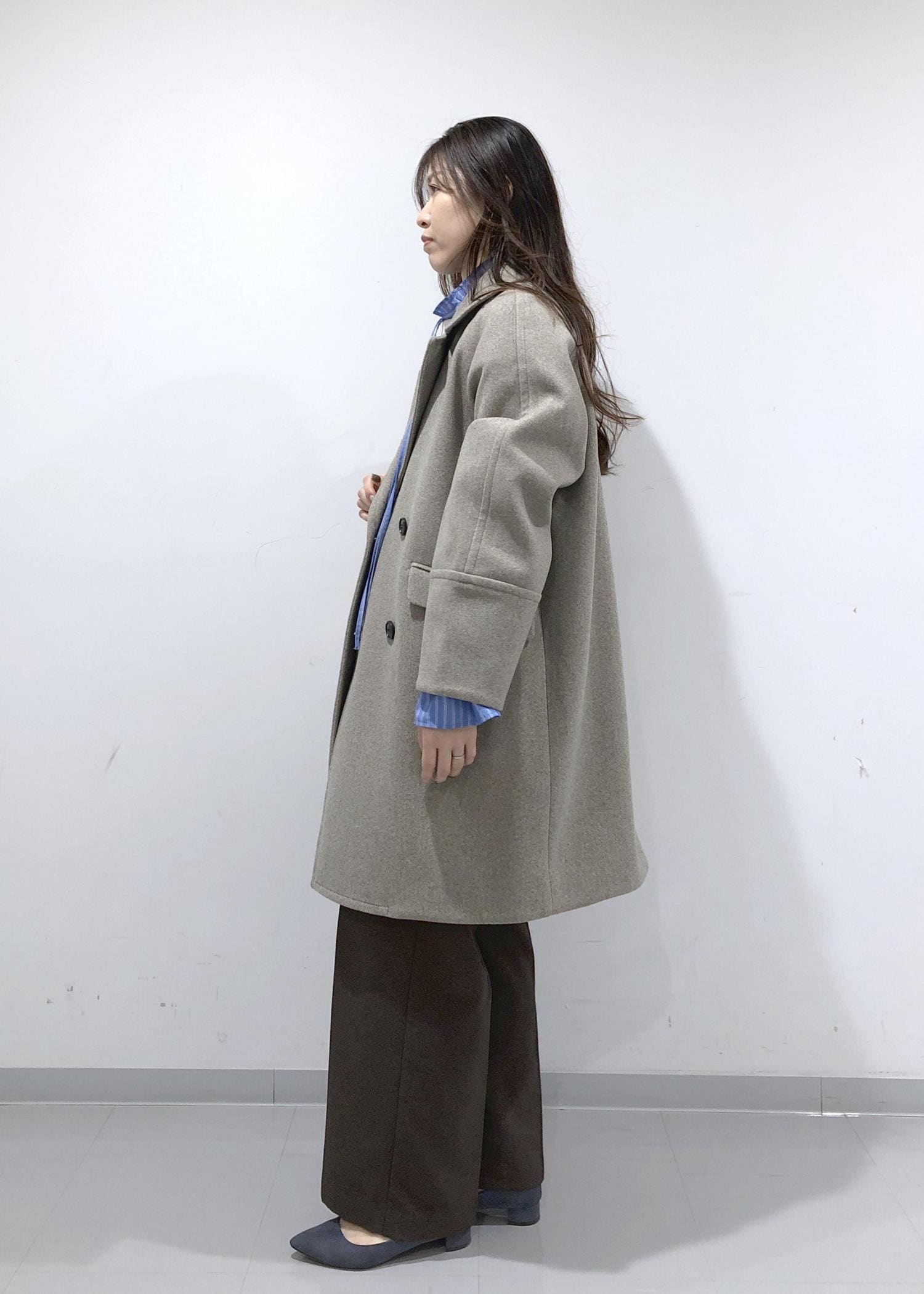 淡く優しい色味のブラウンのオーバーPコートの中は、シンプルニット+大人可愛いデザインブラウスのレイヤードに、旬のブラウンのワイドパンツを合わせたカジュアルコーデに!