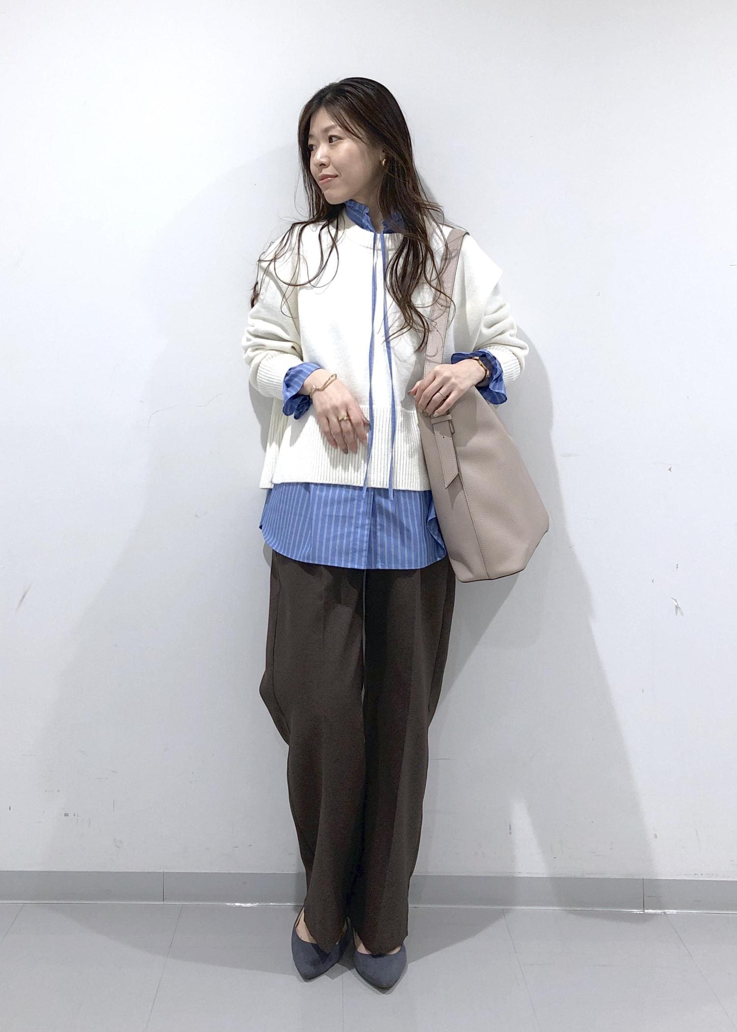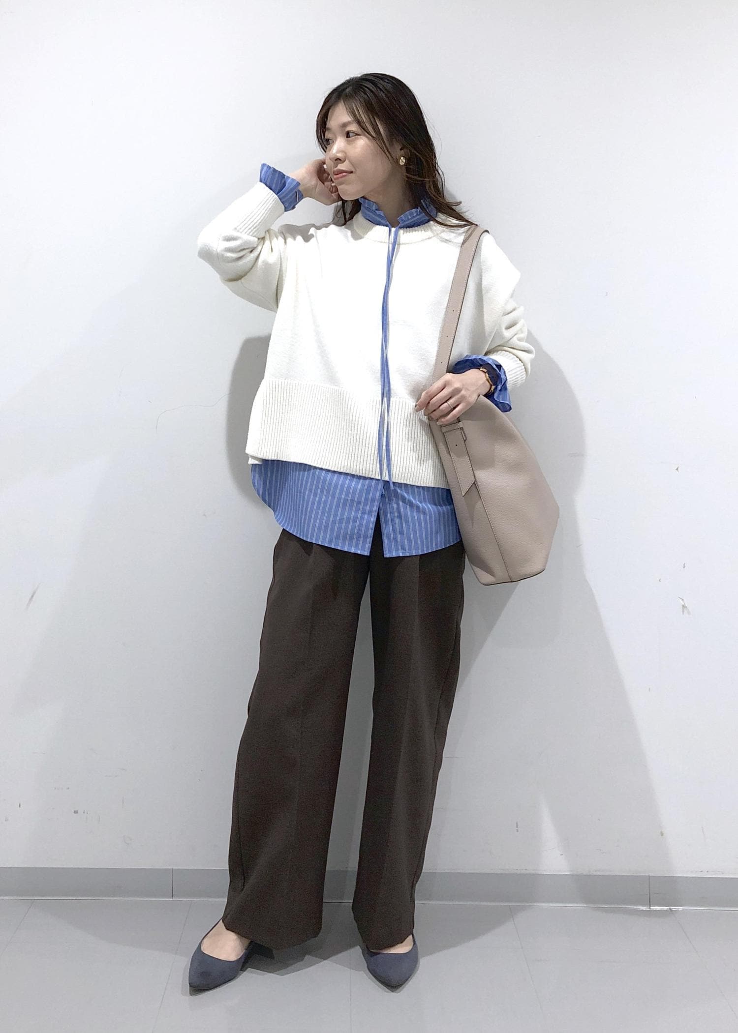 ニットやカーディガン、スウェットのインナー使いでも、襟元とリボン、袖を出して華やかさをプラスできます!
