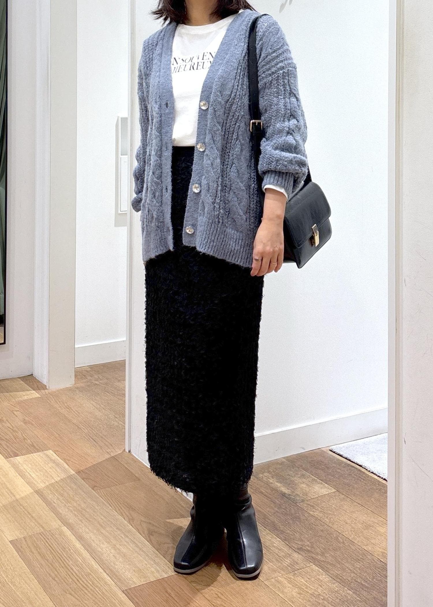黒のタイトスカートと合わせて