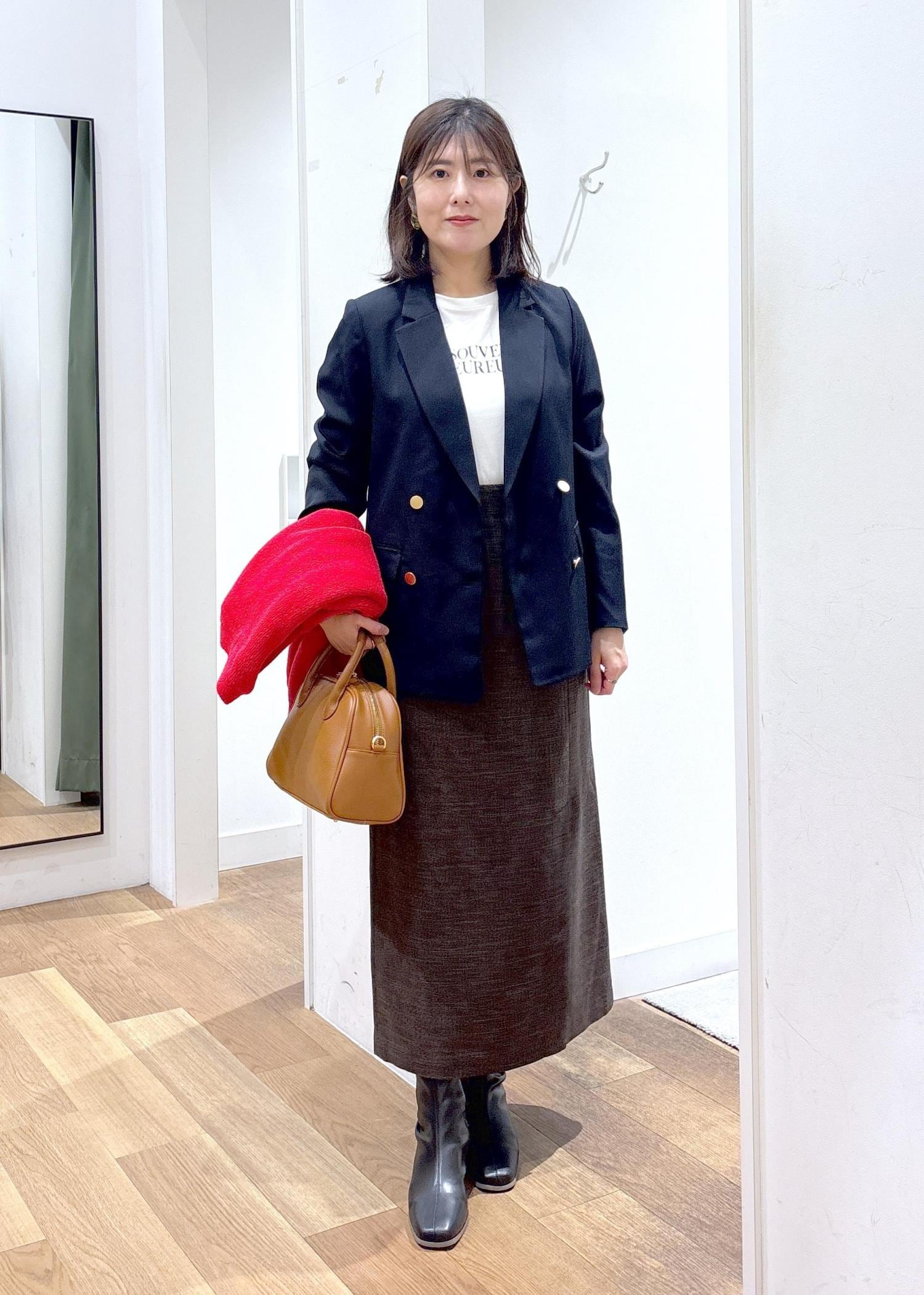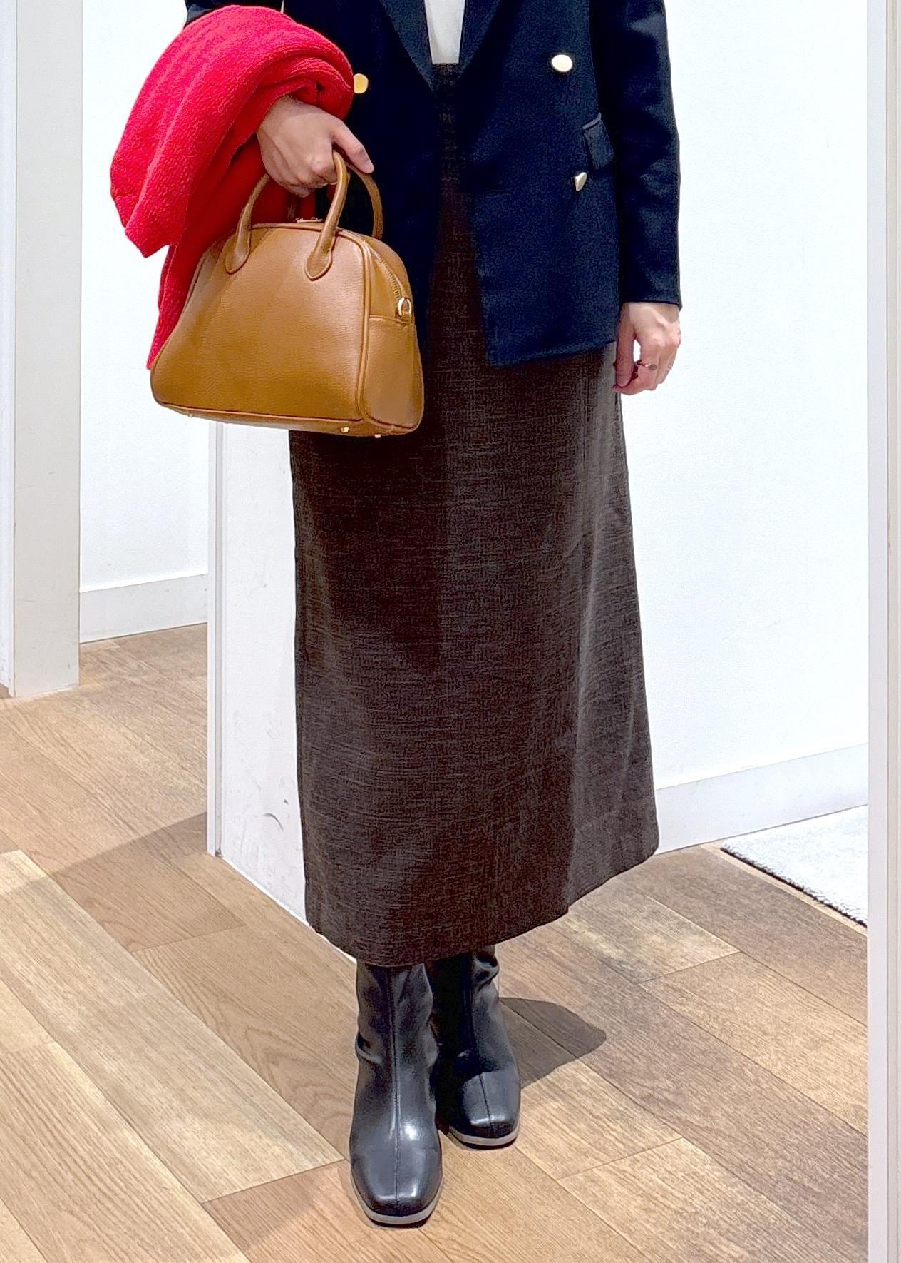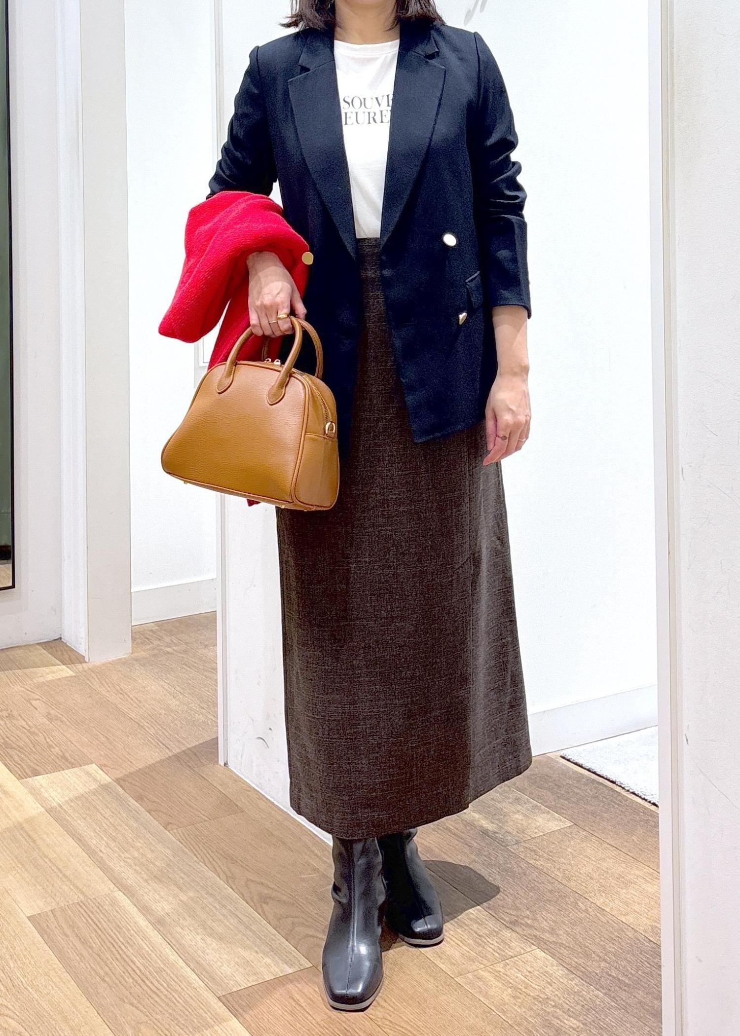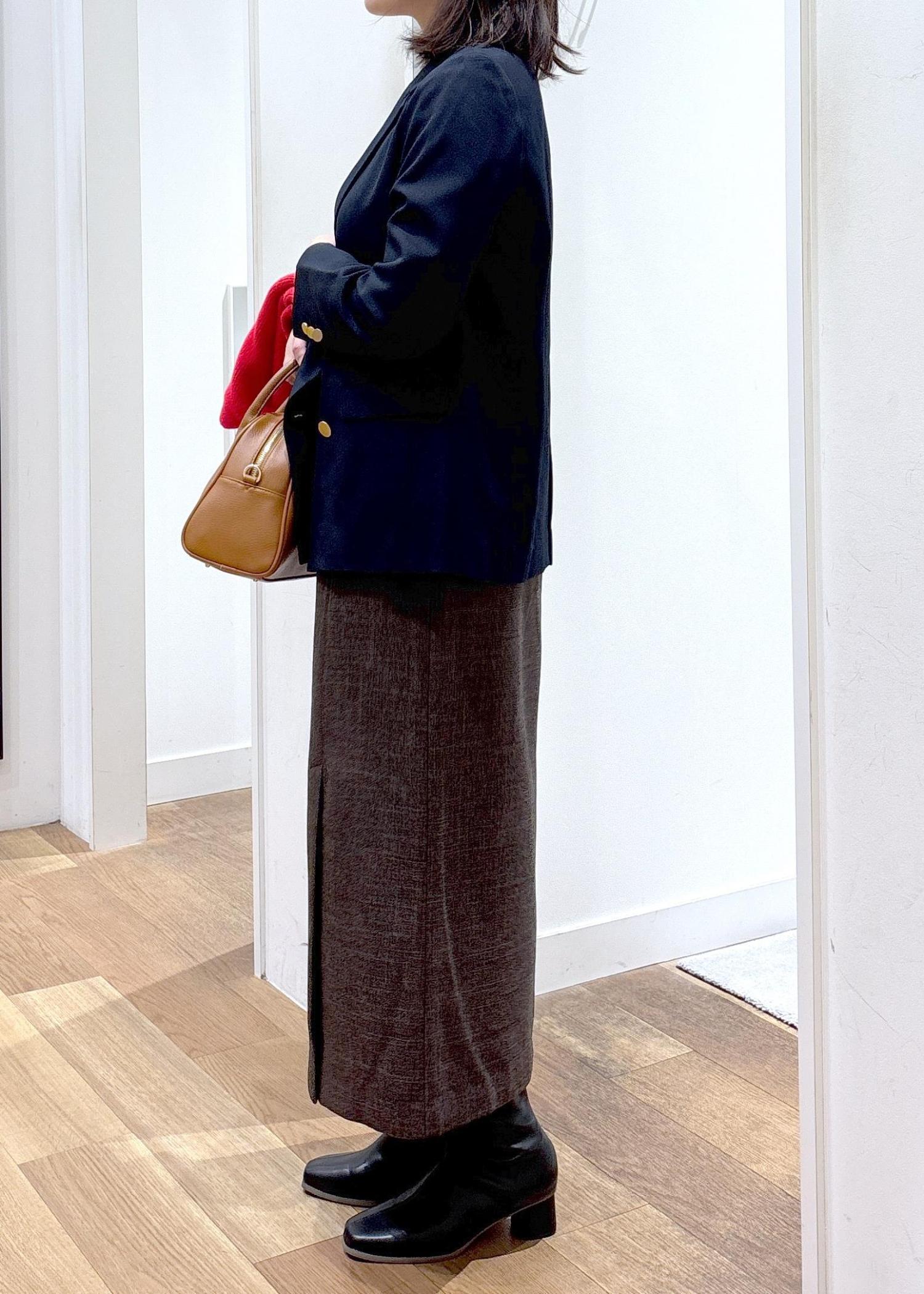 Mサイズだと腰回りにゆとりがなく、Lサイズがちょうど良かったです。ストンとしたすっきりしたラインですが、スリットが入っているので歩きやすさも◎です。
