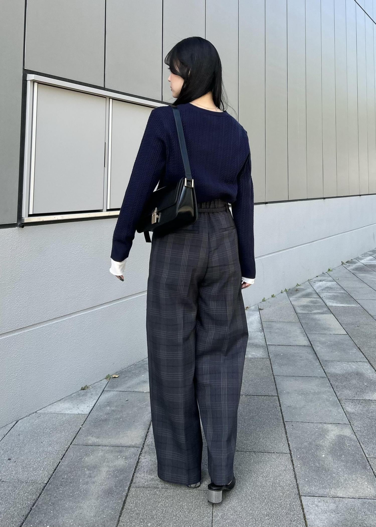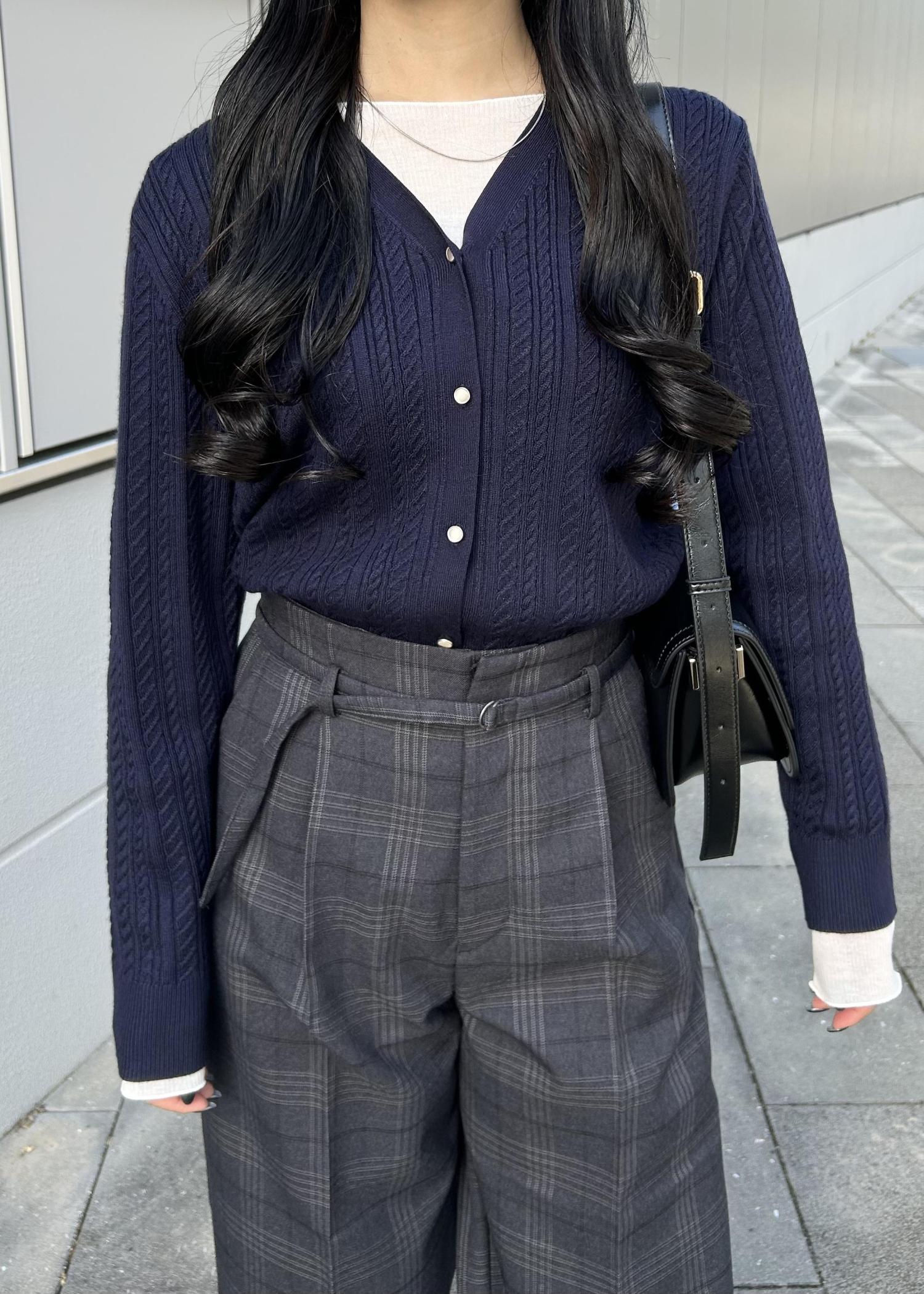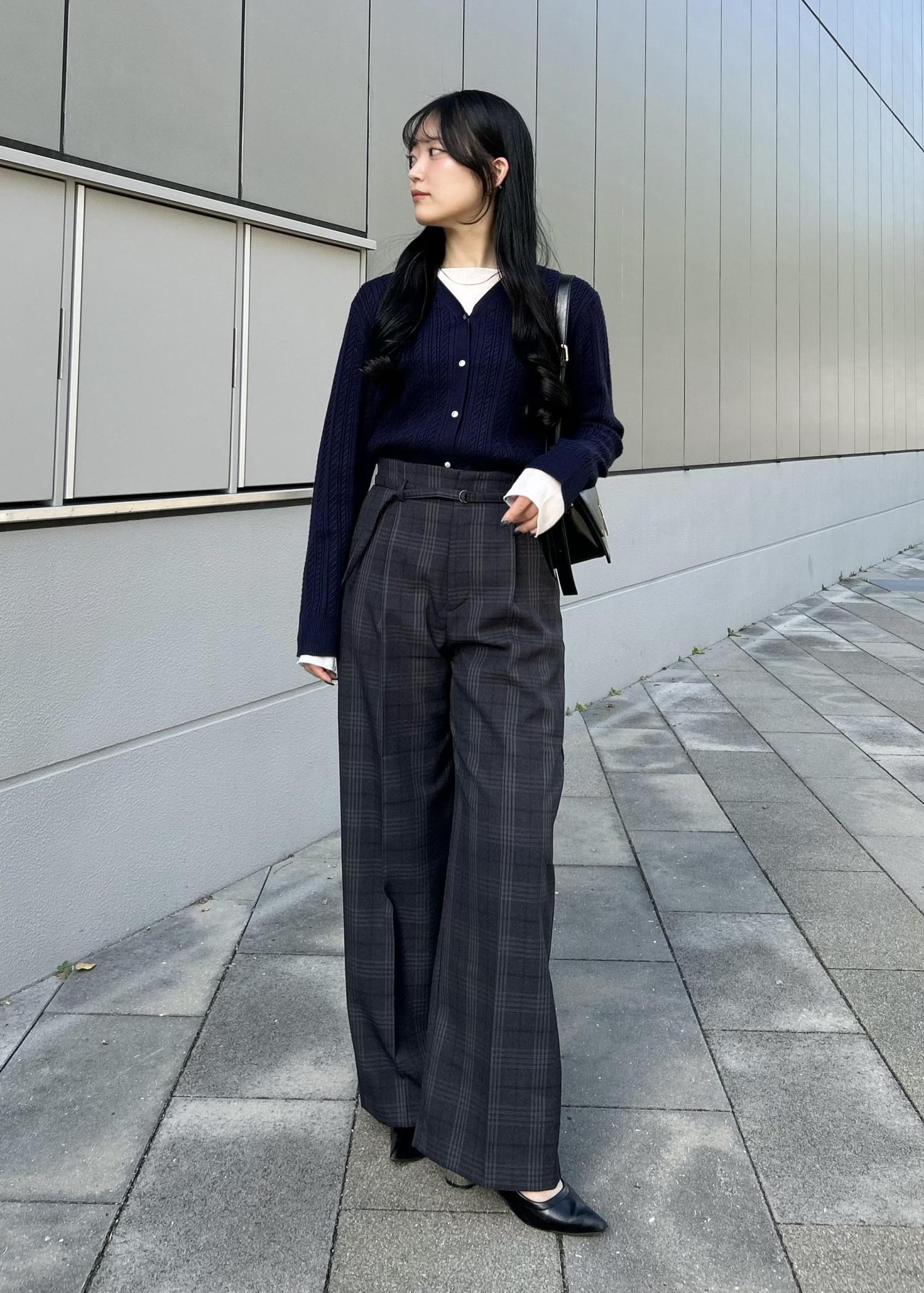 ネイビーのカーディガンにチェック柄のワイドパンツを合わせた、少しトラッドな雰囲気のコーデ。