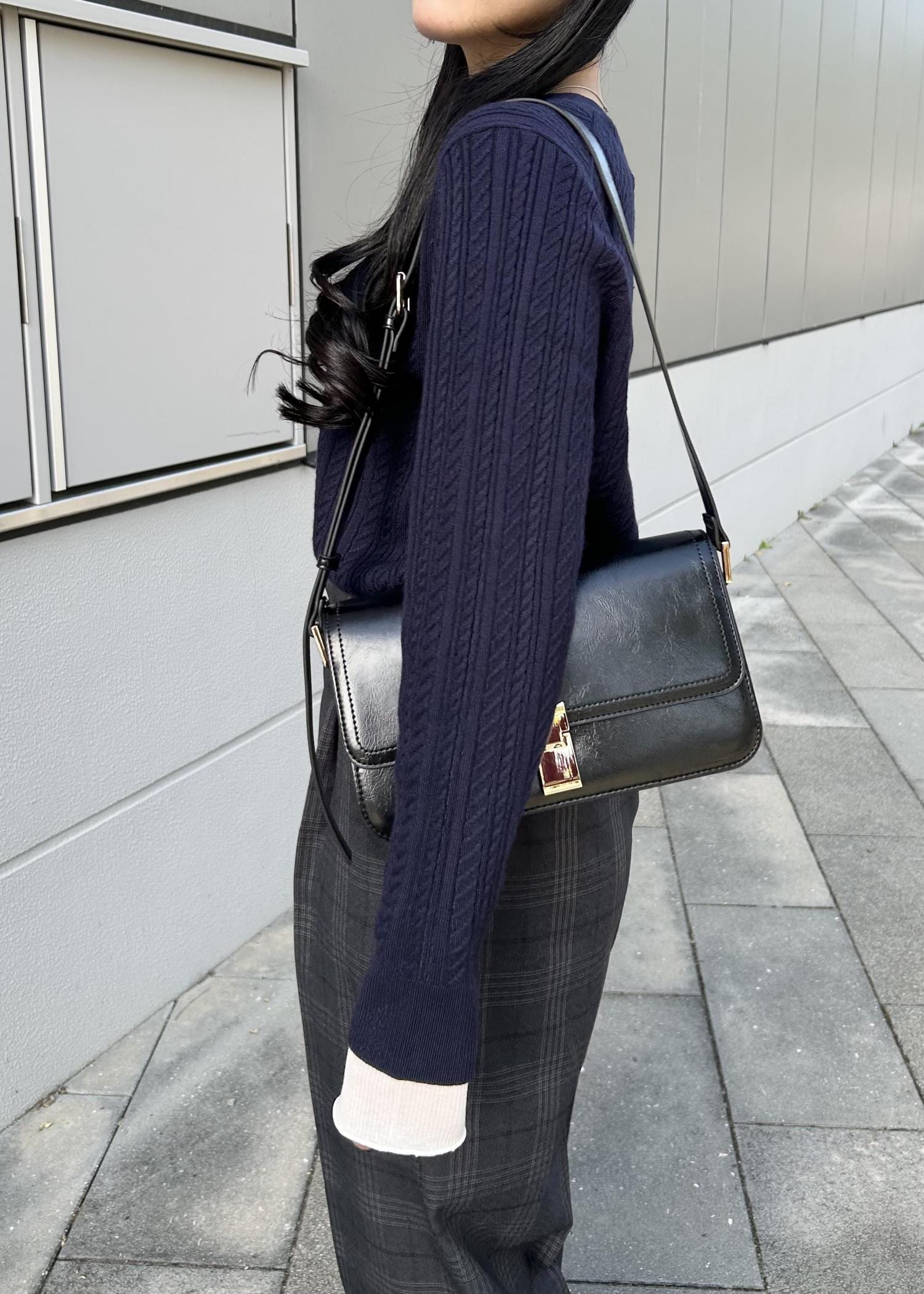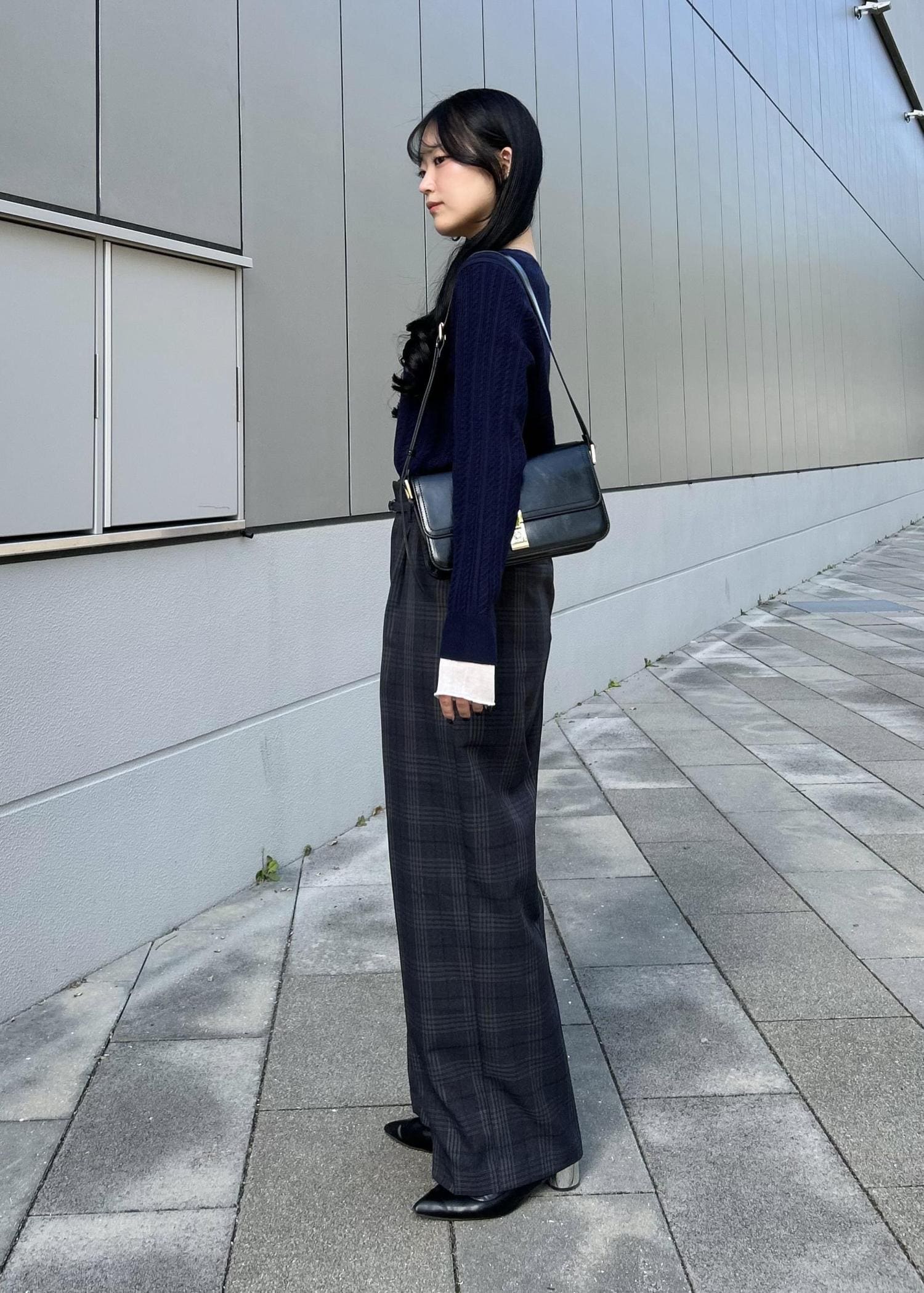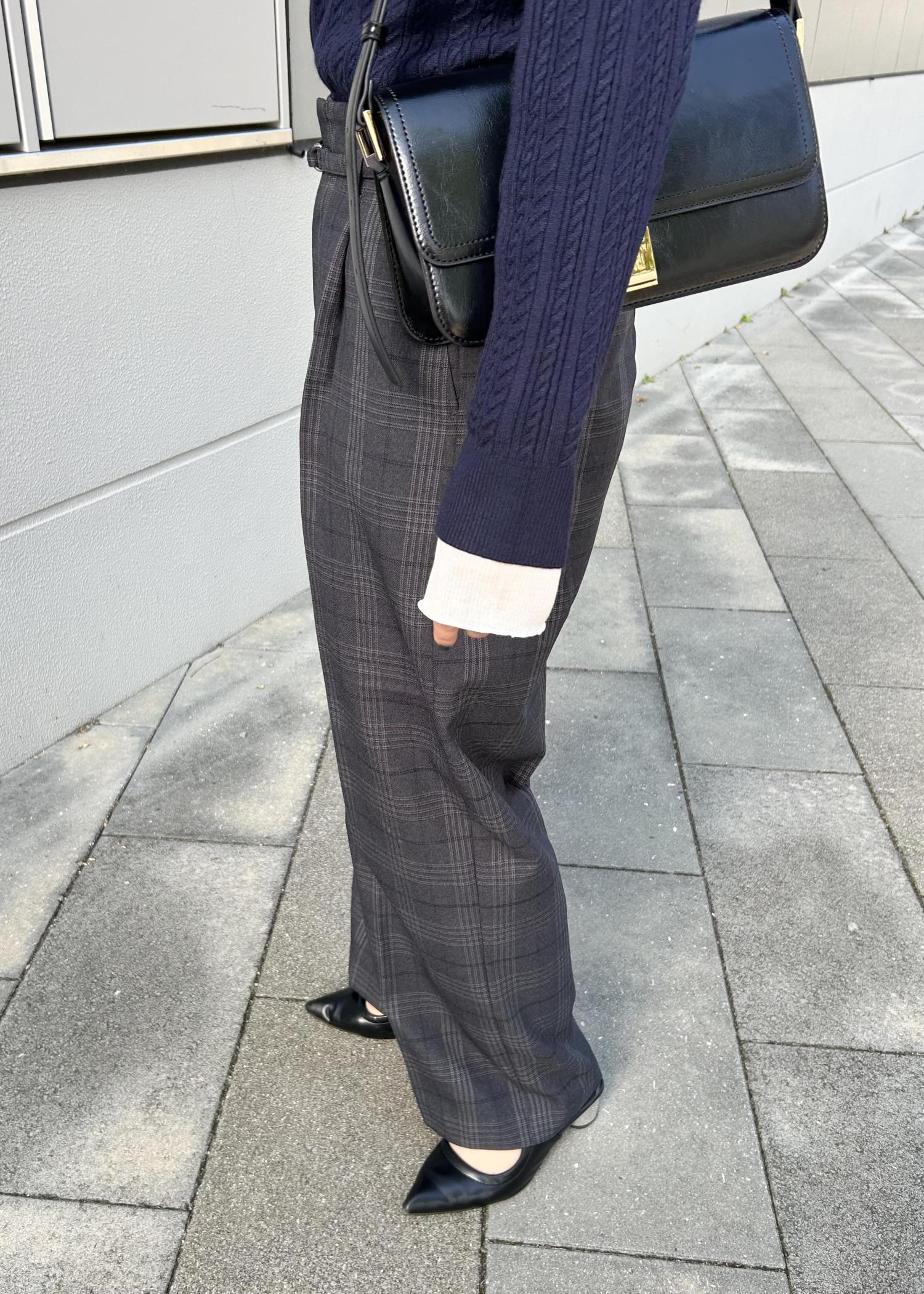 ネイビーのカーディガンにチェック柄のワイドパンツを合わせた、少しトラッドな雰囲気のコーデ。